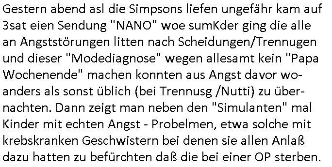 Gestern abend asl die Simpsons liefen ungefähr kam auf 3sat eien Sendung "NANO" woe sumKder ging die alle an Angststörungen litten nach Scheidungen/Trennugenund dieser "Modediagnose" wegen allesamt kein "Papa Wochenende" machen konnten aus Angst davor wo-anders als sonst üblich (bei Trennusg /Nutti) zu über-nachten. Dann zeigt man neben den "Simulanten" mal Kinder mit echten Angst - Probelmen, etwa solche mit krebskranken Geschwistern bei denen sie allen Anlaß dazu hatten zu befürchten daß die bei einer OP sterben.
