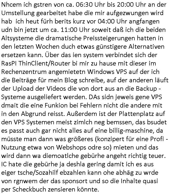 Nhcem ich gstren von ca. 06:30 Uhr bis 20:00 Uhr an der Umstellung gearbeitet habe die mir aufgezwungen wird hab ich heut fürh berits kurz vor 04:00 Uhr angfangen udn bin jetzt um ca. 11:00 Uhr soweit daß ich die beiden Altsysteme die dramatische Preissteigerungen hatten in den letzten Wochen duch etwas günstigere Alternativen ersetzen kann. Über das ien system verbindet sich der RasPI ThinClient/Router bi mir zu hause mit dieser im Rechenzentrum angemietetn Windows VPS auf der ich die Beiträge für mein Blog schreibe, auf der anderen läuft der Upload der Videos die von dort aus an die Backup - Systeme ausgeliefert werden. DAs sidn jeweis gene VPS dmait die eine Funkion bei Fehlern nicht die andere mit in den Abgrund reisst. Außerdem ist der Plattenplatz auf den VPS Systemen meist zimlch neg bemssen, das bsudet es passt auch gar nicht alles auf eine billig-maschine, da müsste man dann was größeres (konzipert für eine Profi - Nutzung etwa von Webshops odre so) mieten und das wird dann wa diemoatlche gebürhe angeht richtig teuer. IC hate die gebürhe ja deshla gering damit ich es aus eiger tsche/Sozahilf ebzahlen kann ohe abhäg zu wrde von rgnwem der das sponsort und so die Inhalte quasi per Scheckbuch zensieren könnte.