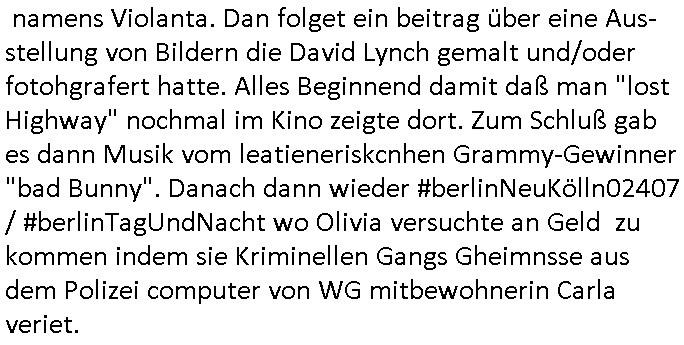 namens Violanta. Dan folget ein beitrag über eine Aus-stellung von Bildern die David Lynch gemalt und/oder fotohgrafert hatte. Alles Beginnend damit daß man "lost Highway" nochmal im Kino zeigte dort. Zum Schluß gab es dann Musik vom leatieneriskcnhen Grammy-Gewinner "bad Bunny". Danach dann wieder #berlinNeuKölln02407 / #berlinTagUndNacht wo Olivia versuchte an Geld zu kommen indem sie Kriminellen Gangs Gheimnsse aus dem Polizei computer von WG mitbewohnerin Carla veriet.