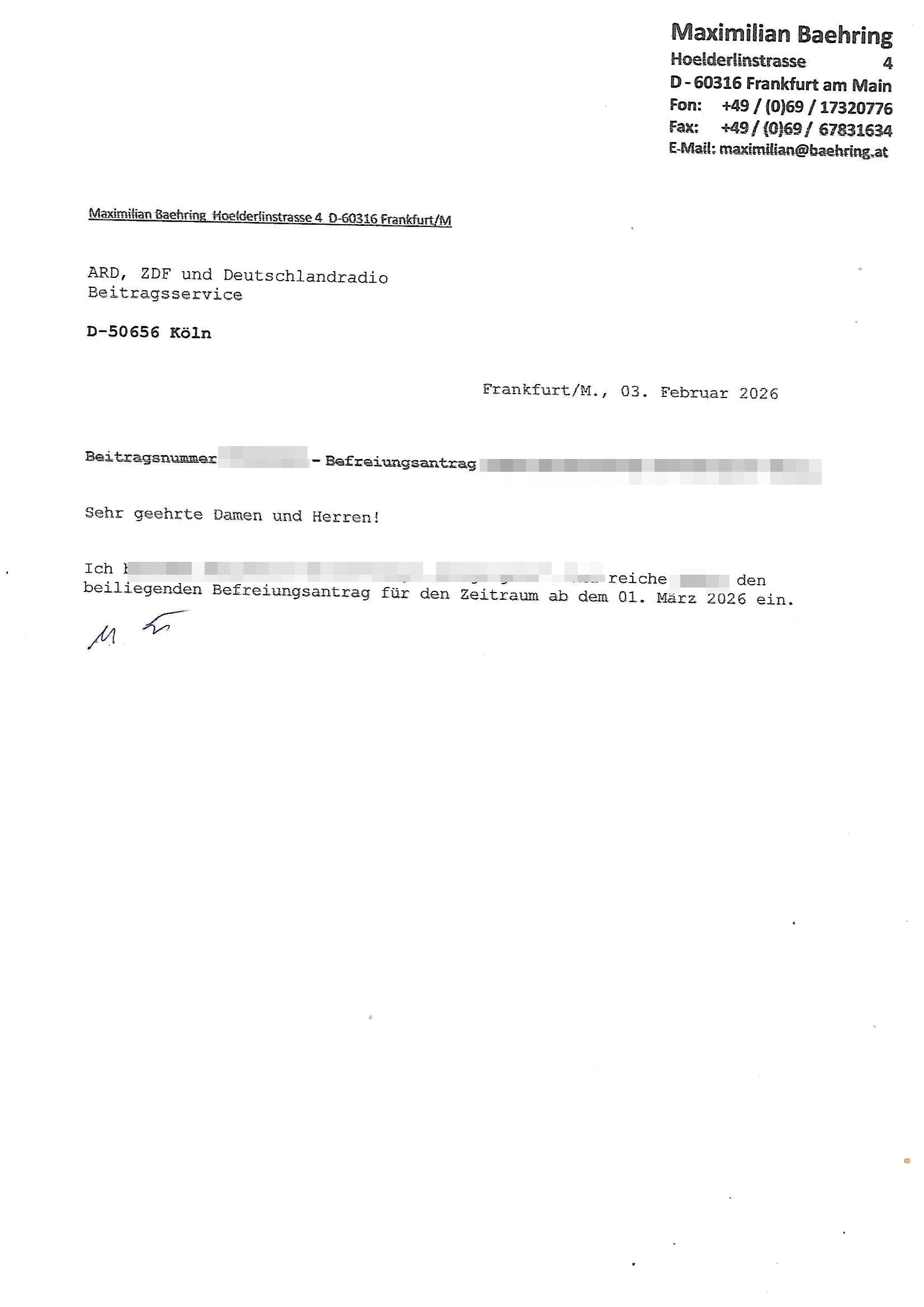Ich *** reiche *** den beiliegenden Befreiungsantrag für den Zeitraum ab dem 01. März 2026 ein.