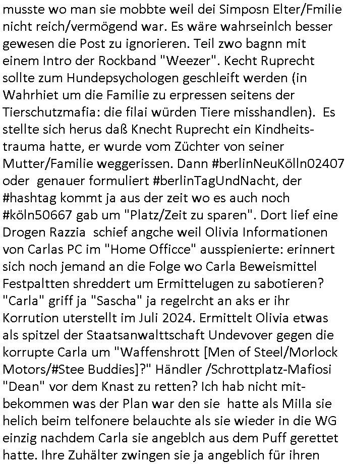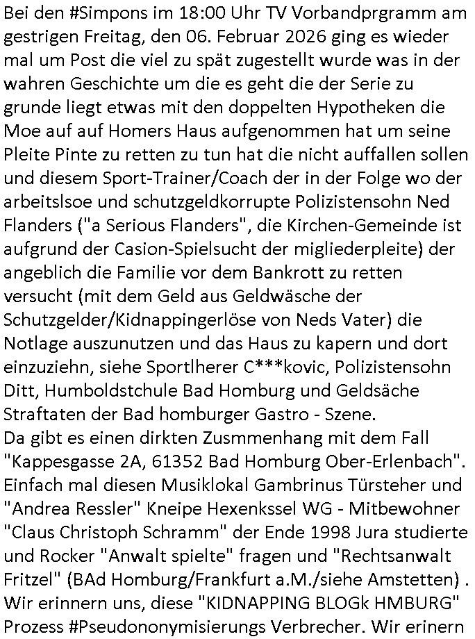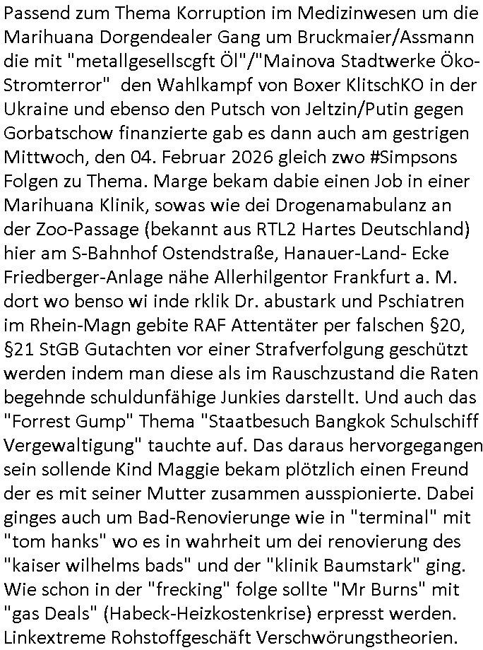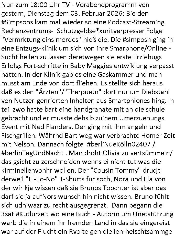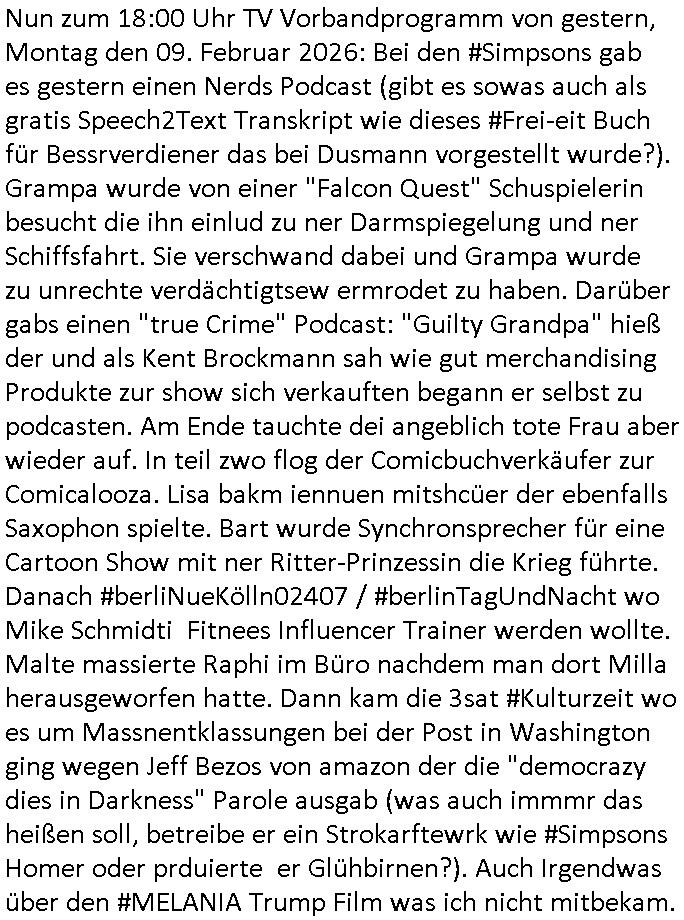 Nun aber erstmal zum 18:00 Uhr TV - Vorabenprogramm von egstren, Montag dem 02. Februar 2026, ca 18:00 Uhr Bei den #Simpsons ging es um eine Crypto - Währung die nach ihrem Erfinder Professor Fringe "Frinkcoin" benannt war un von Lisa "geekeckt" wurde. In Teil zwo ging es um um nen Film einer Fortsetzungsreihe welchen der Haupt-Darsteler noch vor der Kinopremiere bettlägrgen kranken Kindern vorab zeigte, darunter Milhouse der aber mit Bart ver-wechselt wurde. So wurd bart zum "Spoiler Boy". Weil er drohte den Inhalt des films noch vor der Premiere zu verraten enführten ihn Hollywoods Rechteverwerter kurzehand und schüchterten ihn mit psychoterror massiv ein in einem V(irutelle-n)R(ealität) - Fake - Universum. Dann #erliNuekölln02407 / #berliTagUndNacht wo Olivia von ihrem Ex-Freund erpresst wird angsclhe - sie soll ihm 100.000 Euro bschaffen. Mike der das "möllers" schließen muste hat derweil einen Pobe -abristag Tag in einer Bar. Dann kam die 3sat #Kulturzeit, es ging um die Verleihung des Preises "Grammy" bei wlchem Kirti geäußert wurde an der angelchen Abschiebepolizei "ICE". Danach gab es jede Menge Kritik an Trump. Anshließend wurde eien art Musktehter gezugt aus der sttaoper hambugr "Mosters Paradise" mit Godzilla und nem "Riesenbaby" Herrscher. Danch ging es darum daß eine Pantone Farbe "klaud" zur Farbe des Jahres oder sowasgeähtl wurde. Dann irgend-welches Karnevals Theater in Venedig. Und eine Oper