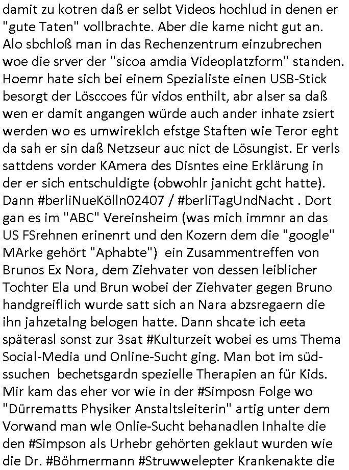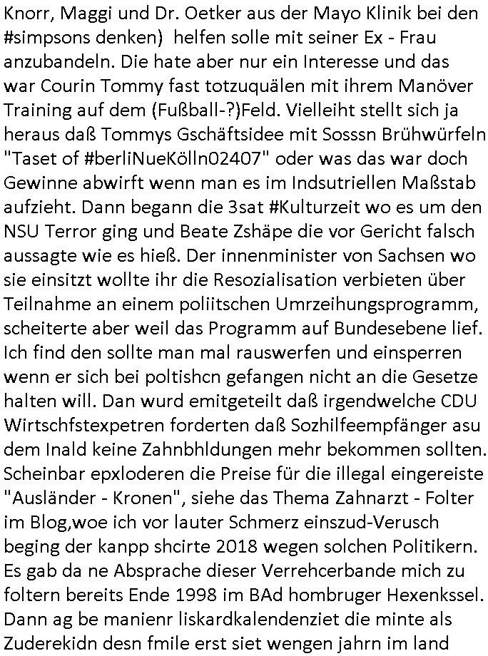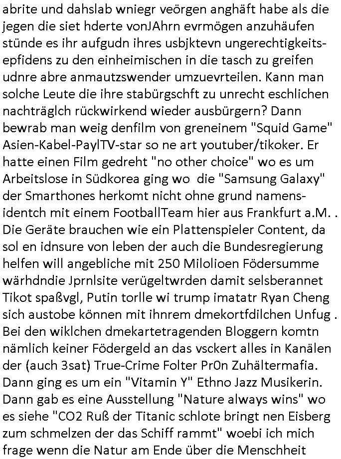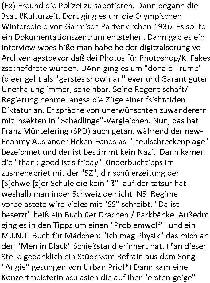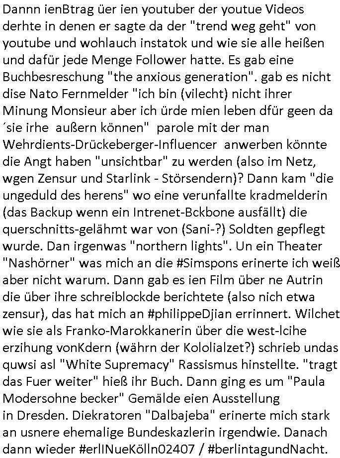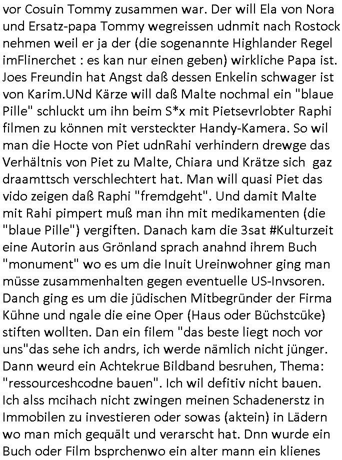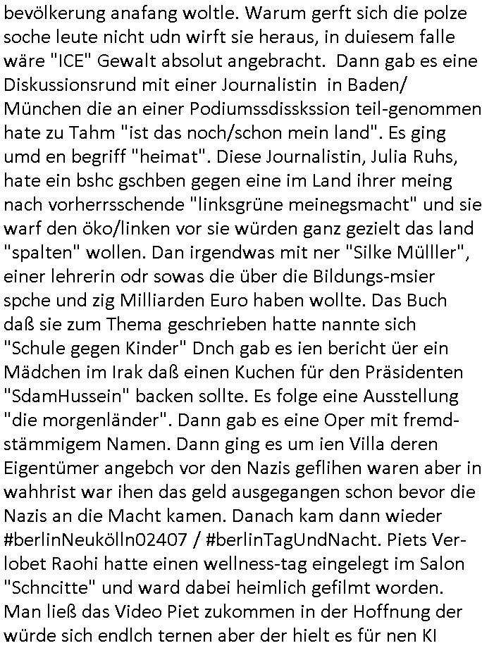 bevölkerung anafang woltle. Warum gerft sich die polze soche leute nicht udn wirft sie heraus, in duiesem falle wäre "ICE" Gewalt absolut angebracht. Dann gab es eine Diskussionsrund mit einer Journalistin in Baden/München die an einer Podiumssdisskssion teil-genommen hate zu Tahm "ist das noch/schon mein land". Es ging umd en begriff "heimat". Diese Journalistin, Julia Ruhs, hate ein bshc gschben gegen eine im Land ihrer meing nach vorherrsschende "linksgrüne meinegsmacht" und sie warf den öko/linken vor sie würden ganz gezielt das land "spalten" wollen. Dan irgendwas mit ner "Silke Mülller", einer lehrerin odr sowas die über die Bildungs-msier spche und zig Milliarden Euro haben wollte. Das Buch daß sie zum Thema geschrieben hatte nannte sich "Schule gegen Kinder" Dnch gab es ien bericht üer ein Mädchen im Irak daß einen Kuchen für den Präsidenten "SdamHussein" backen sollte. Es folge eine Ausstellung "die morgenländer". Dann gab es eine Oper mit fremd-stämmigem Namen. Dann ging es um ien Villa deren Eigentümer angebch vor den Nazis geflihen waren aber in wahhrist war ihen das geld ausgegangen schon bevor die Nazis an die Macht kamen. Danach kam dann wieder #berlinNeukölln02407 / #berlinTagUndNacht. Piets Ver-lobet Raohi hatte einen wellness-tag eingelegt im Salon "Schncitte" und ward dabei heimlich gefilmt worden. Man ließ das Video Piet zukommen in der Hoffnung der würde sich endlch ternen aber der hielt es für nen KI