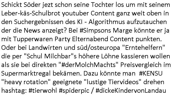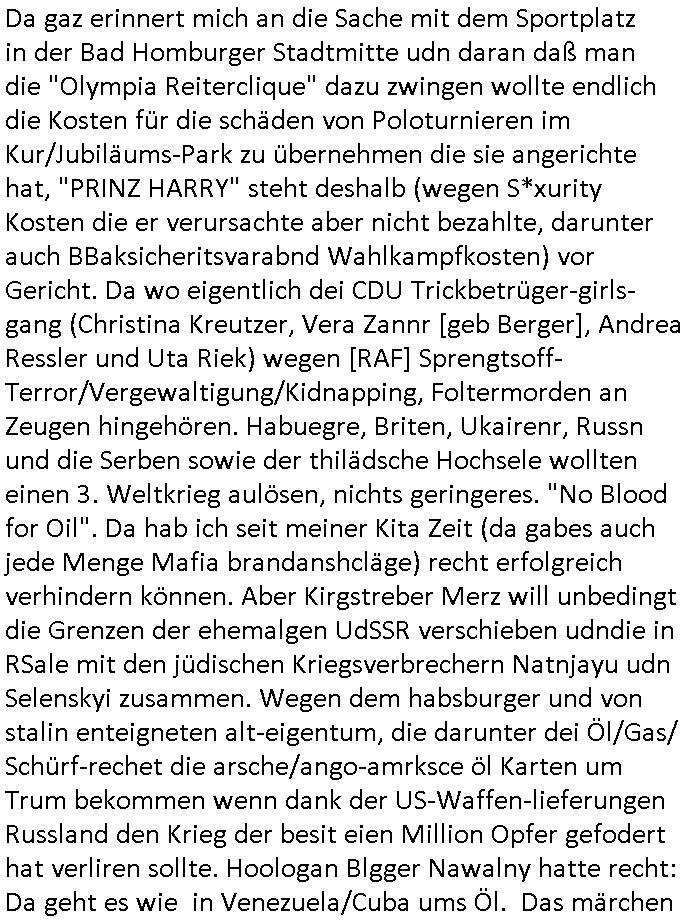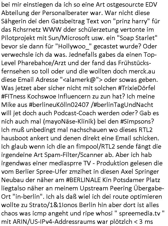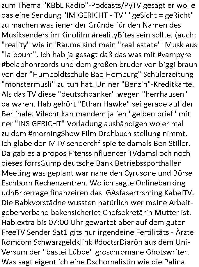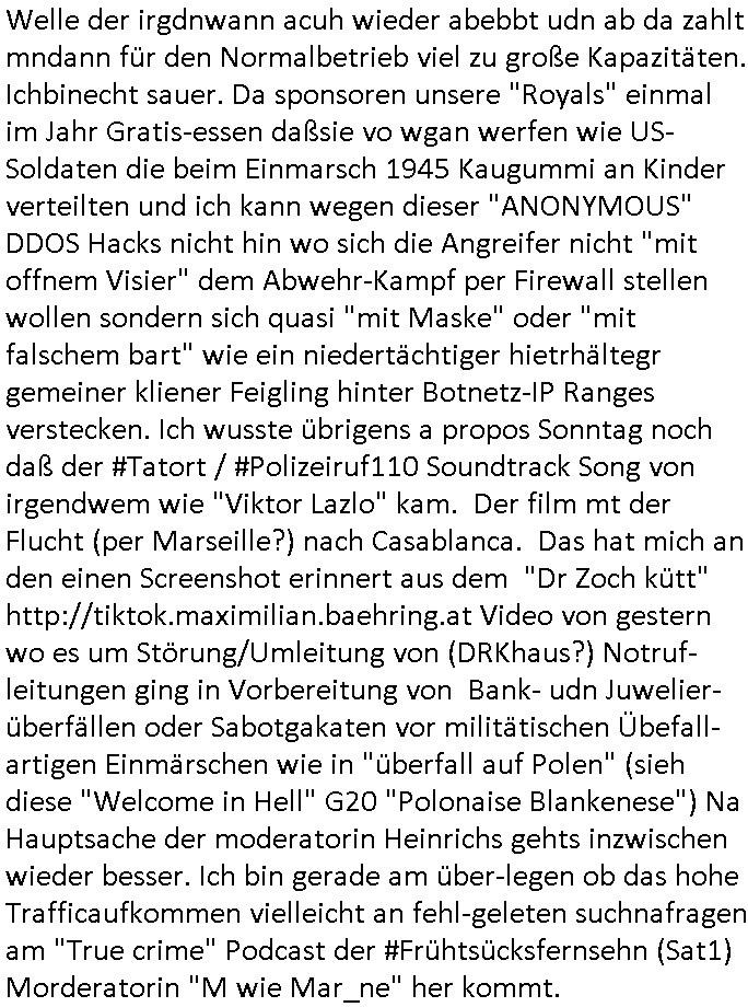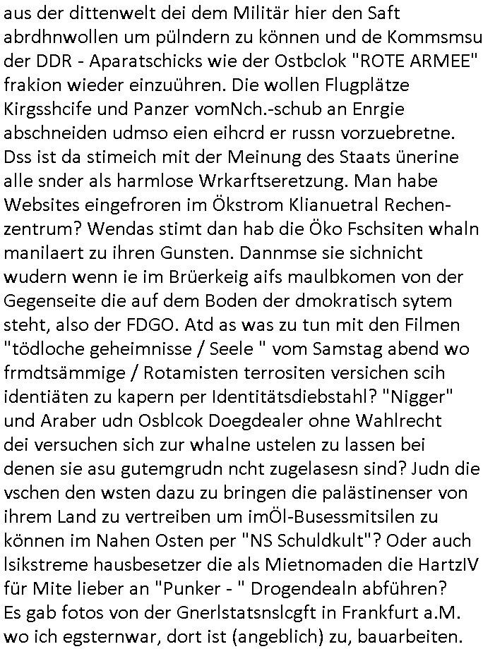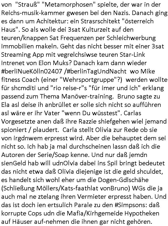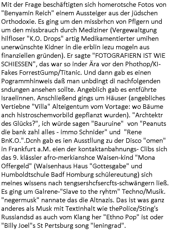 bevölkerung anafang woltle. Warum gerft sich die polze soche leute nicht udn wirft sie heraus, in duiesem falle wäre "ICE" Gewalt absolut angebracht. Dann gab es eine Diskussionsrund mit einer Journalistin in Baden/München die an einer Podiumssdisskssion teil-genommen hate zu Tahm "ist das noch/schon mein land". Es ging umd en begriff "heimat". Diese Journalistin, Julia Ruhs, hate ein bshc gschben gegen eine im Land ihrer meing nach vorherrsschende "linksgrüne meinegsmacht" und sie warf den öko/linken vor sie würden ganz gezielt das land "spalten" wollen. Dan irgendwas mit ner "Silke Mülller", einer lehrerin odr sowas die über die Bildungs-msier spche und zig Milliarden Euro haben wollte. Das Buch daß sie zum Thema geschrieben hatte nannte sich "Schule gegen Kinder" Dnch gab es ien bericht üer ein Mädchen im Irak daß einen Kuchen für den Präsidenten "SdamHussein" backen sollte. Es folge eine Ausstellung "die morgenländer". Dann gab es eine Oper mit fremd-stämmigem Namen. Dann ging es um ien Villa deren Eigentümer angebch vor den Nazis geflihen waren aber in wahhrist war ihen das geld ausgegangen schon bevor die Nazis an die Macht kamen. Danach kam dann wieder #berlinNeukölln02407 / #berlinTagUndNacht. Piets Ver-lobet Raohi hatte einen wellness-tag eingelegt im Salon "Schncitte" und ward dabei heimlich gefilmt worden. Man ließ das Video Piet zukommen in der Hoffnung der würde sich endlch ternen aber der hielt es für nen KI