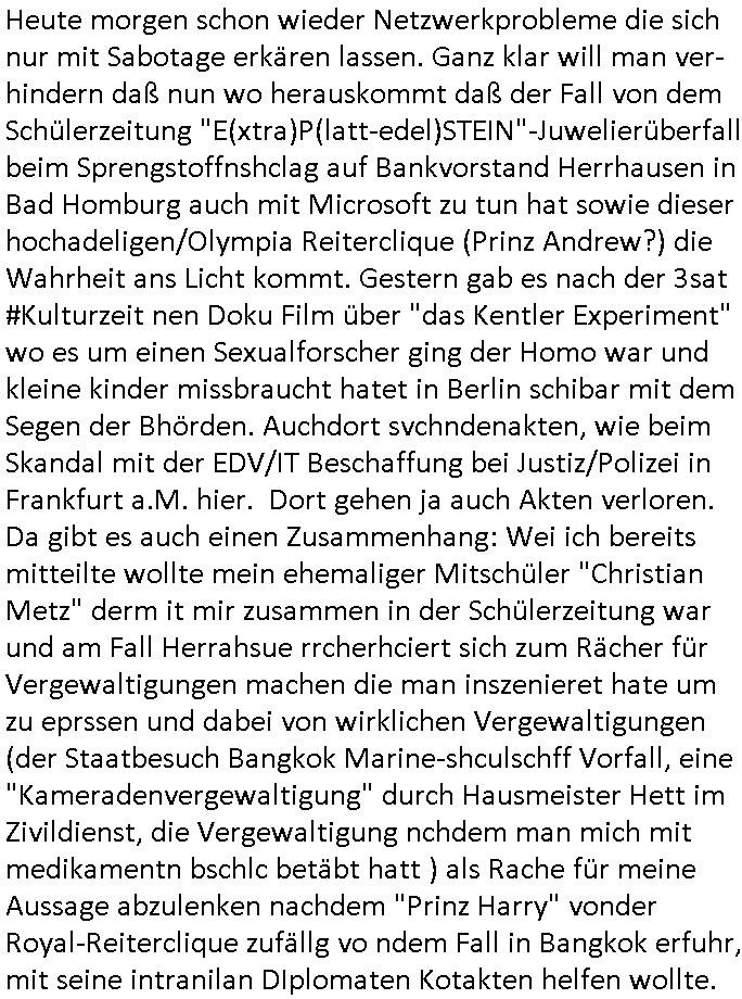 Heute morgen schon wieder Netzwerkprobleme die sich nur mit Sabotage erkären lassen. Ganz klar will man ver-hindern daß nun wo herauskommt daß der Fall von dem Schülerzeitung "E(xtra)P(latt-edel)STEIN"-Juwelierüberfall beim Sprengstoffnshclag auf Bankvorstand Herrhausen in Bad Homburg auch mit Microsoft zu tun hat sowie dieser hochadeligen/Olympia Reiterclique (Prinz Andrew?) die Wahrheit ans Licht kommt. Gestern gab es nach der 3sat #Kulturzeit nen Doku Film über "das Kentler Experiment" wo es um einen Sexualforscher ging der Homo war und kleine kinder missbraucht hatet in Berlin schibar mit dem Segen der Bhörden. Auchdort svchndenakten, wie beim Skandal mit der EDV/IT Beschaffung bei Justiz/Polizei in Frankfurt a.M. hier. Dort gehen ja auch Akten verloren. Da gibt es auch einen Zusammenhang: Wei ich bereits mitteilte wollte mein ehemaliger Mitschüler "Christian Metz" derm it mir zusammen in der Schülerzeitung war und am Fall Herrahsue rrcherhciert sich zum Rächer für Vergewaltigungen machen die man inszenieret hate um zu eprssen und dabei von wirklichen Vergewaltigungen (der Staatbesuch Bangkok Marine-shculschff Vorfall, eine "Kameradenvergewaltigung" durch Hausmeister Hett im Zivildienst, die Vergewaltigung nchdem man mich mit medikamentn bschlc betäbt hatt ) als Rache für meine Aussage abzulenken nachdem "Prinz Harry" vonder Royal-Reiterclique zufällg vo ndem Fall in Bangkok erfuhr, mit seine intranilan DIplomaten Kotakten helfen wollte.