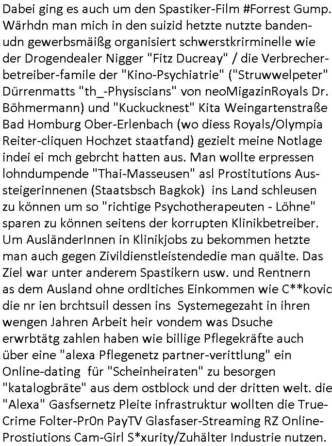 Dabei ging es auch um den Spastiker-Film #Forrest Gump. Wärhdn man mich in den suizid hetzte nutzte banden- udn gewerbsmäißg organisiert schwerstkrirminelle wie der Drogendealer Nigger "Fitz Ducreay" / die Verbrecher- betreiber-famile der "Kino-Psychiatrie" ("Struwwelpeter" Dürrenmatts "th_-Physiscians" von neoMigazinRoyals Dr. Böhmermann) und "Kuckucknest" Kita Weingartenstraße Bad Homburg Ober-Erlenbach (wo diess Royals/Olympia Reiter-cliquen Hochzet staatfand) gezielt meine Notlage indei ei mch gebrcht hatten aus. Man wollte erpressen lohndumpende "Thai-Masseusen" asl Prostitutions Aus-steigerinnenen (Staatsbsch Bagkok) ins Land schleusen zu können um so "richtige Psychotherapeuten - Löhne" sparen zu können seitens der korrupten Klinikbetreiber. Um AusländerInnen in Klinikjobs zu bekommen hetzte man auch gegen Zivildienstleistendedie man quälte. Das Ziel war unter anderem Spastikern usw. und Rentnern as dem Ausland ohne ordltiches Einkommen wie C**kovic die nr ien brchtsuil dessen ins Systemegezaht in ihren wengen Jahren Arbeit heir vondem was Dsuche erwrbtätg zahlen haben wie billige Pflegekräfte auch über eine "alexa Pflegenetz partner-verittlung" ein Online-dating für "Scheinheiraten" zu besorgen "katalogbräte" aus dem ostblock und der dritten welt. die "Alexa" Gasfsernetz Pleite infrastruktur wollten die True-Crime Folter-Pr0n PayTV Glasfaser-Streaming RZ Online-Prostiutions Cam-Girl S*xurity/Zuhälter Industrie nutzen.