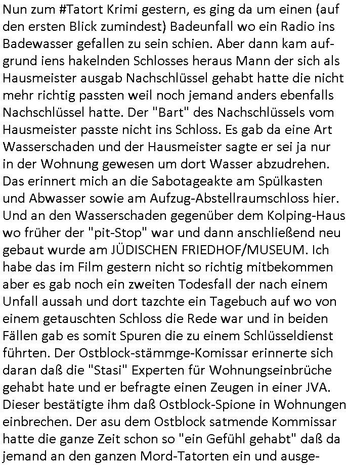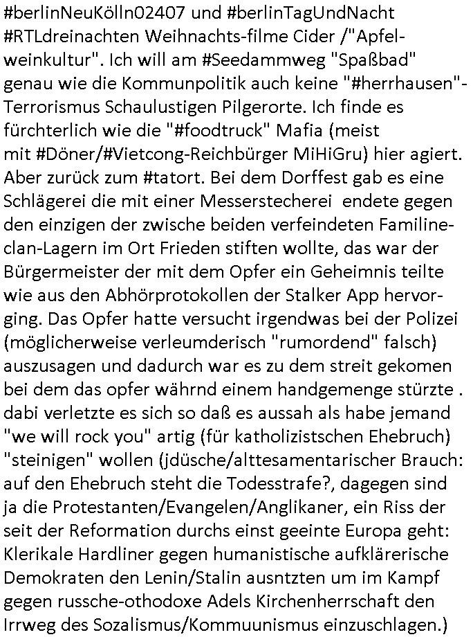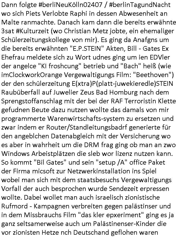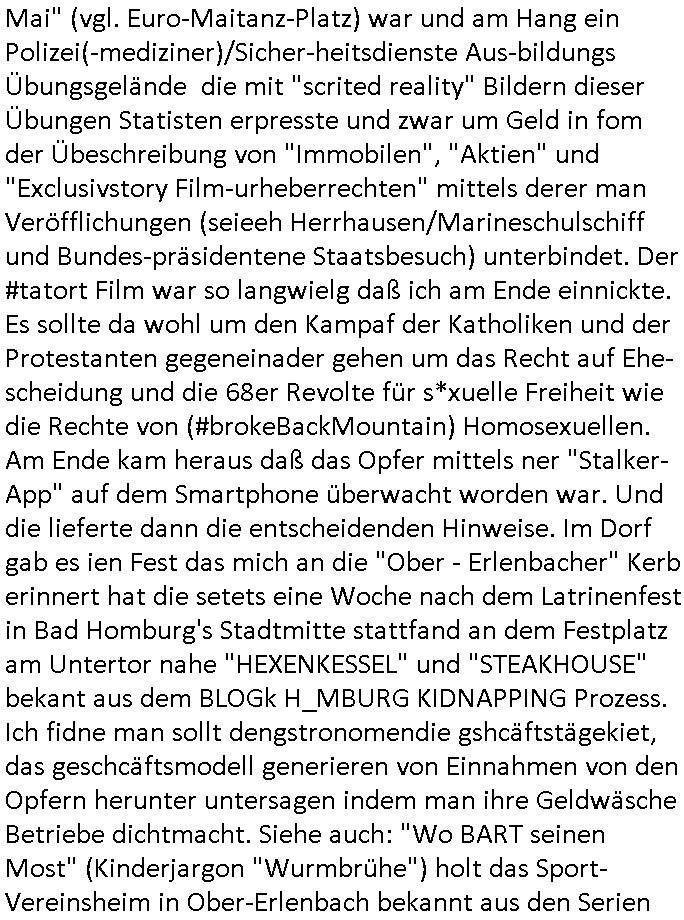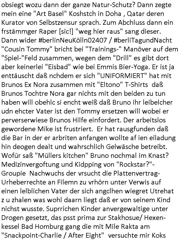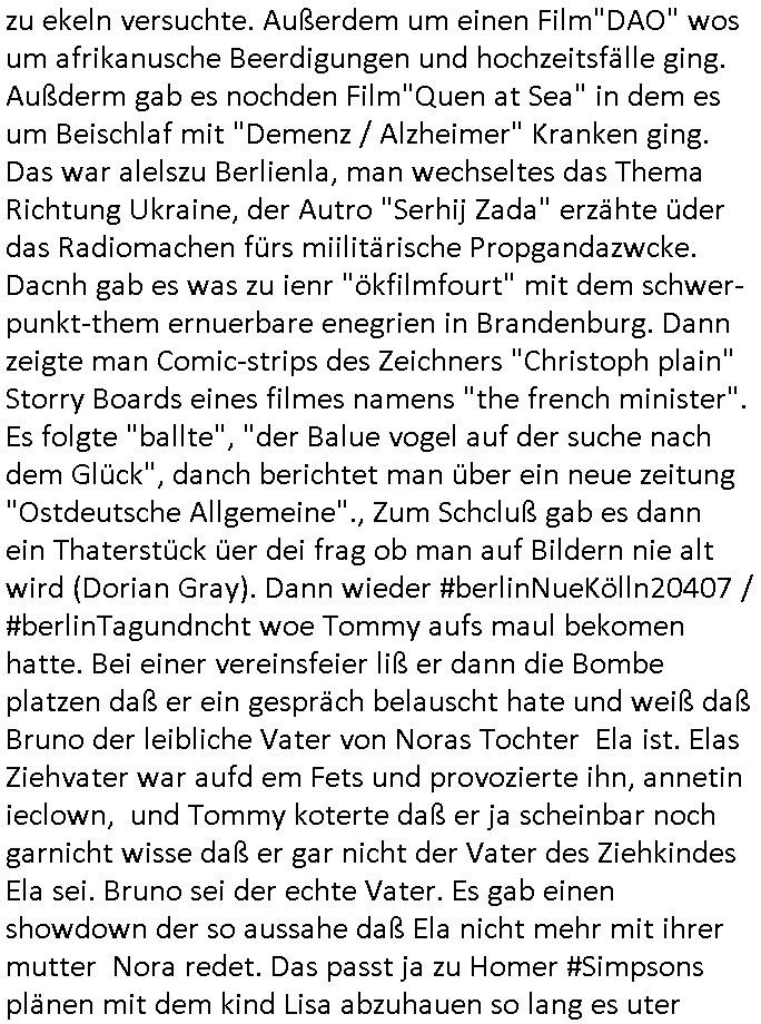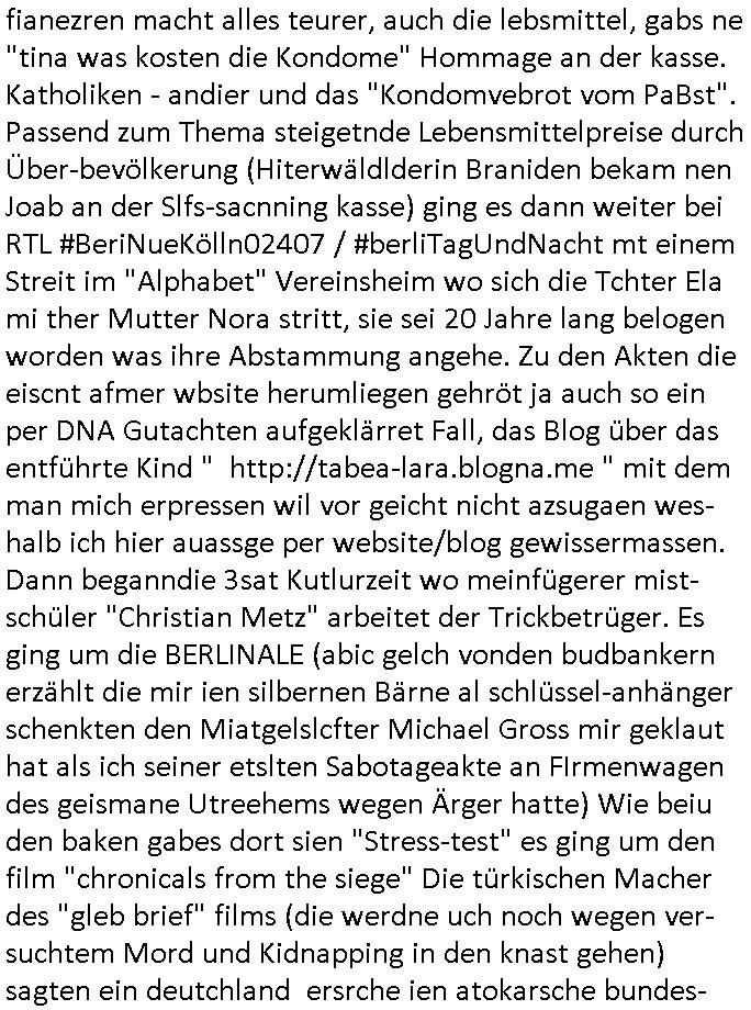 fianezren macht alles teurer, auch die lebsmittel, gabs ne "tina was kosten die Kondome" Hommage an der kasse. Katholiken - andier und das "Kondomvebrot vom PaBst". Passend zum Thema steigetnde Lebensmittelpreise durch Über-bevölkerung (Hiterwäldlderin Braniden bekam nen Joab an der Slfs-sacnning kasse) ging es dann weiter bei RTL #BeriNueKölln02407 / #berliTagUndNacht mt einem Streit im "Alphabet" Vereinsheim wo sich die Tchter Ela mi ther Mutter Nora stritt, sie sei 20 Jahre lang belogen worden was ihre Abstammung angehe. Zu den Akten die eiscnt afmer wbsite herumliegen gehröt ja auch so ein per DNA Gutachten aufgeklärret Fall, das Blog über das entführte Kind " http://tabea-lara.blogna.me " mit dem man mich erpressen wil vor geicht nicht azsugaen wes- halb ich hier auassge per website/blog gewissermassen. Dann beganndie 3sat Kutlurzeit wo meinfügerer mist-schüler "Christian Metz" arbeitet der Trickbetrüger. Es ging um die BERLINALE (abic gelch vonden budbankern erzählt die mir ien silbernen Bärne al schlüssel-anhänger schenkten den Miatgelslcfter Michael Gross mir geklaut hat als ich seiner etslten Sabotageakte an FIrmenwagen des geismane Utreehems wegen Ärger hatte) Wie beiu den baken gabes dort sien "Stress-test" es ging um den film "chronicals from the siege" Die türkischen Macher des "gleb brief" films (die werdne uch noch wegen ver-suchtem Mord und Kidnapping in den knast gehen) sagten ein deutchland ersrche ien atokarsche bundes-