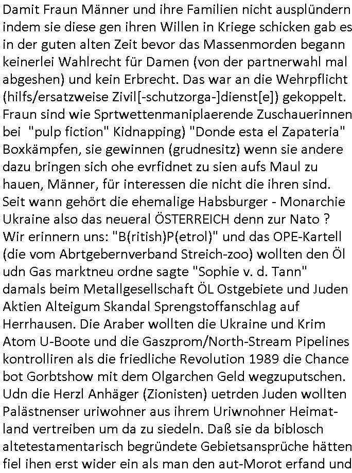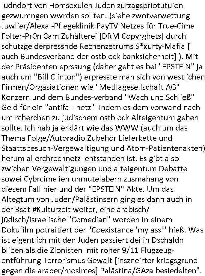 rgeireung? Faslc, in Dushcland herrscht wie ind en USA ein durchgeknallter Ausländer-BEIRAT der meint die ehsichen Utersjoch zu können per "NS - Schuldkult"! "Tom Tykwer" beschwerte sich wieder. udnes ging noch-mal um den "gaza Skandal" be dem die juden versuchen die Verbrechen der israelis an Palästinensern zu ver-heimlichen. Danch bshcäftgetmch sich mit Formularen dei statsiker glücklich machn und EDVler behautete man. Das ist Unfug. Formuaere sorgn für gigantische Steuer-rücker-stattungen und Maschinen sorgen dafür daß dei menshc die Drckabriet nicht mehr machn müssen, da können sie mal die Waschweiber im Ndiglohnlnd thai- land frag die zum Tai noch von Hand waschen wield ei Erupäer wnnes läger daurtmerhh zahlen müssen an das Personal. Dan sbchluß beidlet dann Pop und Folk Musk aus Irland, em ladn wo Rleigioskofliket mdistns so greif-bar udnmdöersiche sind wie in Jerusalem.. Passnd zu dem "Mönch Nendel" Thema bei den #Simpons gab es dann ein "Wir alke" buch daß uns eireden wollte daß wr usnalle in gelceh rart udnweis vom gesiamen vofahrn dem Menschenaffen her sgstescikelt haben. Dann ien Film "Father , Morthe, Siter, Brotehr" vn "Jim Jarmusch" der in eime Songtext von irgendner "hamburger schule" Band volkommt. "Dann wird man was man am msietn hasst,:Cineast" Es gab auch noch einen Buch - Thriller (erinerrt mich an auf die Fresse/den MOND GEFAllEN" "Ghetto Superstar" Mciah Jackson, der wolt doch mal