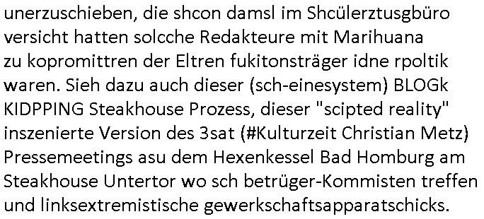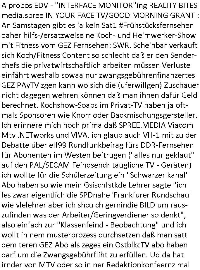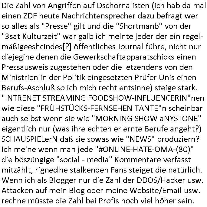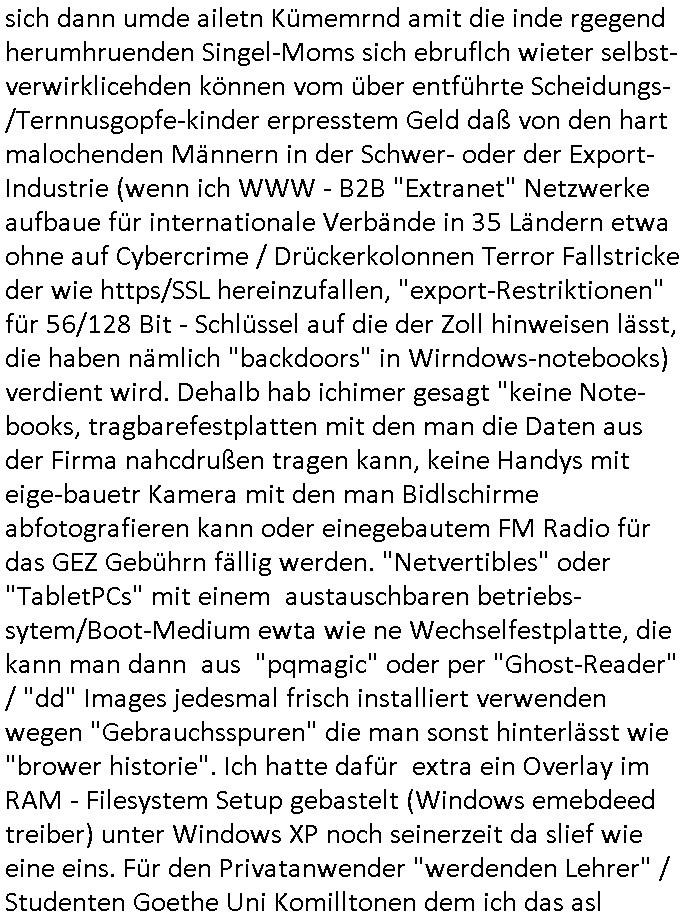 müsen weitrlaufn für die jusrte/emrittelr Presse NGOs. udn ich kan nicht auf Fremdfinanzierung zurüsgreifen, ich mußdas aus mienm HarzIVA/Lg2/bgergeld/gruscherung zahlen damit ch nabhäge belie währnd ich prozessiere. Die Webeisten um die es geht sind die auf denen man das was ich her gerade in den Rechner tippe dann lesen kann von überall in der Welt aus per Internte. Auch das "BLOG" habe ich erfunden, nicht nur das "WWW" .