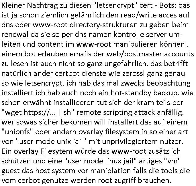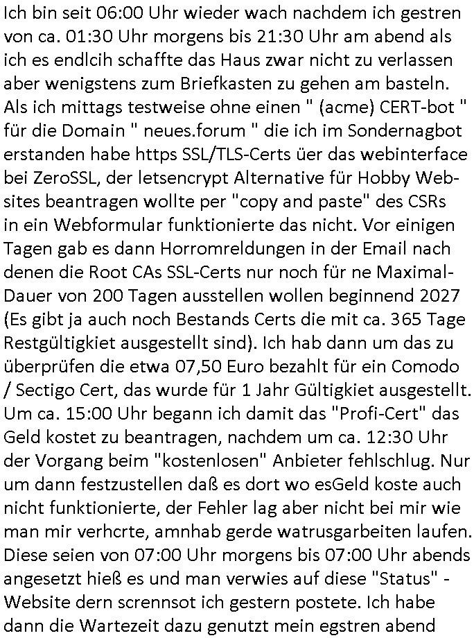 Die Blog Website hat heute an einigen der Server bedingt durch Umbau-arbeiten rspäter als sonst upgedated. Kei n Grund zur Sorger, alles im Griff. Ich exprimentiere gerade mit kostelsen letsencrypt SSL Certs an deren "ACME" Bot mir überhaupt nicht gefällt daß er sich ürber eine SHELL - SCRIPT PIPE installiert. (#curl httpX://.../script.sh | sh) so man der Anleitung folgt. Ich muß ja den einen der tiktok videoblog Server dessnehoster plötzlich drei mal so viele geld wollte wie vorher aufgeben weil der zu teuer wird. Und zum Hochladen meiner Videos gibt es ne Passwort also SSL geschützte Webinterface Lösung die bisher mit mit einem selbstgenrierten SSL-CERT auskam die ich im Zuge der umbauarbeiten testweis auf nem "letsencrypt" SSEL-Cert laufen lasse, ich spare mir dabei den Update/ Upload Bereich getrennt vom restlichen "tiktokt" Video-blog-Server zu in ner eigenen VPS zu siloeren so daß das SSL Cert auch TESTSWEISE für https satt http Zugriffe auf die normale Vvidoblg - Web-Seite genutzt werden kann . Ich war so damit beschäftigte das umzstelen heut morgen ab cam 04:00 Uhr daß ich inde rHektik ncht geshen hab daß da auch noch das "Screenshot" Blog-Update hing.