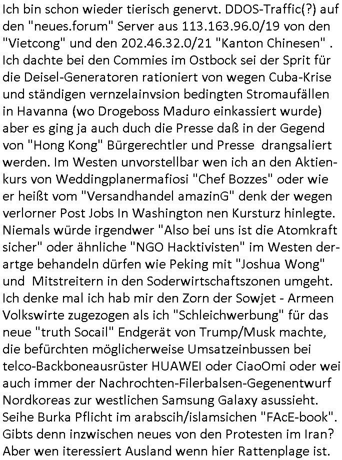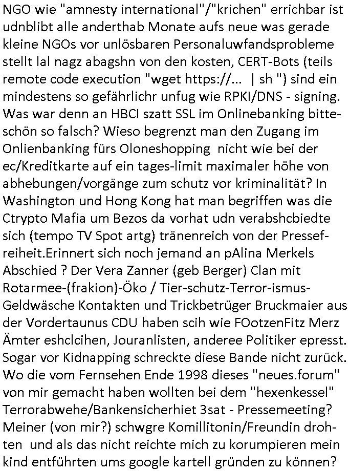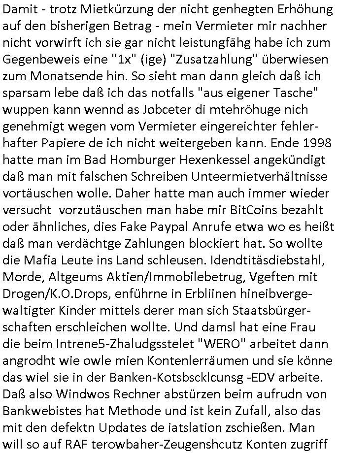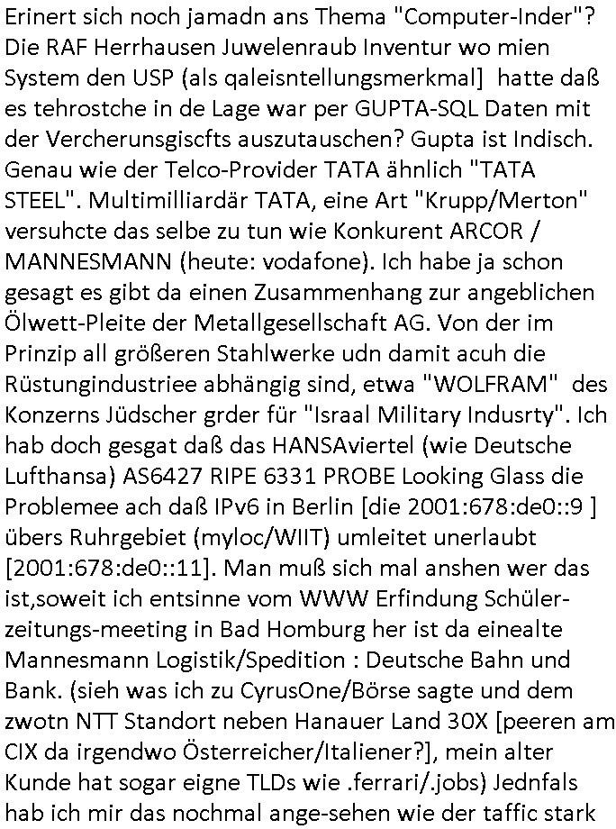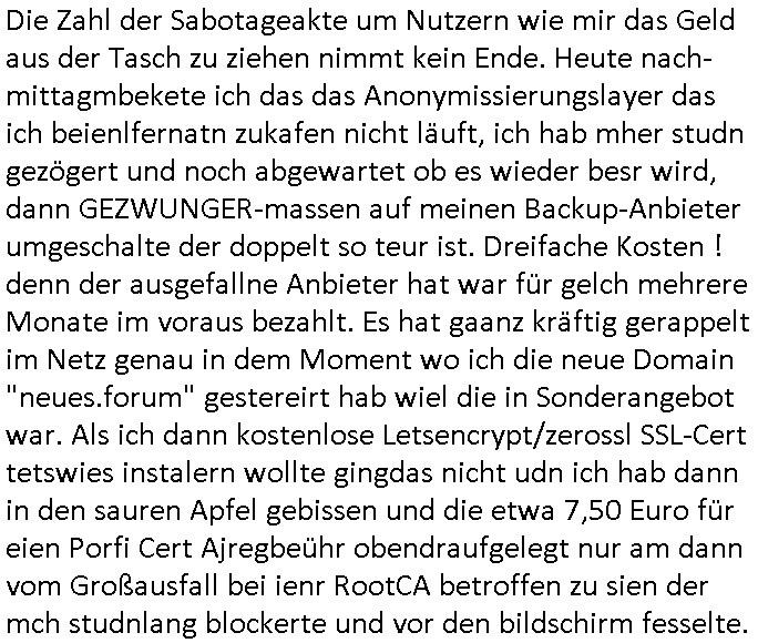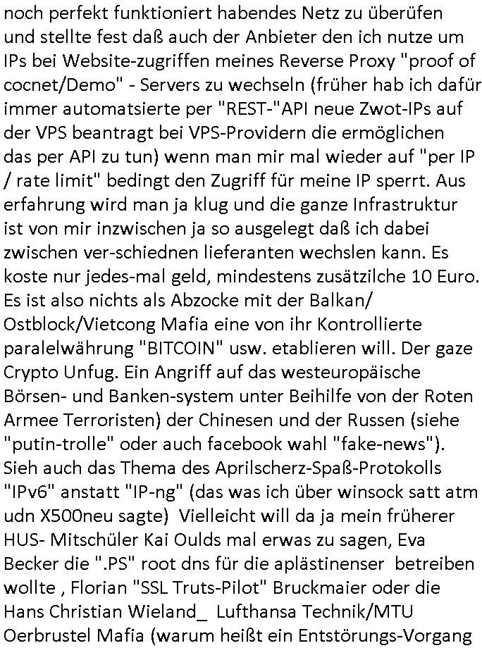 Um sicherzustelen daß ich ien gewissn zeitlichen Puffer habe wnen mal wieder ein Internat Zahlungsdinstleister Probleme macht versucht ich ja immer 14 Tage ode mehr im Voraus per "prepaid Gtahebn" zu zahlen so möglich. Udn das fühtd ann dazu daß wenn mal wieder einer der Billganbieter die ich zu nutze gzwugen bin wiel man mich fizeille ausgepüldert hat die Grätsche macht oder sien peis vedopeplt udn ähce späße beduet das dann meist daß Geld ds shcon "iebzahlt" wurde futsch ist. Das ist abe riemr noch besser als wenn diee "Metalgesellschaft Öl-optione Fake - Vollstreckungsbescheide - Mafia" versucht Prepaid-Guthaben "zu pfänden" obwohl sie dazu gar nicht berechtigt ist. Jedesmals wenn ich also gezwucgen bin Server umzuziehen wegen dem DDOS oder der fehelrhaften Windows-Updates der weil der Anbietr ARUBA den ich neun Jahr lang nutzte Frankfurt vrläßt und sich aufs kerngeschäft in Italien und Ungarn konzentreirt ksoet ichdas fürein verältnisse viel geld. Wenn etwa 10 Euro Prepaid Guthaben einfach mal nicht mehr genut werden können wieder Standort Frankfurt schließt istdas gensu äegrlchw ie wenn ichien voraus-bazahlten Server aus dem EZB-Proxy-Server "Cluster" hasuläsen uß weil ich des imensen raffcs plötzlichdopelt so vile RAM bauchwie bisher udnder bsherige prvider füUpagdes Modnpris afaraft udnich daher ien andern nutzen muß und teder iatstrukr umziehen. Alles verur-sacht durch (veuchte)DDOS/Hacks und Sabotage.