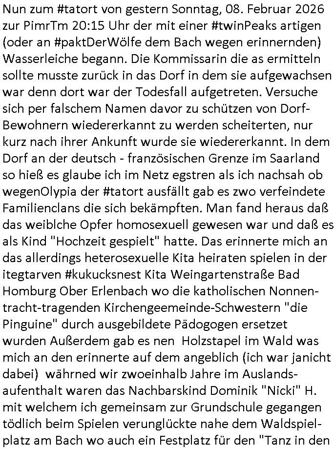 Nun aber zum #Tatort Krimi vom gestrigen Sonntag dem 01. Februar 2026 um 20:15 Uhr. Ich muß mir den dei tage nochmal ansehen wiel ich eingeschlafen bin so erschöpft war ich und dei Handlung zog sich in die länge, es war einfach nicht spannend genug. Es bagnn damit daß dei Polze grfuen wurde wiel man Wöfe gesichet hatte, das zwote mal schon und diesesmal gab es einen Wanderer oder sowas der scheinbar angegriffen worden war und getätet. Ganz in der nähe dort gab es eine Gruppe die Survival/Überlebenstrainings machte. DerkOmissar ferdet isch mit dem ienne mann, einem homosexuellen an udn über-chte bei ihm, es stellte sich heraus daß der so eine Art Bunker bewohnte, er war sowas wie ein "Prepper" also jemand der sich auf katastrophenfälle vorbereitet. Derweil fand die gerichtsmdeizin hersu deß der Tote gar nicht duch einen Wolf umgekommen war sondenr durch eine Hibe-waffe, die komssrain ermittelte bei der frau die Survival-Wanderungen anbot udn üerchte mit diser im Wald. Dabie file irh auf daß diese ien blutbeschmiertes Beil nutzte. Etw bis dahin hab ich den Film getsren gesehen.