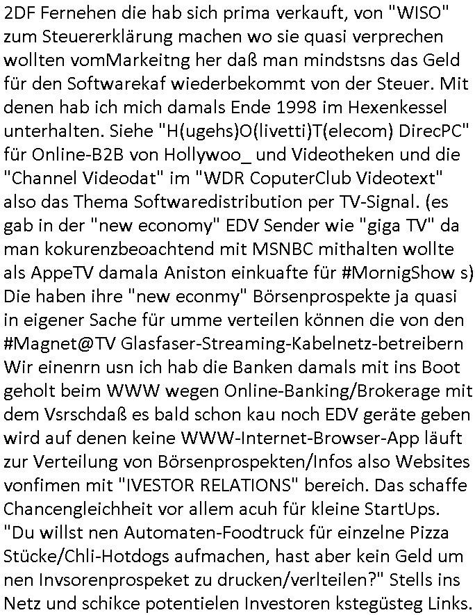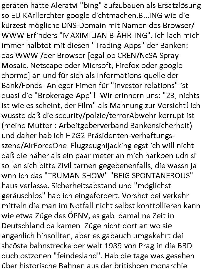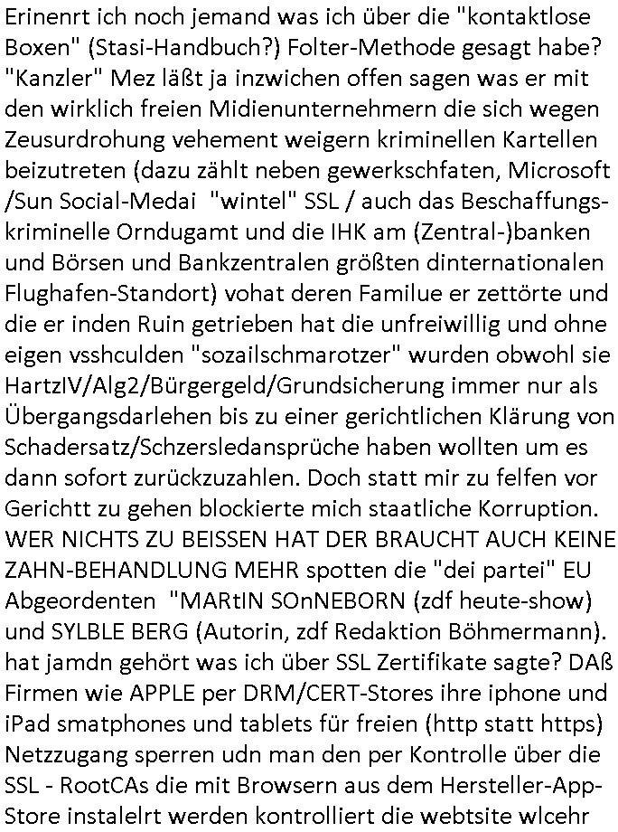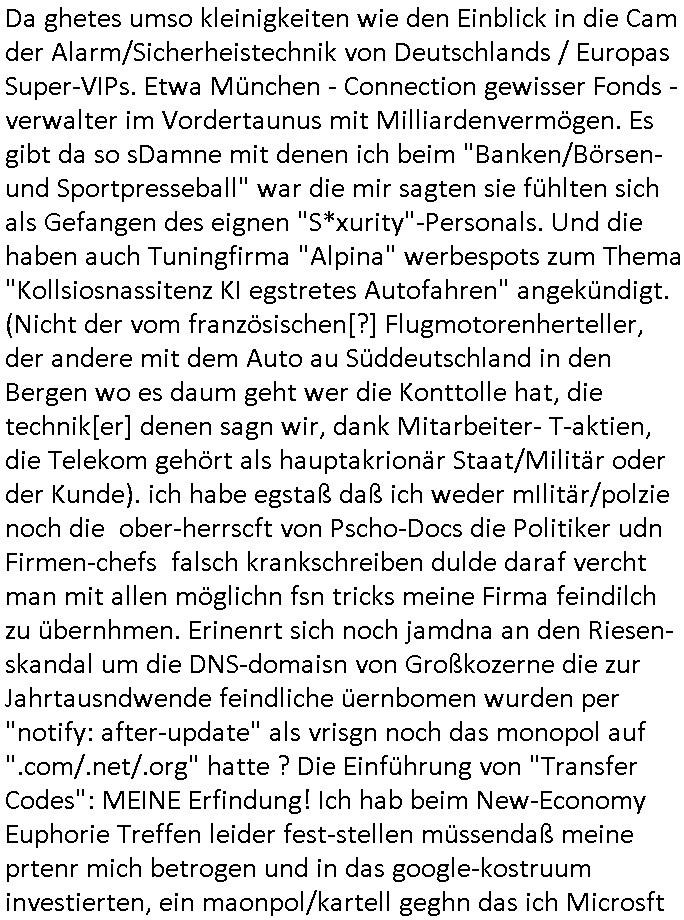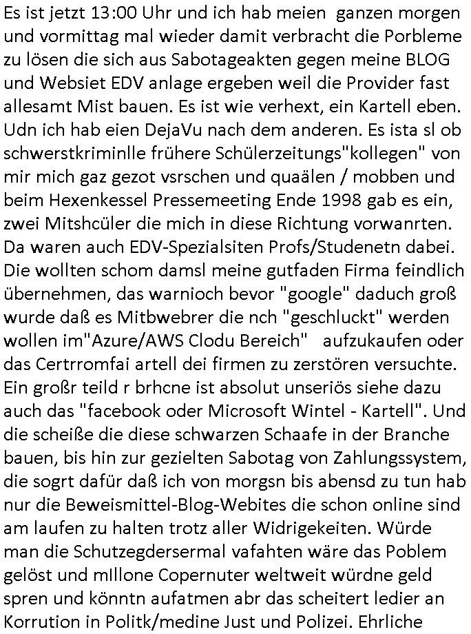 Es ist jetzt 13:00 Uhr und ich hab meien ganzen morgen und vormittag mal wieder damit verbracht die Porbleme zu lösen die sich aus Sabotageakten gegen meine BLOG und Websiet EDV anlage ergeben weil die Provider fast allesamt Mist bauen. Es ist wie verhext, ein Kartell eben. Udn ich hab eien DejaVu nach dem anderen. Es ista sl ob schwerstkriminlle frühere Schülerzeitungs"kollegen" von mir mich gaz gezot vsrschen und quaälen / mobben und beim Hexenkessel Pressemeeting Ende 1998 gab es ein, zwei Mitshcüler die mich in diese Richtung vorwanrten. Da waren auch EDV-Spezialsiten Profs/Studenetn dabei. Die wollten schom damsl meine gutfaden Firma feindlich übernehmen, das warnioch bevor "google" daduch groß wurde daß es Mitbwebrer die nch "geschluckt" werden wollen im"Azure/AWS Clodu Bereich" aufzukaufen oder das Certrromfai artell dei firmen zu zerstören versuchte. Ein großr teild r brhcne ist absolut unseriös siehe dazu auch das "facebook oder Microsoft Wintel - Kartell". Und die scheiße die diese schwarzen Schaafe in der Branche bauen, bis hin zur gezielten Sabotag von Zahlungssystem, die sogrt dafür daß ich von morgsn bis abensd zu tun hab nur die Beweismittel-Blog-Webites die schon online sind am laufen zu halten trotz aller Widrigekeiten. Würde man die Schutzegdersermal vafahten wäre das Poblem gelöst und mIllone Copernuter weltweit würdne geld spren und könntn aufatmen abr das scheitert ledier an Korrution in Politk/medine Just und Polizei. Ehrliche