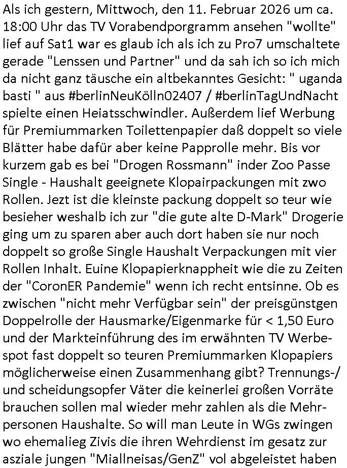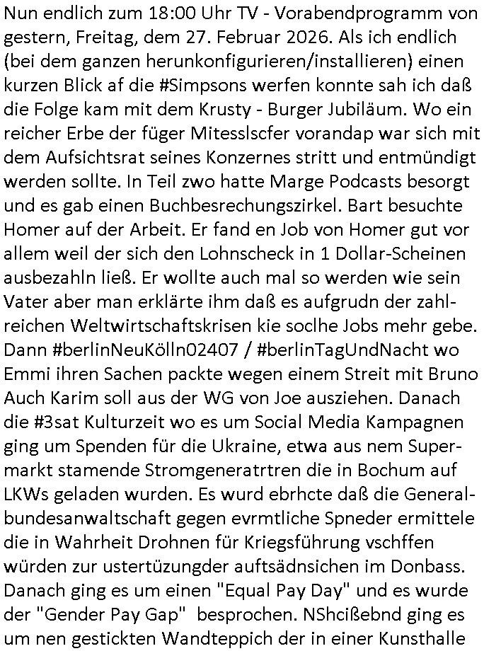 Nun endlich zum 18:00 Uhr TV - Vorabendprogramm von gestern, Freitag, dem 27. Februar 2026. Als ich endlich (bei dem ganzen herunkonfigurieren/installieren) einen kurzen Blick af die #Simpsons werfen konnte sah ich daß die Folge kam mit dem Krusty - Burger Jubiläum. Wo ein reicher Erbe der füger Mitesslscfer vorandap war sich mit dem Aufsichtsrat seines Konzernes stritt und entmündigt werden sollte. In Teil zwo hatte Marge Podcasts besorgt und es gab einen Buchbesrechungszirkel. Bart besuchte Homer auf der Arbeit. Er fand en Job von Homer gut vor allem weil der sich den Lohnscheck in 1 Dollar-Scheinen ausbezahln ließ. Er wollte auch mal so werden wie sein Vater aber man erklärte ihm daß es aufgrudn der zahl-reichen Weltwirtschaftskrisen kie soclhe Jobs mehr gebe. Dann #berlinNeuKölln02407 / #berlinTagUndNacht wo Emmi ihren Sachen packte wegen einem Streit mit Bruno Auch Karim soll aus der WG von Joe ausziehen. Danach die #3sat Kulturzeit wo es um Social Media Kampagnen ging um Spenden für die Ukraine, etwa aus nem Super-markt stamende Stromgeneratrtren die in Bochum auf LKWs geladen wurden. Es wurd ebrhcte daß die General- bundesanwaltschaft gegen evrmtliche Spneder ermittele die in Wahrheit Drohnen für Kriegsführung vschffen würden zur ustertüzungder auftsädnsichen im Donbass. Danach ging es um einen "Equal Pay Day" und es wurde der "Gender Pay Gap" besprochen. NShcißebnd ging es um nen gestickten Wandteppich der in einer Kunsthalle