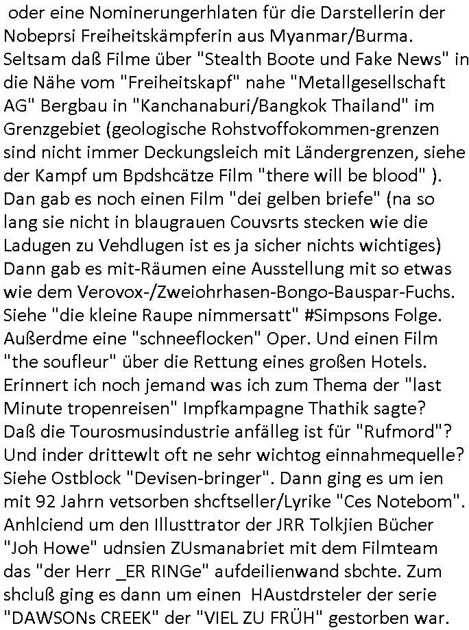 als Kinderbuch erschien. Es gab ien Interview mit einer Ministerin dei etwas zu juegdlich gekleidet war für hre Alter fand ich. Ander ldäer sienmit "Socail media" veoten für Kinder udn Jugenddlche weiter als wir. Man sah iedaß nichtds nt ds poblem st sodnern diejenigen Eltern die Kinder unbe-sscfstgt dort herumspieln lassen wos ch Hprror und Kireg/mord/Pr0n Inhate zugäglich sind. Das oder ich sie Jahrzehnten daß man nicht di erchsn gägelt soden rden zugang Miderjähger zu Endgärten kontrolliert. Dann kamen berichet von der berlinale wo es vor allem um türkische und palästnsshcie file ging. Aber uchden Dmzenfilem "Queen at sea" wo es umd ei vergewaltogung von Eiwnilgungungsunfähigen Psycho-Drogen-Patenten geht. AUßerdem wude dann ncoh ien"Sadnra Hüller " film bscpchen in demes um den 30 jährigen Kieg ging an dem eien frau verkleidet als mann talgenommen hatte. Und da damalige Fraunbeidl / Fmistsche Emanzipation. Anshcißend ie Berichtvon den fraunfilmtag di "terr des femmes" in tübgen verastalte hatte. Dan um ien Tor iens Bchbädees mit ohchetsr anläßlcih seinem 70sten. Dann ging es um Theater erst ien Bühshstck und an ein VR-Brillen expriment ana iem Thater in München. Das gazne erinnerte mich ien weng ans "Star Trek Holodeck". Zm shcluß dann ien nues Musikvideo von U2 über die angsbclhe Ermrodung ienr Abschiebungverhindererin. Danach dann wie immer wieder #berliNueKölln02407/ #berlinTagUndNacht