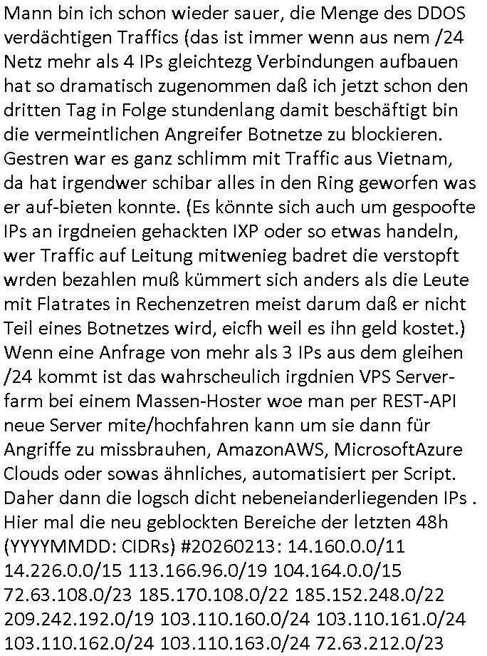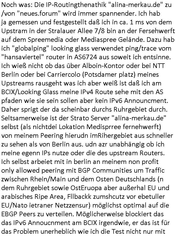 Ich ziehe gerade noch eine kleinere VPS um auf der PDF Backups liegen weil der Ostblock Provider wo das lief in letzter Zeit immer wieder Probleme machte, damit bin ich seit gestern beschäfigt, das Ding ist etwas kompliziert geroutet, da läuft auch noch ein looking glass drauf und ein paar testweise installierte Sachen die ich ewig nicht mehr genutzt habe die ich aber noch brauche. Zumdem muß ich noch knapp 64 GB an ISO - DVD Image Backups von meinem Blog hin und her transefreiren zwischen zwo Ländern was auch nochmal Zeit in Anspruch nimmt. In der Nacht hab ich von dem grottenlansamen bisherigen Anbieter auch noch 4,6GB an PDF Dateien ziehen müssen per SSH/TAR-Sssin das zog sich bis weit nach Mitternacht, der Provider hatte beim aufstezen der Linux-KVM VPS auch keine Möglichkeit ne Installations- doer Rescue-CD zu mounten weshalb ich ert eine zwote virtuelle Platte einbinden und dann snhclißend in ienr riesigen herum- artionserung Arien un mit meheren Bootstrap-Anläufen zabern muste bis die VPS auf der ich weiterinstallierte endlich kien vostallrets Linux vom Proveder mehr drauf-hatte/bootete (da gab es ganz, ganz seltsame CIRRUS Logic Treiber DRM BootMeldungen) sodernr das frische Bootstrap (Dabian minabse ohe schnickschnack) das ich haben wollte als Grundlage. http://193.109.133.9:8080/