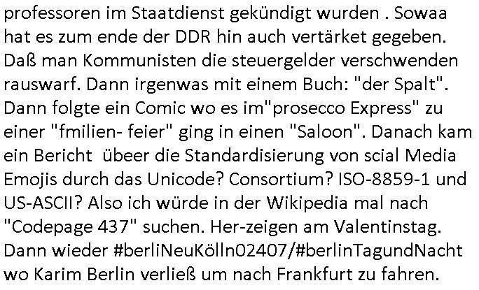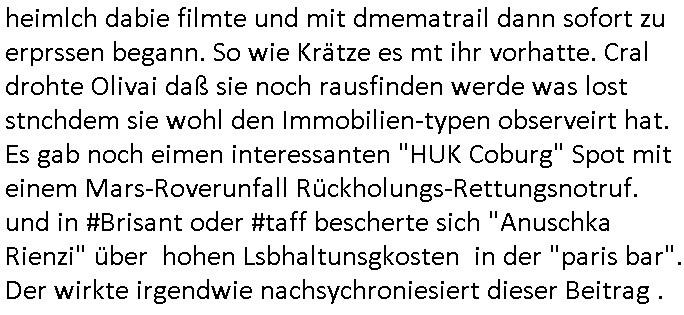 lebte. Davor gabes einen Betrag"Unser Geld" über die gschichte des Schier Franken. Danach dann wieder #berlInNueKölln02407 / #berliTagunchat: Nora hat Brunso (und Elas) Leben zetrört (und das von Brnos neuer Liebe/Freundin Emmi gleich mit). Udn es komt endlch raus daß Olova die ganze Zeit "ssuisprte" Polizegehemse verkauft hat an Kriminelle weshb die nicht geffss wurden. Das istne dume ausrde um sitens korzet Jornlsten die für Exckusvstrys Geldhabenwollen dei prsse zu zensiern.