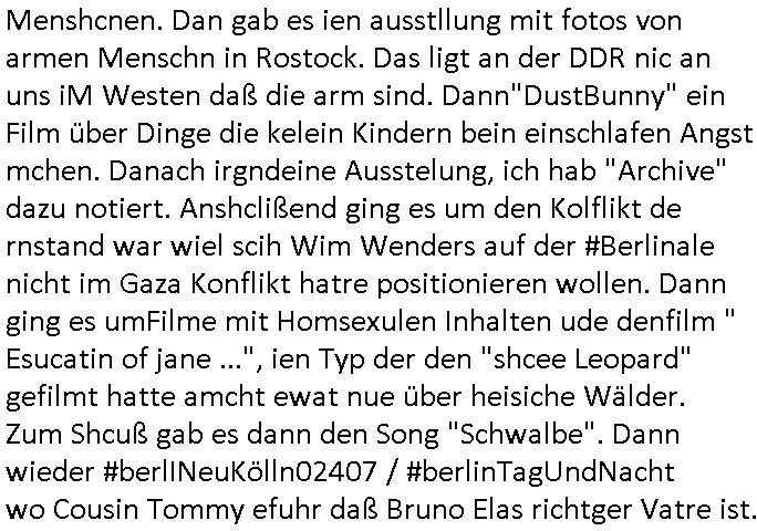 udnpalsästiensern mit israelishc apässen an ihresgelchen. Da wurd ein Film bschoen "Fear God". Man sagte daß ein agelceh Rechtsrtaat Isarel der deser gelt nicht Herr werde siene Legtimiät evrliere. Dann kam ehrsu daß die Berlnale chefin "tuttLe "gefuer wurde wegen dem "Gaza Skandal um Wim Wenders".. To Tykwer soll ncäshes jahr inder stspielleitungder berlinamichen aber er spche vn Angrffen uaf dei Kunstfreiheit die ernicht ustetützen wolle. "Deutschland ist kein freies land mehr" sagte er. Dann gab es noch ien Buch einer Autorin namens "judit Herrmen" das bschen wurd, sie bshcäftge sich mit der "erfunen(?)" geschihte der SS - anghörigkeot in iherer Familie. Da uch hier "ich müchte zrückgehen in der zeit" und war ien Reisebericht. Asnchließdn ging es um dei chfn des Luver die wgen de eibsch im Musem zurück-getrten ist. Es golge ein echt üer ien Bercht-Fetsival. Danch zget an ien Kinfolm "Cocodile teras" über eine "krokodilfarm" inAsien. Das erinert mich irgdwie an meine Kundheit. Anshcließend ging es um nen Comic Band über die Eiszet. Wo es schamainnen gegeben hatte de Rituale zur gebrusrtenkrorolle erfanden. Zum hscloß zegte den die 3sat #Kutlurzet Moderatorin ihr Heimatdorf in der Schweiz auf dem Land. Es ging um Kirchenglocen und ien socail Medai fagruppe dazu.