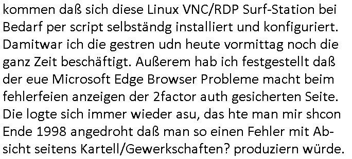 Ich war heute wieder den ganzen Morgen und Vormittag damit beschäftigt zu herumzu konfigurieren / installieren da ich am Wochenende doch Sabotage bedingte Abstürze von Windows .10 hatte. Ich hab mir überlegt den Browser einfach nicht mehr lokal auszuführen sondern auf ner Linux-Miet VPS zu der ich mich per VNC und RDP verbinden kann über einen VPN-Tunnel. Daher musste ich mich auch mit Linux-VPS Setups herumärgern und damit daß der Massenhoster bei dem ich das garde ausprobiere seine Hostsysteme so upgedated hat daß auf den Guests gleich auch noch ein Kernel Update fällig wurde. Das hat mich u tag zurückgworfn wil ich bei der Gelegenheit auch das ganze Userland von 32bit X86 ohne PAE auf AMD64 umgestellt habe. Firefox ESR lief - wenn auch langsam - auf XOrg und daher hab ich dann noch "Google Chrome" aufgesetzt. Und natürlich alles so gescripted daß sich das ganze Environament Ruckzuck von einer VPS auf ne andre umziehen lässt bei DDOS/Hacker/Vire/Malware Attacken. Hier sieht man die Früchte tage udn nächtelanger Arbeit: Das Fenster mit dem Browser im Screeshot läuft isoliert vom Rest - System komplett auf einer andren Maschine. Ich hab mir sgen lassen so etwa machen das Großbanken.