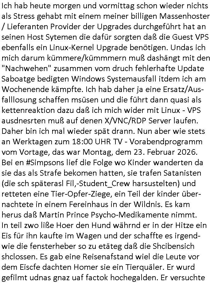 Ich war heute wieder den ganzen Tag am herum-konfiguriren die letzten Bugs ausmerzen asudemsetup gestren und es reproduzierbar machen bei einem ganz anderen Provider. Jetzt (es ist 16:00 Uhr, und ich bin seit ca. 02:00 Uhr fürh aktiv) kann ich mich endlich dem 18:00 TV - Vorabend-programm von gestren, Mittwoch dem 25. Februar 2026 widmen. Bei den #Simpsons ging es um de Saxophosten und jazz Musiker Zahnfleischbluter Murphy der Benefiz Konzerte gab damit Gehörlose Technik bekam mit der sie Musik wahrnehmen können wie Fershen frü Muskvideos. Er zeigte Lisa daß man als Musiker meist äußerst wenig verdient, Es gab "depeche mode - pesonal Jesus"/ "pjil -collins - jesus he knows me" artige Werbseongs für eine Telefonseelsorge Suizid-gefährdeten Hotline die auf der B-Seite eine Schallplatte waren. In Teil zwo ging Lisa in ein Cap wo sie Tier-/Naturfilem drehen lernen sollte und sie freundete sich mit einem Tintenfisch an. Derweil ver-liebte sich bart in seine neue Lehrerin. Danach dann #berliNueKölln02407 respektve #berliTagUndNacht w ander shcule msrihan Komsumewrt wurde. Schmidti wollte mit Indira einen Städtetrip idn Rtolcihtevrietel nach Hamburg machen. Er wollt ihr einen falschen Bart ankleben damit sie da reinkommt. Rahi ahts ich von Piet getrennt nchdem sie herusgfunden hat daß er nicht reich ist sodenr pleite. DAnach begnndie 3sat Klurze. Es ging um arabische clan-kriminalaität in Srael, unafgeklärte Morde von Arabern
