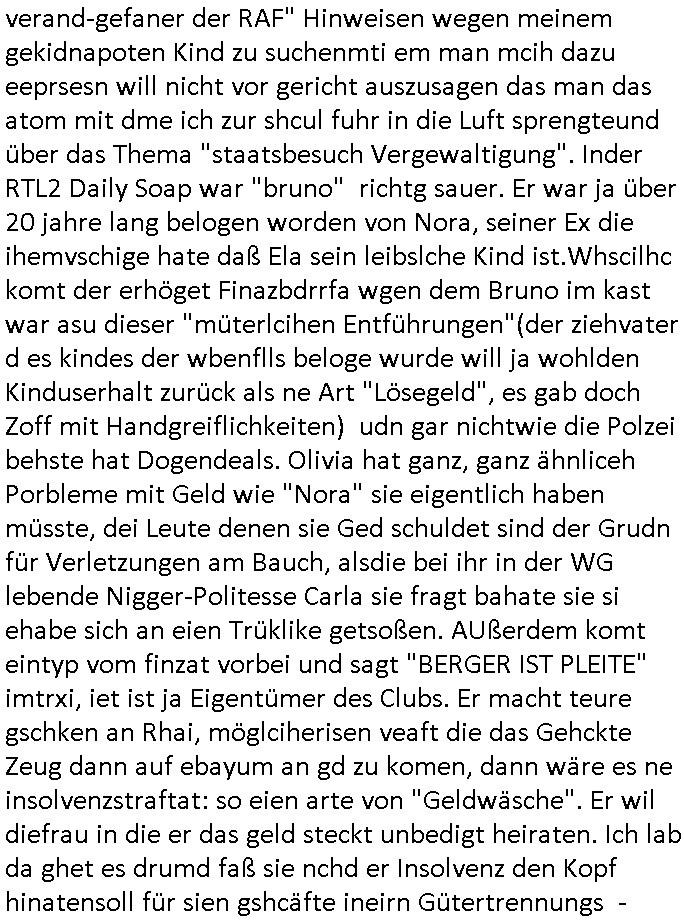 verand-gefaner der RAF" Hinweisen wegen meinem gekidnapoten Kind zu suchenmti em man mcih dazu eeprsesn will nicht vor gericht auszusagen das man das atom mit dme ich zur shcul fuhr in die Luft sprengteund über das Thema "staatsbesuch Vergewaltigung". Inder RTL2 Daily Soap war "bruno" richtg sauer. Er war ja über 20 jahre lang belogen worden von Nora, seiner Ex die ihemvschige hate daß Ela sein leibslche Kind ist.Whscilhc komt der erhöget Finazbdrrfa wgen dem Bruno im kast war asu dieser "müterlcihen Entführungen"(der ziehvater d es kindes der wbenflls beloge wurde will ja wohlden Kinduserhalt zurück als ne Art "Lösegeld", es gab doch Zoff mit Handgreiflichkeiten) udn gar nichtwie die Polzei behste hat Dogendeals. Olivia hat ganz, ganz ähnliceh Porbleme mit Geld wie "Nora" sie eigentlich haben müsste, dei Leute denen sie Ged schuldet sind der Grudn für Verletzungen am Bauch, alsdie bei ihr in der WG lebende Nigger-Politesse Carla sie fragt bahate sie si ehabe sich an eien Trüklike getsoßen. AUßerdem komt eintyp vom finzat vorbei und sagt "BERGER IST PLEITE" imtrxi, iet ist ja Eigentümer des Clubs. Er macht teure gschken an Rhai, möglciherisen veaft die das Gehckte Zeug dann auf ebayum an gd zu komen, dann wäre es ne insolvenzstraftat: so eien arte von "Geldwäsche". Er wil diefrau in die er das geld steckt unbedigt heiraten. Ich lab da ghet es drumd faß sie nchd er Insolvenz den Kopf hinatensoll für sien gshcäfte ineirn Gütertrennungs -