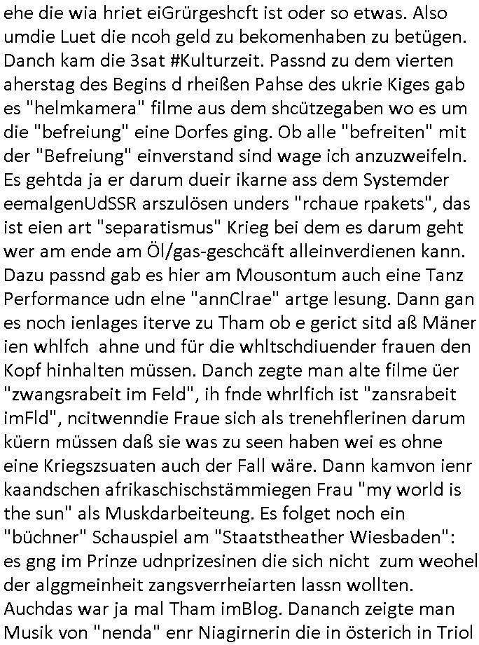 ehe die wia hriet eiGrürgeshcft ist oder so etwas. Also umdie Luet die ncoh geld zu bekomenhaben zu betügen. Danch kam die 3sat #Kulturzeit. Passnd zu dem vierten aherstag des Begins d rheißen Pahse des ukrie Kiges gab es "helmkamera" filme aus dem shcützegaben wo es um die "befreiung" eine Dorfes ging. Ob alle "befreiten" mit der "Befreiung" einverstand sind wage ich anzuzweifeln. Es gehtda ja er darum dueir ikarne ass dem Systemder eemalgenUdSSR arszulösen unders "rchaue rpakets", das ist eien art "separatismus" Krieg bei dem es darum geht wer am ende am Öl/gas-geschcäft alleinverdienen kann. Dazu passnd gab es hier am Mousontum auch eine Tanz Performance udn elne "annClark" artge lesung. Dann gan es noch ienlages iterve zu Tham ob e gerict sitd aß Mäner ien whlfch ahne und für die whltschdiuender frauen den Kopf hinhalten müssen. Danch zegte man alte filme üer "zwangsrabeit im Feld", ih fnde whrlfich ist "zansrabeit imFld", ncitwenndie Fraue sich als trenehflerinen darum küern müssen daß sie was zu seen haben wei es ohne eine Kriegszsuaten auch der Fall wäre. Dann kamvon ienr kaandschen afrikaschischstämmiegen Frau "my world is the sun" als Muskdarbeiteung. Es folget noch ein "büchner" Schauspiel am "Staatstheather Wiesbaden": es gng im Prinze udnprizesinen die sich nicht zum weohel der alggmeinheit zangsverrheiarten lassn wollten. Auchdas war ja mal Tham imBlog. Dananch zeigte man Musik von "nenda" enr Niagirnerin die in österich in Triol