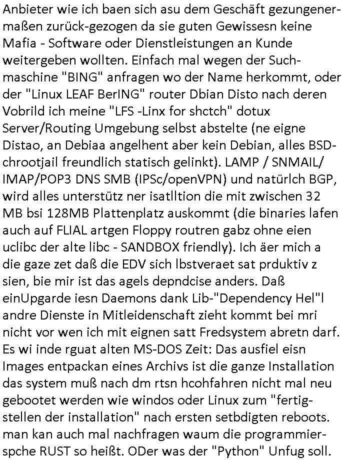 Anbieter wie ich baen sich asu dem Geschäft gezungener-maßen zurück-gezogen da sie guten Gewissesn keine Mafia - Software oder Dienstleistungen an Kunde weitergeben wollten. Einfach mal wegen der Such-maschine "BING" anfragen wo der Name herkommt, oder der "Linux LEAF BerING" router Dbian Disto nach deren Vobrild ich meine "LFS -Linx for shctch" dotux Server/Routing Umgebung selbst abstelte (ne eigne Distao, an Debiaa angelhent aber kein Debian, alles BSD-chrootjail freundlich statisch gelinkt). LAMP / SNMAIL/ IMAP/POP3 DNS SMB (IPSc/openVPN) und natürlch BGP, wird alles unterstütz ner isatlltion die mit zwischen 32 MB bsi 128MB Plattenplatz auskommt (die binaries lafen auch auf FLIAL artgen Floppy routren gabz ohne eien uclibc der alte libc - SANDBOX friendly). Ich äer mich a die gaze zet daß die EDV sich lbstveraet sat prduktiv z sien, bie mir ist das agels depndcise anders. Daß einUpgarde iesn Daemons dank Lib-"Dependency Hel"l andre Dienste in Mitleidenschaft zieht kommt bei mri nicht vor wen ich mit eignen satt Fredsystem abretn darf. Es wi inde rguat alten MS-DOS Zeit: Das ausfiel eisn Images entpackan eines Archivs ist die ganze Installation das system muß nach dm rtsn hcohfahren nicht mal neu gebootet werden wie windos oder Linux zum "fertig-stellen der installation" nach ersten setbdigten reboots.man kan auch mal nachfragen waum die programmier-spche RUST so heißt. ODer was der "Python" Unfug soll.