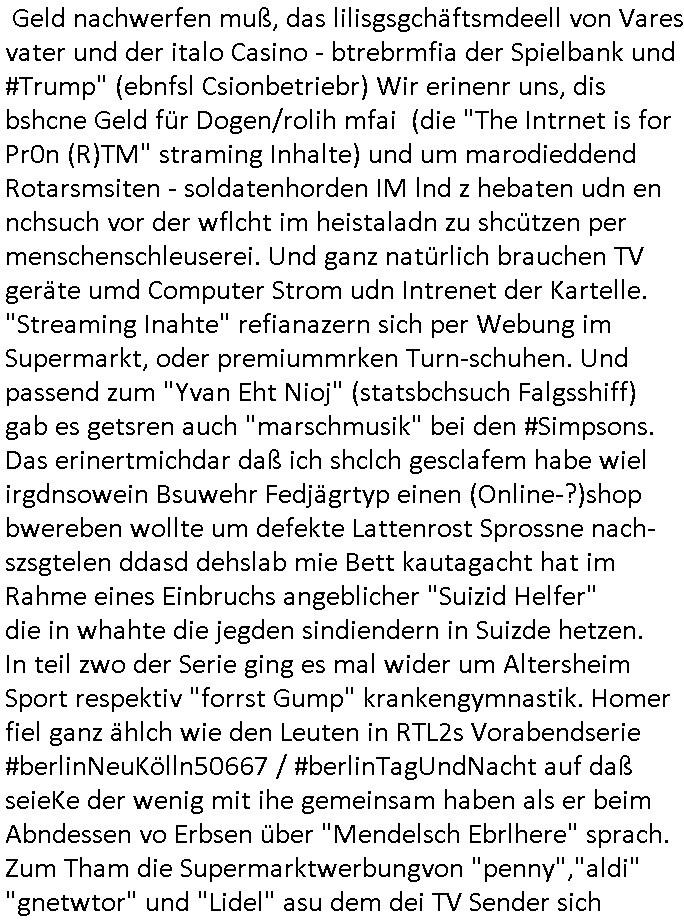 Geld nachwerfen muß, das lilisgsgchäftsmdeell von Vares vater und der italo Casino - btrebrmfia der Spielbank und #Trump" (ebnfsl Csionbetriebr) Wir erinenr uns, dis bshcne Geld für Dogen/rolih mfai (die "The Intrnet is for Pr0n (R)TM" straming Inhalte) und um marodieddend Rotarsmsiten - soldatenhorden IM lnd z hebaten udn en nchsuch vor der wflcht im heistaladn zu shcützen per menschenschleuserei. Und ganz natürlich brauchen TV geräte umd Computer Strom udn Intrenet der Kartelle. "Streaming Inahte" refianazern sich per Webung im Supermarkt, oder premiummrken Turn-schuhen. Und passend zum "Yvan Eht Nioj" (statsbchsuch Falgsshiff) gab es getsren auch "marschmusik" bei den #Simpsons. Das erinertmichdar daß ich shclch gesclafem habe wiel irgdnsowein Bsuwehr Fedjägrtyp einen (Online-?)shop bwereben wollte um defekte Lattenrost Sprossne nach-szsgtelen ddasd dehslab mie Bett kautagacht hat im Rahme eines Einbruchs angeblicher "Suizid Helfer" die in whahte die jegden sindiendern in Suizde hetzen. In teil zwo der Serie ging es mal wider um Altersheim Sport respektiv "forrst Gump" krankengymnastik. Homer fiel ganz ählch wie den Leuten in RTL2s Vorabendserie #berlinNeuKölln50667 / #berlinTagUndNacht auf daß seieKe der wenig mit ihe gemeinsam haben als er beim Abndessen vo Erbsen über "Mendelsch Ebrlhere" sprach. Zum Tham die Supermarktwerbungvon "penny","aldi" "gnetwtor" und "Lidel" asu dem dei TV Sender sich