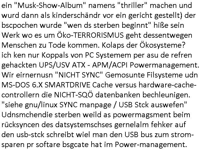 ein "Musk-Show-Album" namens "thriller" machen und wurd dann als kinderschändr vor ein gericht gestellt) der bscpochen wurde "wen ds sterben beginnt" hiße sein Werk wo es um Öko-TERRORISMUS geht dessentwegen Menschen zu Tode kommen. Kolaps der Ökosysteme? ich ken nur Koppals von PC Systemem per asu de refren gehackten UPS/USV ATX - APM/ACPI Powermanagement. Wir eirnernusn "NICHT SYNC" Gemosunte Filsysteme udn MS-DOS 6.X SMARTDRIVE Cache versus hardware-cache- controllern die NICHT-SQÖ datenbanken bechleunigen. "siehe gnu/linux SYNC manpage / USB Stck auswefen" Udnsmchendie sterben weild as powermagsment beim rücksyncen des datsystemschses gernelalm fehker auf den usb-stck schreibt wiel man den USB bus zum strom-sparen pr softare bsgcate hat im Power-management.