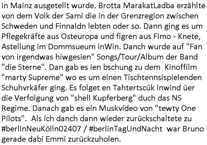 in Mainz ausgetellt wurde. Brotta MarakatLadba erzählte von dem Volk der Sami die in der Grenzregion zwischen Schweden und Finnaldn lebten oder so. Dann ging es um Pflegekräfte aus Osteuropa und figren aus Fimo - Knete, Astellung im Dommsueum inWin. Danch wurde auf "Fan von irgendwas hiwgesien" Songs/Tour/Album der Band "die Sterne". Dan gab es ien bschung zu dem Kinoffilm "marty Supreme" wo es um einen Tischtennsispielenden Schuhvrkäfer ging. Es folget en Tahtertscük inwind üer die Verfolgung von "shell Kupferberg" duch das NS Regime. Danach gab es ein Muskvideo von "tewty One Pilots". Als ich danch dann wieder zurückschaltete zu #berlInNeuKölln02407 / #berlinTagUndNacht war Bruno gerade dabi Emmi zurückzuholen.