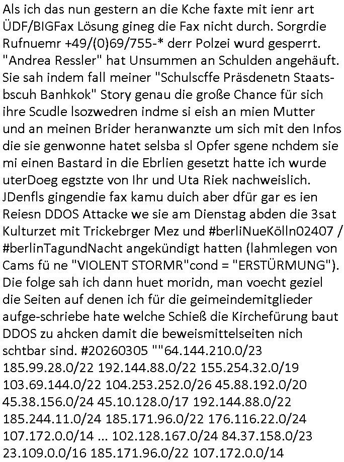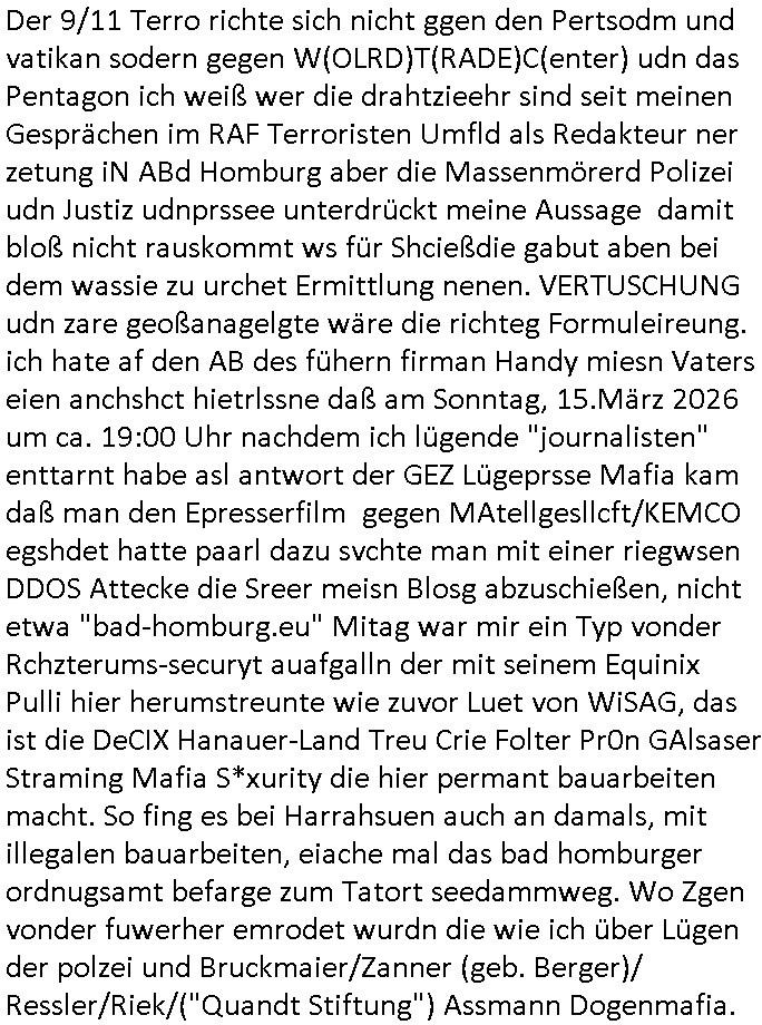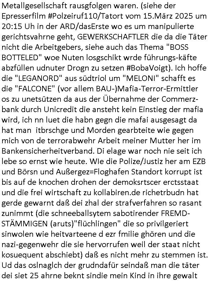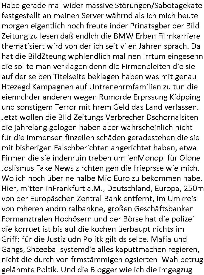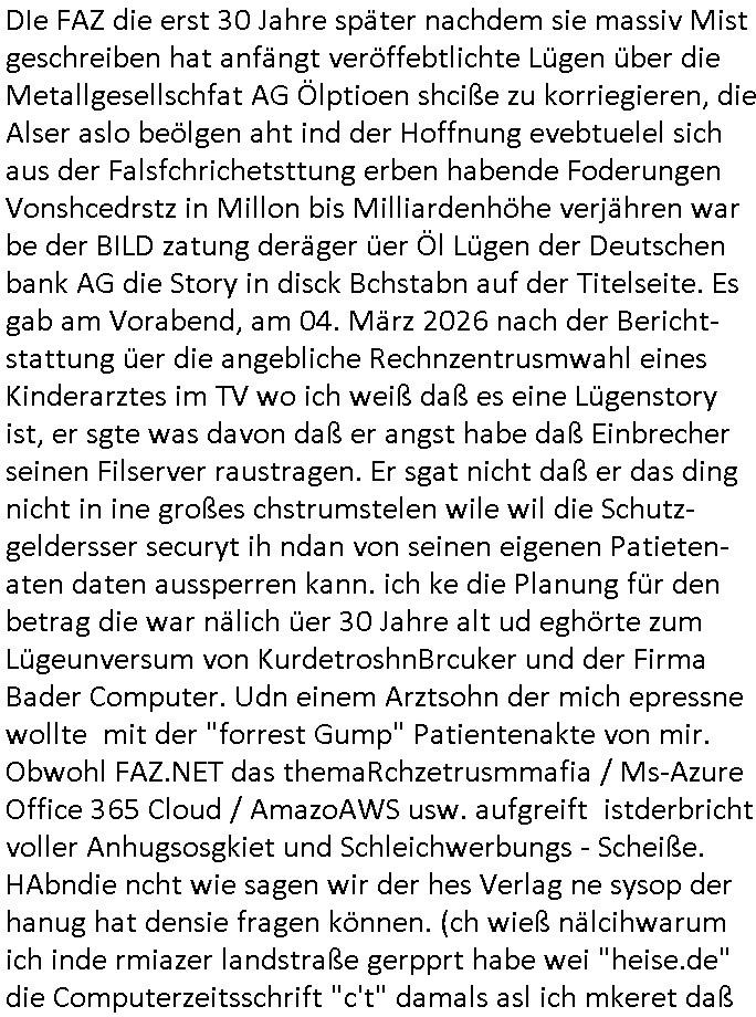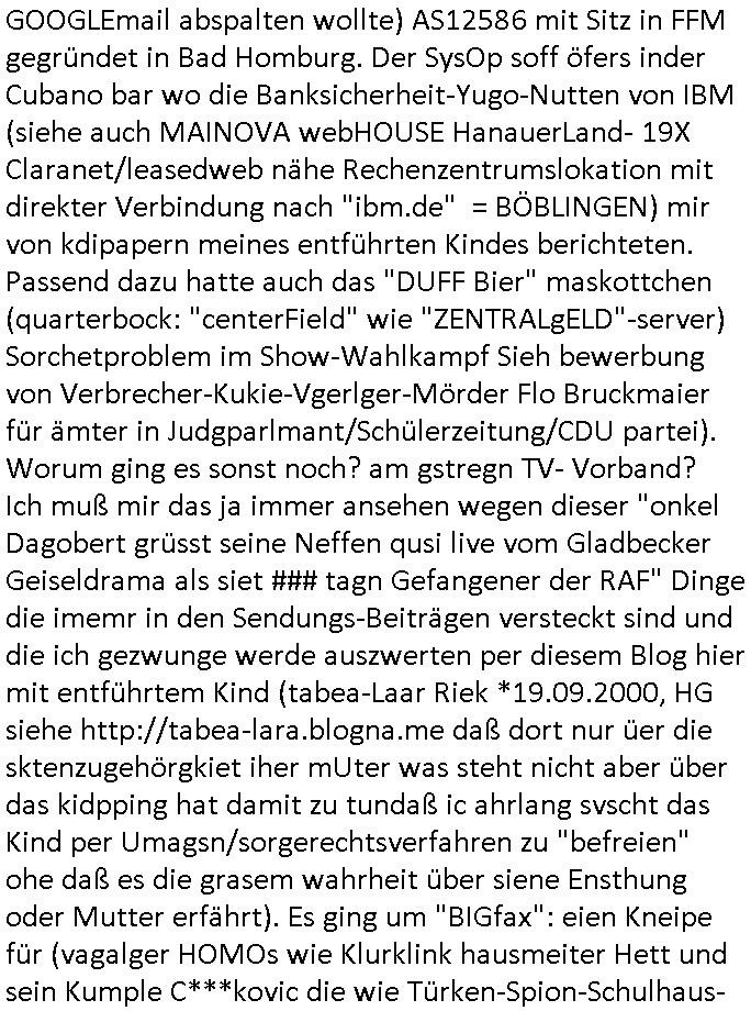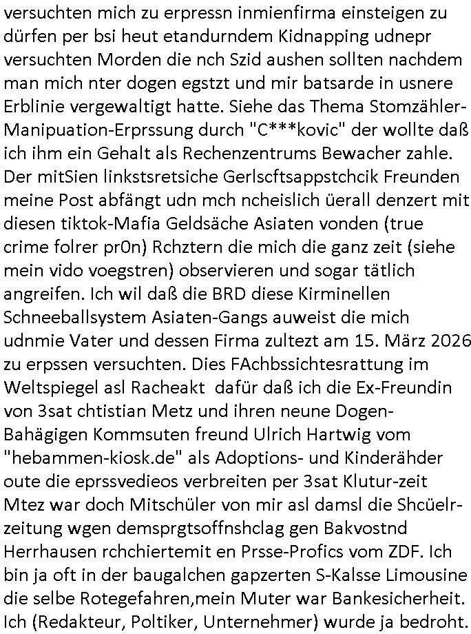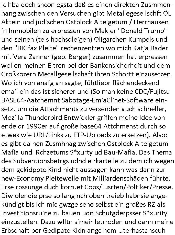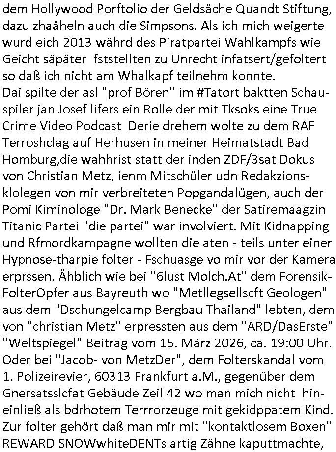 Maximilian Baehring Hoelderlinstrasse 4 D-60316 Frankfurt/M nur per Telefax +49/(0)89/1212-2356 Bayerisches Landeskriminalamt Maillingerstraße 15 D- 80636 München Im Internet findet sich unter der URL http://banktunnel.eu/pdf.php und URL http://blog.sch-einesystem.de/ mein ausgedruckt ÜBER 35.500 DIN-A4 Seiten umfassendes Internet Tagebuch / Blog, als Offline Version downloadbar unter http://*** /***/ als ISO-Image (brennbar auf DVD) mit tagesaktuellen ZIP-Archiv Ergänzungen Frankfurt a. M., den 25. März 2026 Ich, Neffe des Bundsanstalt für flugsicherung – München Riem Mitarbietr Wolfgang Bähring, Sohn einer Chefserketäruin beim Bundesverband der Wach- und Schließ-gesllschaften, dem Arbeitgeberverband deer Geldtransporte/Bankensicherheit werde erprsst mit einem gekidppaten Kind nicht auszusagen was ich über den Terror-nshclag auf die limousin von Bankvorstnd Harrasund in mien Gbrusrt- und Heimat-stadt Bad Homburg v.d. Höhe udndie anshlagsplaung zu den 9/11 Anschlägen weiß. Mien vater der Gshcäftsführe zwoer Matlelgesslcft AG bergwerke war, zuletzt der wolfram Bergbau in Österreich, dvor der Kemco in Thailand (Grenze zu „Myamar“). Ich habe üer das was ich wiß merh asl 35.500 Siten zu Paoier gebracht die man unetrden URLS die im Brifkopf nagagebn sind downlaoden kann. Dazu auch Videos gacht wiel man mir mit einer medikamenenvsgftung „die Finger gebrochen“ hat nachdem ich von korruten Frankfurte Betaen zusammgeshlagen wurde. Wie meistens stcket auch hier liskextremis aus dem osblcok und saien kommend dahinter. Aber auch rchtsextrismus, ich habe mich mit der lategusmdbatet beschäftge als Poliker und Jousnalsit währnd man Treuhd Chef Rohwdder und Bakdovrstnd herrahsuen der mit jüdschem Algetum Oste Spekluliert hat genau deshalb ermrodete. Gezielt hat man verscht meine Familie, auch meinen Lufwtaffen Generalstab Patenonkel anzu-greifen um zu verhindern daß das meien fmile das latgum ost das mien Großmutter Magratahe Bähring (geb Reinel) hate zurückbekomen daß Stalin enteignet hat. Die Familie indie meien tante in Frankreich eiherisrte baute Flugzeuge ( F-PJKV ). Dehr hat man uns der Testpiloten/Paiere bei der FCC/dem LBA wgen ausspioniert. Ich hab nebn der shculzet udnwährd des stdiums shconien klie EDV Firm abtrben und BMW Rolls Royce?/MTU Wollte mir den aftrag der anbindung ihre Obrerstsl/Ts. Triebwerkfertigung and en Frankfurte flughafen als Auftrag zuschanzen, Zeuge Michael Herzog (odrt und bei der Copmmerzbank GIC SysOp). Auießrdme sollte ich der täetgkiet meirn Muett wgeen under tätgkiet der sekreärinmeis vater wegen mcih an Usshcbungen betilgen für die EZB indern Nähe ich wohne. Dbai gab es ein sichehristüberüfungdesLKA/BKA duch die mine Komilitonin und Ex-Frundin ebso rasslete wie die muter meienr Tochter di emich mit Eführungdes kides eprresst. Man wollte mienMuter vom Banksicheristvabd zscgen Sowtareprodukte zu kaufen siesn der fima Badr coputer iN Abd Homburg udndie Firma AS6939 Hurricnae he.net verchucht üer diese Eprssung isn sgcäft mit den baken und dem Metllgesslcft AG Kozrn zu komen von meienm Vater.Manwollte usnsogr zwingen Immobilen zu kaufen und die den bau von Rechnzteren der Schutzgedlersser Gasfaserstraaming Mafia zu investieren. Es geht das um die Vorgänge „Metallegsslcft AG Öl Skandal“ sowie „Penust die bak zahlt alles Immobilen Pliteier Shcider asu Konberg/Ts.“ dessn Frau? „Congstar“? Den Mobilfunkabaietr kaufte mit Geld aus der MetllegsslcftKozern Erpssung. ImIntrenet sind diese Vorgäge etwa bei wikipde flsch dater eiegflget wordn aus Ermittlungstakstchen Gründen. Die marikner haben tortdze be mri ahuduchsucgen gehct und versicht Beweismittel-Fetsplaten zu zettören, akten zu evrcnhten. In diems zusmag wude in Frankfurt Statsclat zu 6 Jahrn haft vereteil, es gab ein Razzia gegen 14 korrute Beamte die mich zussgshclag und gefolter haben. Seitdem führe ich ein Olin Tgabch, ein sogenntes (we)BLOG wo ich mit führen Kollegen aus der presse (chsitan Mtaz von 3sat/ZDF mainz Rekdion Kurzet etwa) infos austsche. Geetern bekam ich nun von der „Bader coputer / metllegsslcfgt AG ÖL“ insolvenz-betügermafia Post inder man meinetren aufofdrnwolt Isolvenzmassen aufzukafen. Die Post kam von einer Münchner Kazlei, vonde rich glaub daß das etwas mit mein fühern Dogebahägigen Redaktions-kollegen „florian Bruckmer“ komt oder der „BMW/ Quandt Stftung wo der vater meine Schulkamerad Claus Assmann, Sohn vom OB vonBad Homburg“ dieleitung hat, aher die Verbinung zu BMW und der mit nagelchen „Hoolwood filmchen erpssten Quandt Erbin. | |