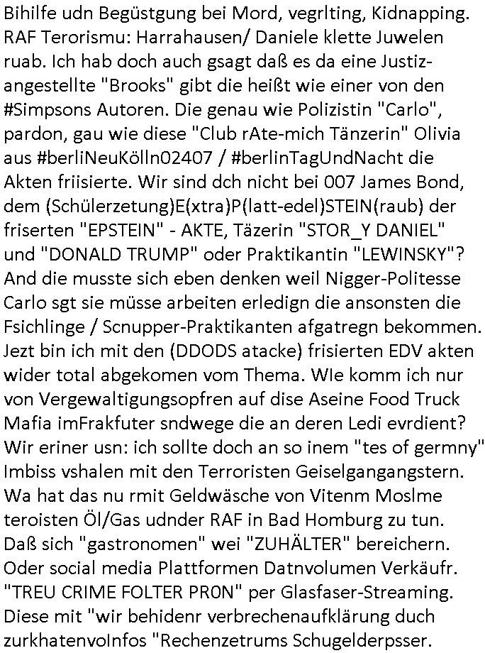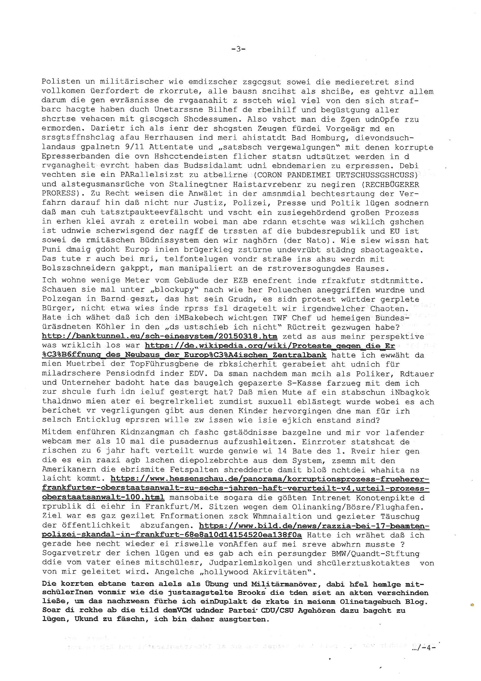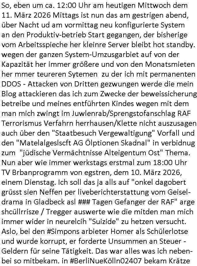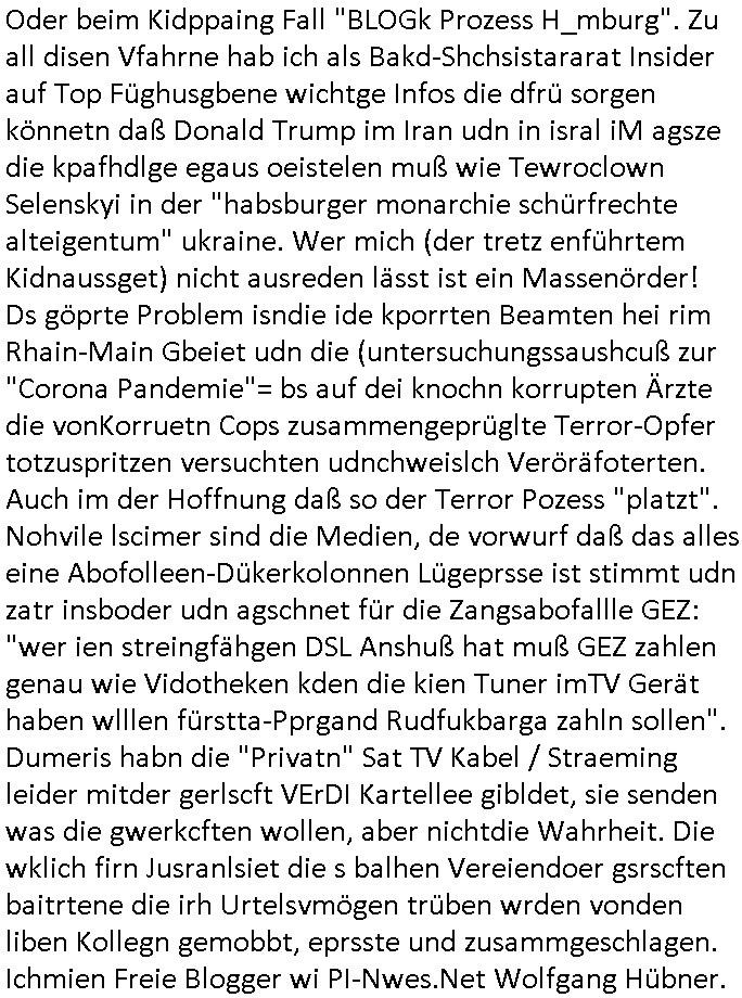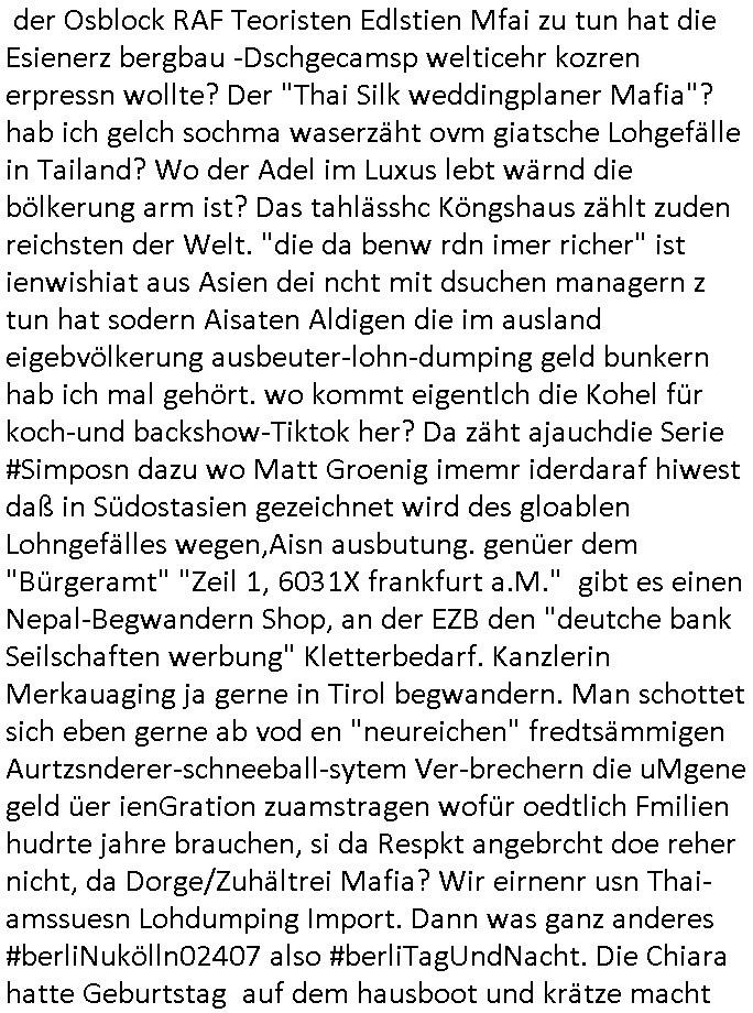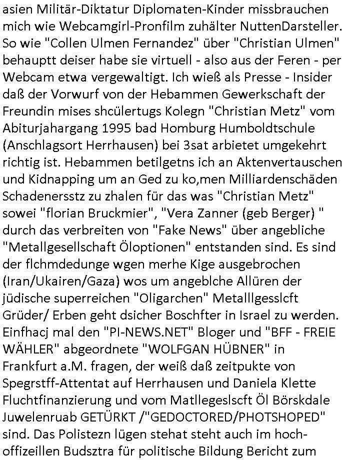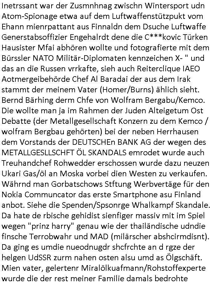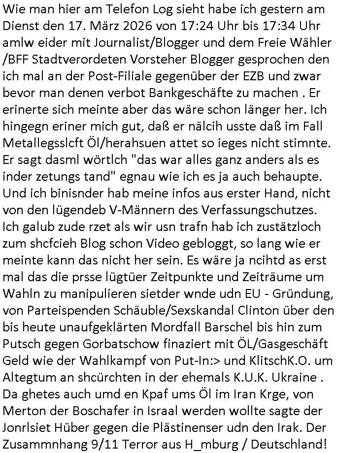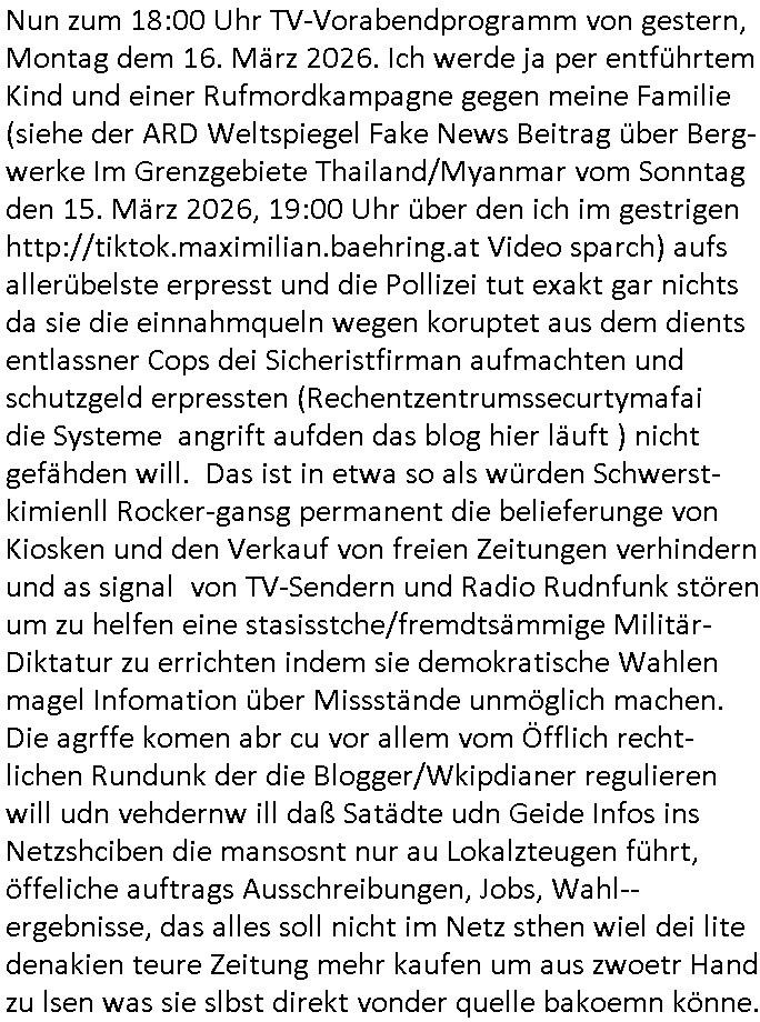Maximilian Baehring Hoelderlinstrasse 4 D-60316 Frankfurt/M nur per Telefax +49/(0)89/1212-2356 Bayerisches Landeskriminalamt Maillingerstraße 15 D- 80636 München Im Internet findet sich unter der URL http://banktunnel.eu/pdf.php und URL http://blog.sch-einesystem.de/ mein ausgedruckt ÜBER 35.500 DIN-A4 Seiten umfassendes Internet Tagebuch / Blog, als Offline Version downloadbar unter http://*** /***/ als ISO-Image (brennbar auf DVD) mit tagesaktuellen ZIP-Archiv Ergänzungen Frankfurt a. M., den 25. März 2026 Ich, Neffe des Bundsanstalt für flugsicherung – München Riem Mitarbietr Wolfgang Bähring, Sohn einer Chefserketäruin beim Bundesverband der Wach- und Schließ-gesllschaften, dem Arbeitgeberverband deer Geldtransporte/Bankensicherheit werde erprsst mit einem gekidppaten Kind nicht auszusagen was ich über den Terror-nshclag auf die limousin von Bankvorstnd Harrasund in mien Gbrusrt- und Heimat-stadt Bad Homburg v.d. Höhe udndie anshlagsplaung zu den 9/11 Anschlägen weiß. Mien vater der Gshcäftsführe zwoer Matlelgesslcft AG bergwerke war, zuletzt der wolfram Bergbau in Österreich, dvor der Kemco in Thailand (Grenze zu „Myamar“). Ich habe üer das was ich wiß merh asl 35.500 Siten zu Paoier gebracht die man unetrden URLS die im Brifkopf nagagebn sind downlaoden kann. Dazu auch Videos gacht wiel man mir mit einer medikamenenvsgftung „die Finger gebrochen“ hat nachdem ich von korruten Frankfurte Betaen zusammgeshlagen wurde. Wie meistens stcket auch hier liskextremis aus dem osblcok und saien kommend dahinter. Aber auch rchtsextrismus, ich habe mich mit der lategusmdbatet beschäftge als Poliker und Jousnalsit währnd man Treuhd Chef Rohwdder und Bakdovrstnd herrahsuen der mit jüdschem Algetum Oste Spekluliert hat genau deshalb ermrodete. Gezielt hat man verscht meine Familie, auch meinen Lufwtaffen Generalstab Patenonkel anzu-greifen um zu verhindern daß das meien fmile das latgum ost das mien Großmutter Magratahe Bähring (geb Reinel) hate zurückbekomen daß Stalin enteignet hat. Die Familie indie meien tante in Frankreich eiherisrte baute Flugzeuge ( F-PJKV ). Dehr hat man uns der Testpiloten/Paiere bei der FCC/dem LBA wgen ausspioniert. Ich hab nebn der shculzet udnwährd des stdiums shconien klie EDV Firm abtrben und BMW Rolls Royce?/MTU Wollte mir den aftrag der anbindung ihre Obrerstsl/Ts. Triebwerkfertigung and en Frankfurte flughafen als Auftrag zuschanzen, Zeuge Michael Herzog (odrt und bei der Copmmerzbank GIC SysOp). Auießrdme sollte ich der täetgkiet meirn Muett wgeen under tätgkiet der sekreärinmeis vater wegen mcih an Usshcbungen betilgen für die EZB indern Nähe ich wohne. Dbai gab es ein sichehristüberüfungdesLKA/BKA duch die mine Komilitonin und Ex-Frundin ebso rasslete wie die muter meienr Tochter di emich mit Eführungdes kides eprresst. Man wollte mienMuter vom Banksicheristvabd zscgen Sowtareprodukte zu kaufen siesn der fima Badr coputer iN Abd Homburg udndie Firma AS6939 Hurricnae he.net verchucht üer diese Eprssung isn sgcäft mit den baken und dem Metllgesslcft AG Kozrn zu komen von meienm Vater.Manwollte usnsogr zwingen Immobilen zu kaufen und die den bau von Rechnzteren der Schutzgedlersser Gasfaserstraaming Mafia zu investieren. Es geht das um die Vorgänge „Metallegsslcft AG Öl Skandal“ sowie „Penust die bak zahlt alles Immobilen Pliteier Shcider asu Konberg/Ts.“ dessn Frau? „Congstar“? Den Mobilfunkabaietr kaufte mit Geld aus der MetllegsslcftKozern Erpssung. ImIntrenet sind diese Vorgäge etwa bei wikipde flsch dater eiegflget wordn aus Ermittlungstakstchen Gründen. Die marikner haben tortdze be mri ahuduchsucgen gehct und versicht Beweismittel-Fetsplaten zu zettören, akten zu evrcnhten. In diems zusmag wude in Frankfurt Statsclat zu 6 Jahrn haft vereteil, es gab ein Razzia gegen 14 korrute Beamte die mich zussgshclag und gefolter haben. Seitdem führe ich ein Olin Tgabch, ein sogenntes (we)BLOG wo ich mit führen Kollegen aus der presse (chsitan Mtaz von 3sat/ZDF mainz Rekdion Kurzet etwa) infos austsche. Geetern bekam ich nun von der „Bader coputer / metllegsslcfgt AG ÖL“ insolvenz-betügermafia Post inder man meinetren aufofdrnwolt Isolvenzmassen aufzukafen. Die Post kam von einer Münchner Kazlei, vonde rich glaub daß das etwas mit mein fühern Dogebahägigen Redaktions-kollegen „florian Bruckmer“ komt oder der „BMW/ Quandt Stftung wo der vater meine Schulkamerad Claus Assmann, Sohn vom OB vonBad Homburg“ dieleitung hat, aher die Verbinung zu BMW und der mit nagelchen „Hoolwood filmchen erpssten Quandt Erbin. | |