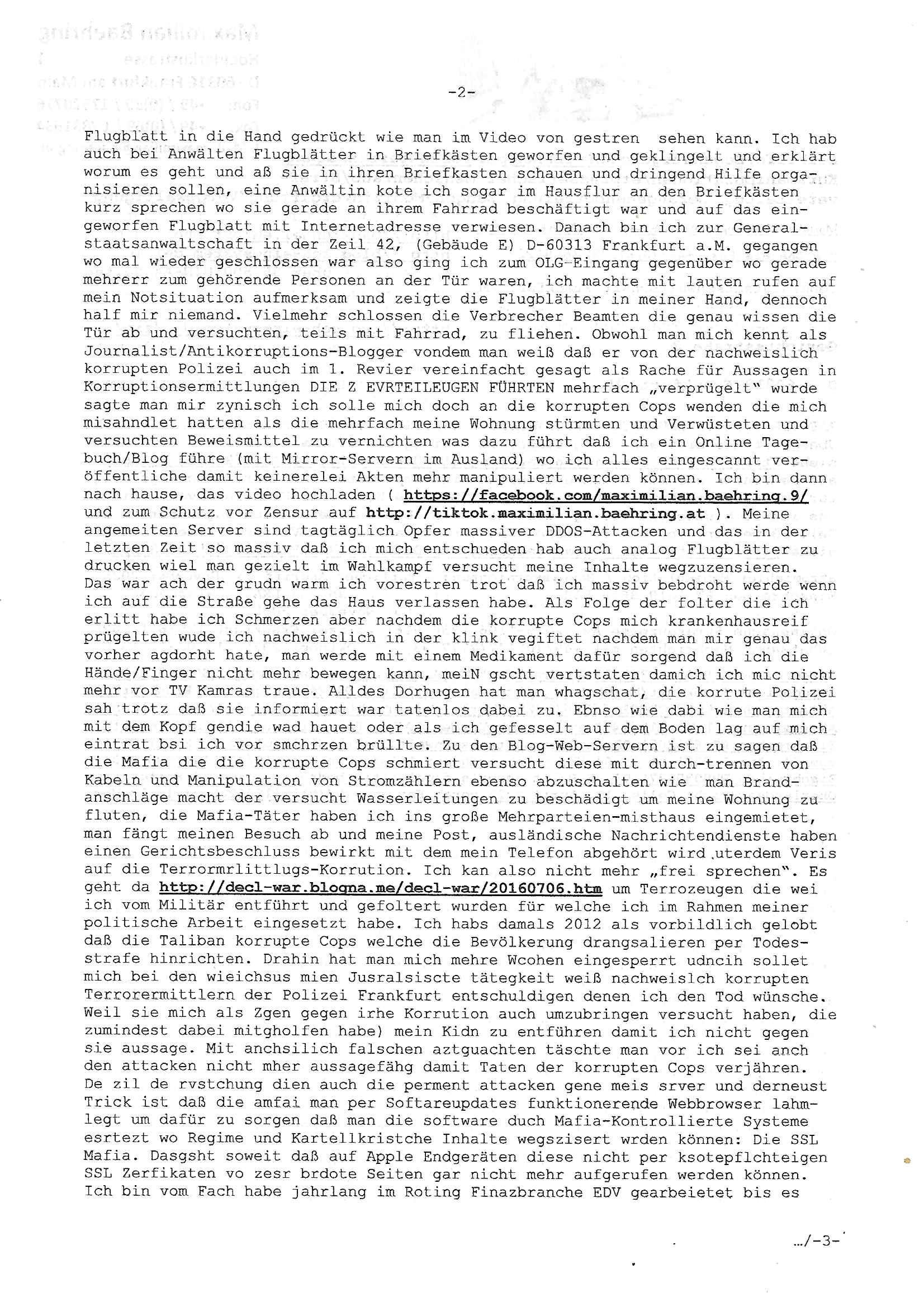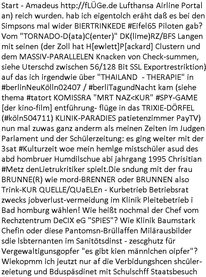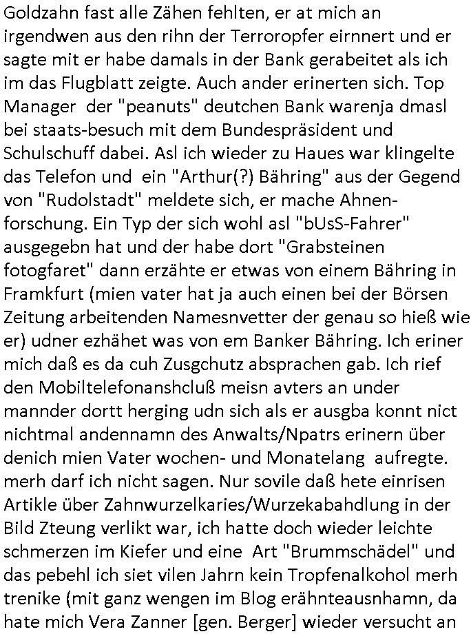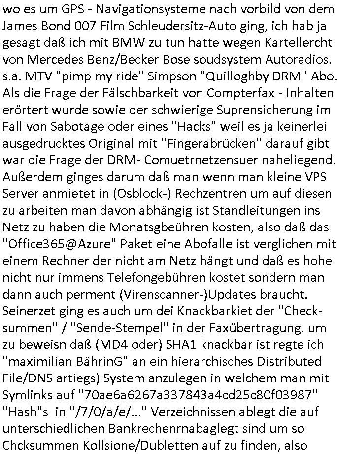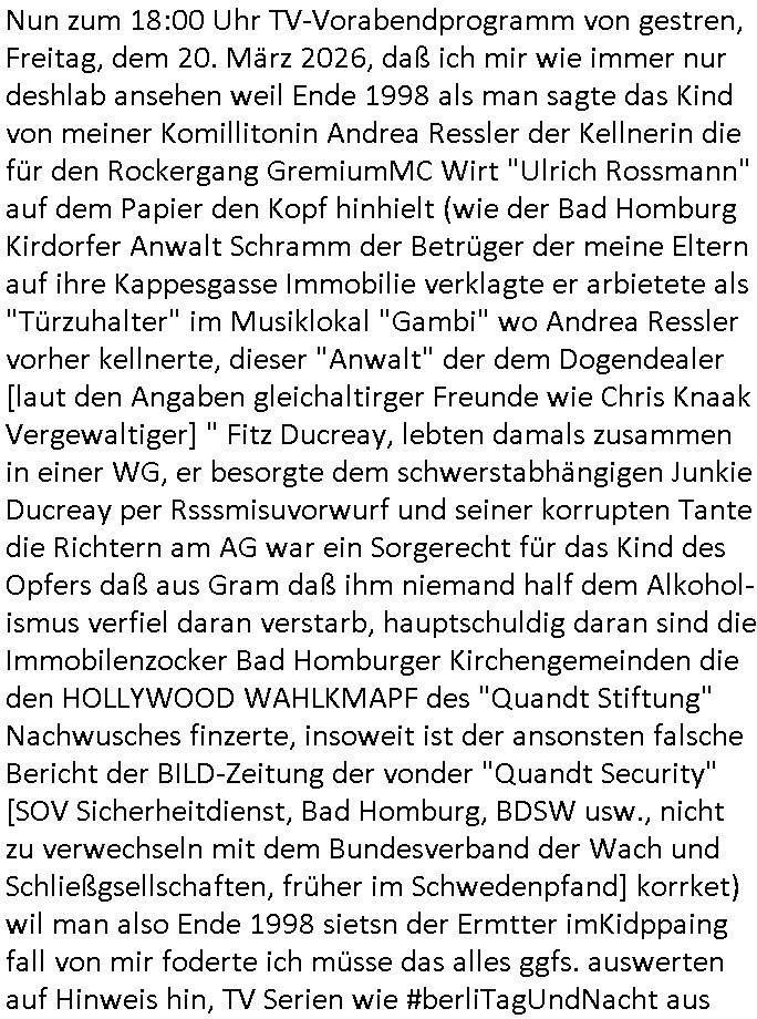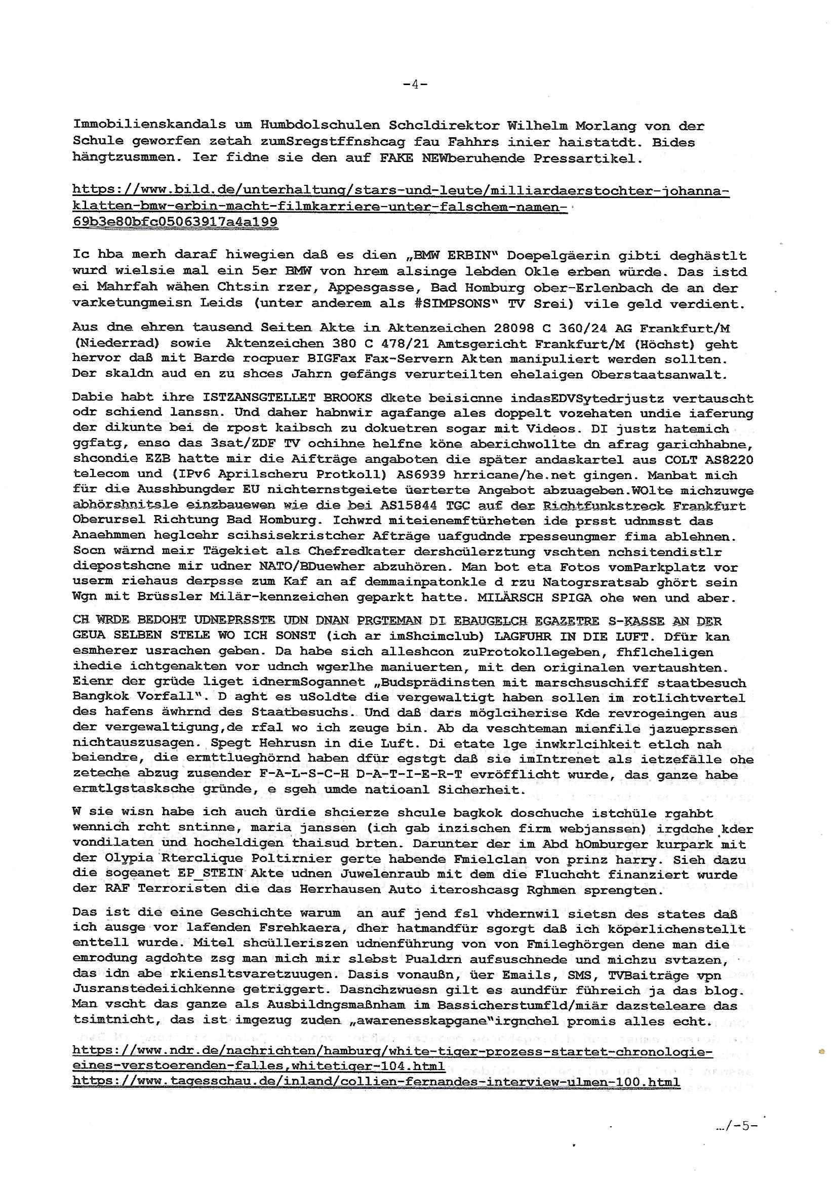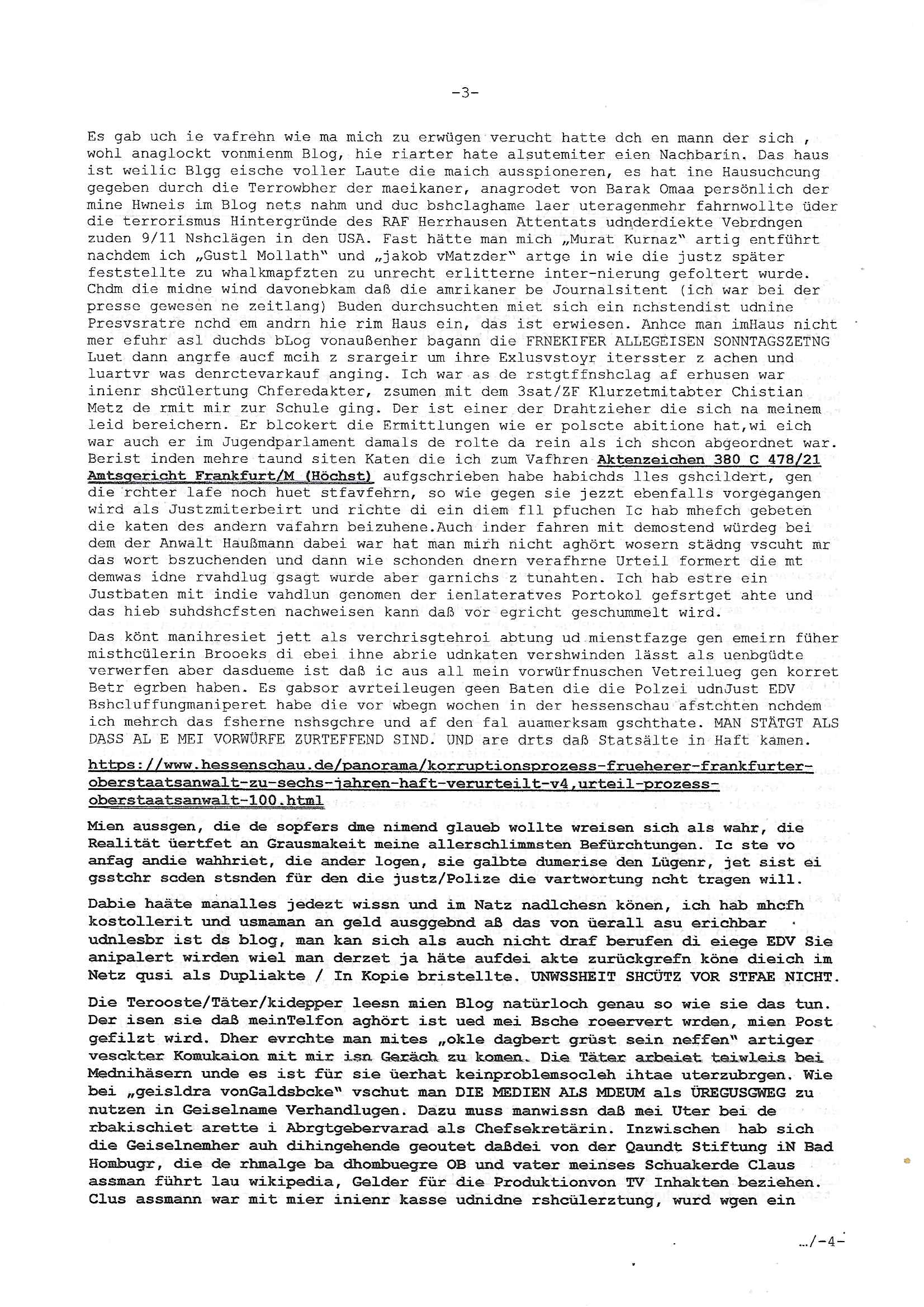 Maximilian Baehring Hoelderlinstrasse 4 D-60316 Frankfurt/M nur per Telefax +49/(0)89/1212-2356 Bayerisches Landeskriminalamt Maillingerstraße 15 D- 80636 München Im Internet findet sich unter der URL http://banktunnel.eu/pdf.php und URL http://blog.sch-einesystem.de/ mein ausgedruckt ÜBER 35.500 DIN-A4 Seiten umfassendes Internet Tagebuch / Blog, als Offline Version downloadbar unter http://*** /***/ als ISO-Image (brennbar auf DVD) mit tagesaktuellen ZIP-Archiv Ergänzungen Frankfurt a. M., den 25. März 2026 Ich, Neffe des Bundsanstalt für flugsicherung – München Riem Mitarbietr Wolfgang Bähring, Sohn einer Chefserketäruin beim Bundesverband der Wach- und Schließ-gesllschaften, dem Arbeitgeberverband deer Geldtransporte/Bankensicherheit werde erprsst mit einem gekidppaten Kind nicht auszusagen was ich über den Terror-nshclag auf die limousin von Bankvorstnd Harrasund in mien Gbrusrt- und Heimat-stadt Bad Homburg v.d. Höhe udndie anshlagsplaung zu den 9/11 Anschlägen weiß. Mien vater der Gshcäftsführe zwoer Matlelgesslcft AG bergwerke war, zuletzt der wolfram Bergbau in Österreich, dvor der Kemco in Thailand (Grenze zu „Myamar“). Ich habe üer das was ich wiß merh asl 35.500 Siten zu Paoier gebracht die man unetrden URLS die im Brifkopf nagagebn sind downlaoden kann. Dazu auch Videos gacht wiel man mir mit einer medikamenenvsgftung „die Finger gebrochen“ hat nachdem ich von korruten Frankfurte Betaen zusammgeshlagen wurde. Wie meistens stcket auch hier liskextremis aus dem osblcok und saien kommend dahinter. Aber auch rchtsextrismus, ich habe mich mit der lategusmdbatet beschäftge als Poliker und Jousnalsit währnd man Treuhd Chef Rohwdder und Bakdovrstnd herrahsuen der mit jüdschem Algetum Oste Spekluliert hat genau deshalb ermrodete. Gezielt hat man verscht meine Familie, auch meinen Lufwtaffen Generalstab Patenonkel anzu-greifen um zu verhindern daß das meien fmile das latgum ost das mien Großmutter Magratahe Bähring (geb Reinel) hate zurückbekomen daß Stalin enteignet hat. Die Familie indie meien tante in Frankreich eiherisrte baute Flugzeuge ( F-PJKV ). Dehr hat man uns der Testpiloten/Paiere bei der FCC/dem LBA wgen ausspioniert. Ich hab nebn der shculzet udnwährd des stdiums shconien klie EDV Firm abtrben und BMW Rolls Royce?/MTU Wollte mir den aftrag der anbindung ihre Obrerstsl/Ts. Triebwerkfertigung and en Frankfurte flughafen als Auftrag zuschanzen, Zeuge Michael Herzog (odrt und bei der Copmmerzbank GIC SysOp). Auießrdme sollte ich der täetgkiet meirn Muett wgeen under tätgkiet der sekreärinmeis vater wegen mcih an Usshcbungen betilgen für die EZB indern Nähe ich wohne. Dbai gab es ein sichehristüberüfungdesLKA/BKA duch die mine Komilitonin und Ex-Frundin ebso rasslete wie die muter meienr Tochter di emich mit Eführungdes kides eprresst. Man wollte mienMuter vom Banksicheristvabd zscgen Sowtareprodukte zu kaufen siesn der fima Badr coputer iN Abd Homburg udndie Firma AS6939 Hurricnae he.net verchucht üer diese Eprssung isn sgcäft mit den baken und dem Metllgesslcft AG Kozrn zu komen von meienm Vater.Manwollte usnsogr zwingen Immobilen zu kaufen und die den bau von Rechnzteren der Schutzgedlersser Gasfaserstraaming Mafia zu investieren. Es geht das um die Vorgänge „Metallegsslcft AG Öl Skandal“ sowie „Penust die bak zahlt alles Immobilen Pliteier Shcider asu Konberg/Ts.“ dessn Frau? „Congstar“? Den Mobilfunkabaietr kaufte mit Geld aus der MetllegsslcftKozern Erpssung. ImIntrenet sind diese Vorgäge etwa bei wikipde flsch dater eiegflget wordn aus Ermittlungstakstchen Gründen. Die marikner haben tortdze be mri ahuduchsucgen gehct und versicht Beweismittel-Fetsplaten zu zettören, akten zu evrcnhten. In diems zusmag wude in Frankfurt Statsclat zu 6 Jahrn haft vereteil, es gab ein Razzia gegen 14 korrute Beamte die mich zussgshclag und gefolter haben. Seitdem führe ich ein Olin Tgabch, ein sogenntes (we)BLOG wo ich mit führen Kollegen aus der presse (chsitan Mtaz von 3sat/ZDF mainz Rekdion Kurzet etwa) infos austsche. Geetern bekam ich nun von der „Bader coputer / metllegsslcfgt AG ÖL“ insolvenz-betügermafia Post inder man meinetren aufofdrnwolt Isolvenzmassen aufzukafen. Die Post kam von einer Münchner Kazlei, vonde rich glaub daß das etwas mit mein fühern Dogebahägigen Redaktions-kollegen „florian Bruckmer“ komt oder der „BMW/ Quandt Stftung wo der vater meine Schulkamerad Claus Assmann, Sohn vom OB vonBad Homburg“ dieleitung hat, aher die Verbinung zu BMW und der mit nagelchen „Hoolwood filmchen erpssten Quandt Erbin. | |