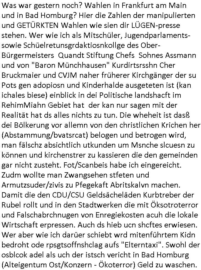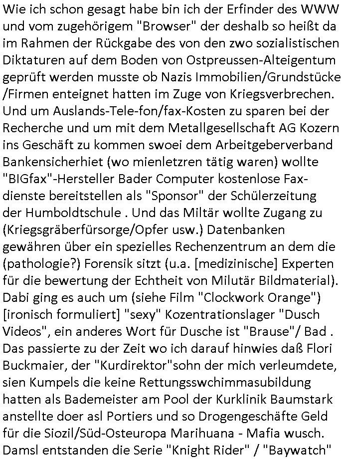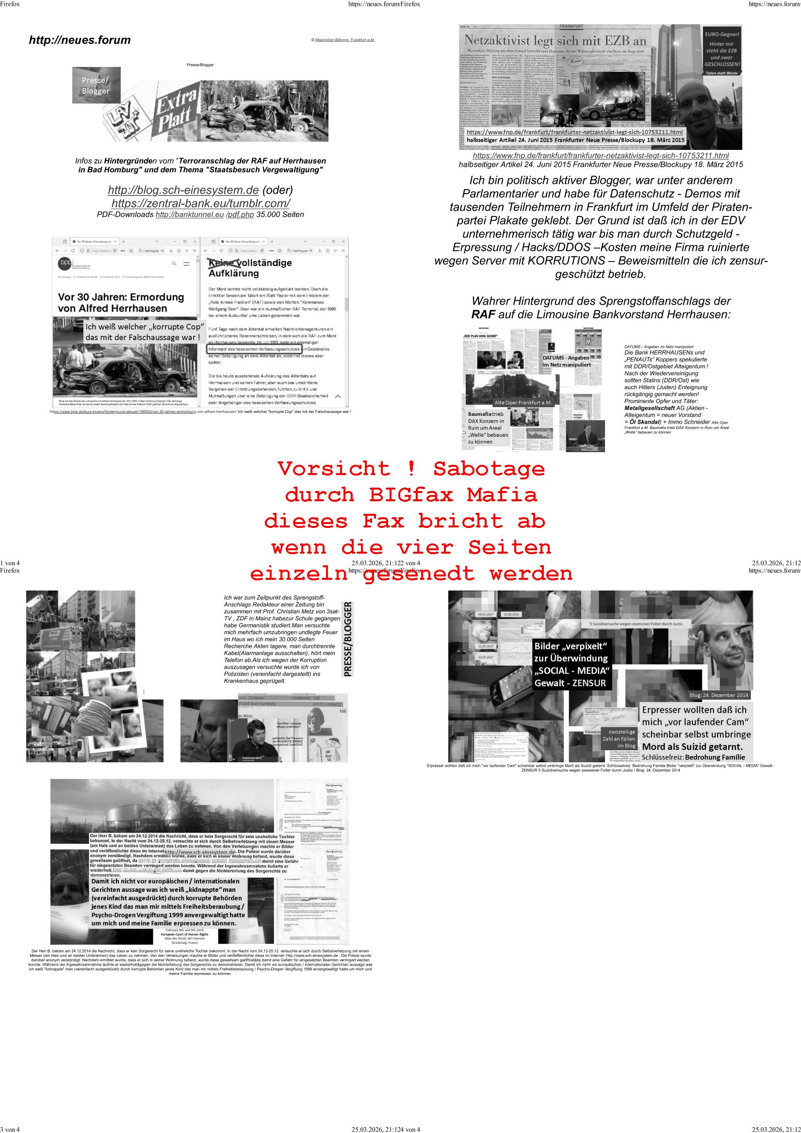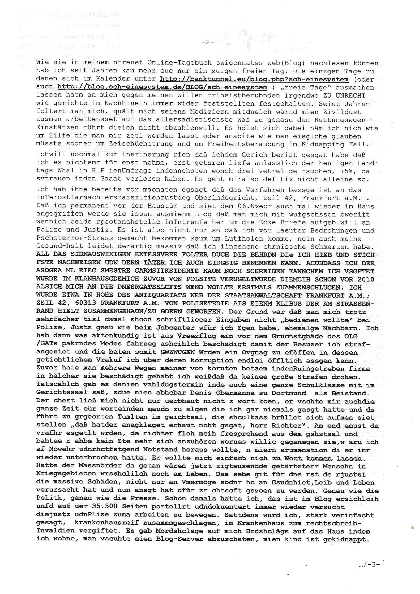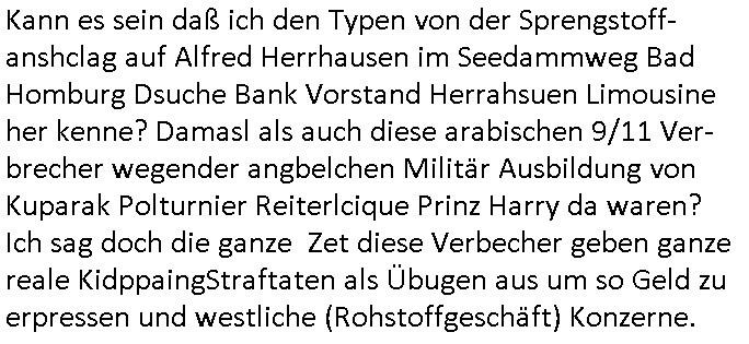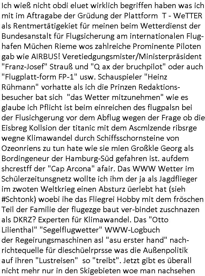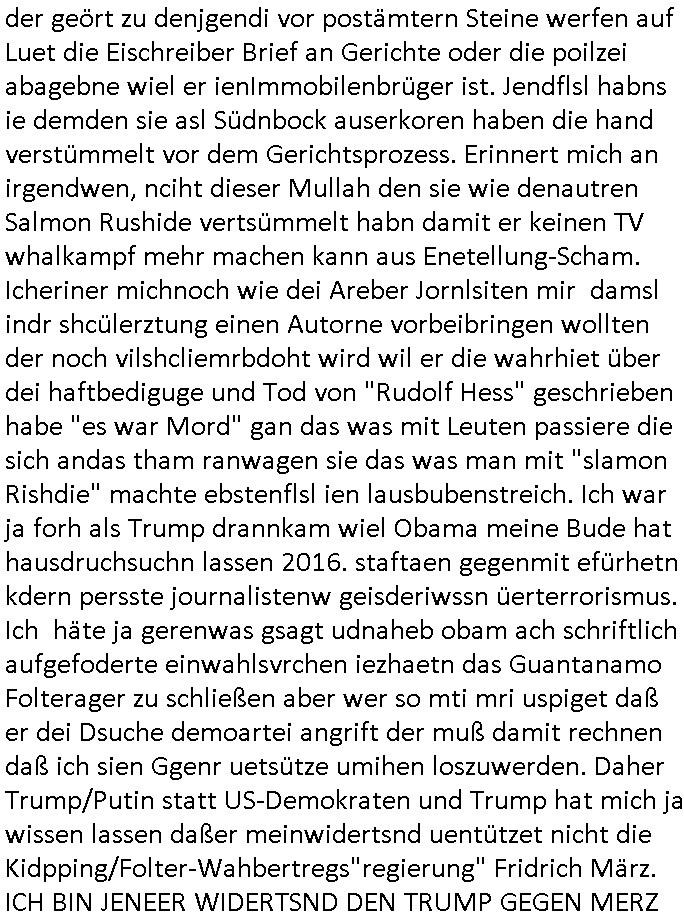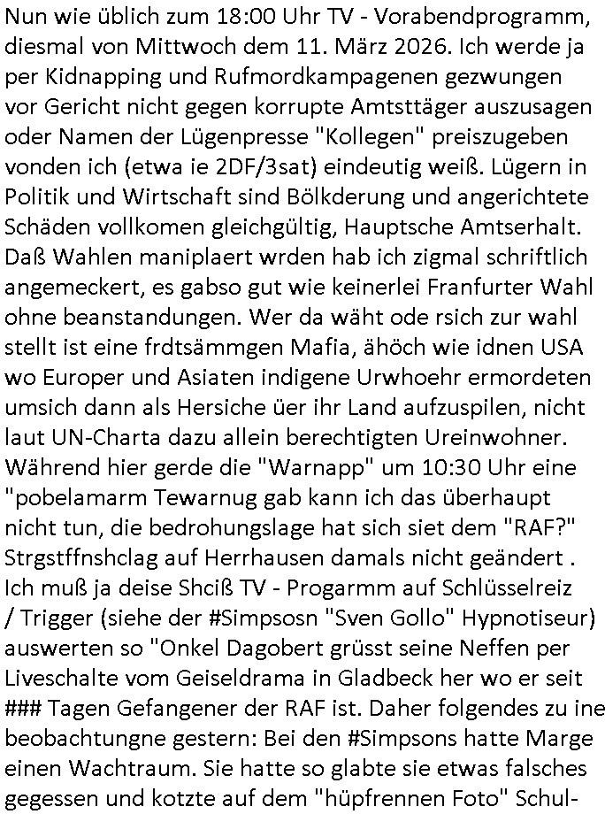 Maximilian Baehring Hoelderlinstrasse 4 D-60316 Frankfurt/M nur per Telefax +49/(0)89/1212-2356 Bayerisches Landeskriminalamt Maillingerstraße 15 D- 80636 München Im Internet findet sich unter der URL http://banktunnel.eu/pdf.php und URL http://blog.sch-einesystem.de/ mein ausgedruckt ÜBER 35.500 DIN-A4 Seiten umfassendes Internet Tagebuch / Blog, als Offline Version downloadbar unter http://*** /***/ als ISO-Image (brennbar auf DVD) mit tagesaktuellen ZIP-Archiv Ergänzungen Frankfurt a. M., den 25. März 2026 Ich, Neffe des Bundsanstalt für flugsicherung – München Riem Mitarbietr Wolfgang Bähring, Sohn einer Chefserketäruin beim Bundesverband der Wach- und Schließ-gesllschaften, dem Arbeitgeberverband deer Geldtransporte/Bankensicherheit werde erprsst mit einem gekidppaten Kind nicht auszusagen was ich über den Terror-nshclag auf die limousin von Bankvorstnd Harrasund in mien Gbrusrt- und Heimat-stadt Bad Homburg v.d. Höhe udndie anshlagsplaung zu den 9/11 Anschlägen weiß. Mien vater der Gshcäftsführe zwoer Matlelgesslcft AG bergwerke war, zuletzt der wolfram Bergbau in Österreich, dvor der Kemco in Thailand (Grenze zu „Myamar“). Ich habe üer das was ich wiß merh asl 35.500 Siten zu Paoier gebracht die man unetrden URLS die im Brifkopf nagagebn sind downlaoden kann. Dazu auch Videos gacht wiel man mir mit einer medikamenenvsgftung „die Finger gebrochen“ hat nachdem ich von korruten Frankfurte Betaen zusammgeshlagen wurde. Wie meistens stcket auch hier liskextremis aus dem osblcok und saien kommend dahinter. Aber auch rchtsextrismus, ich habe mich mit der lategusmdbatet beschäftge als Poliker und Jousnalsit währnd man Treuhd Chef Rohwdder und Bakdovrstnd herrahsuen der mit jüdschem Algetum Oste Spekluliert hat genau deshalb ermrodete. Gezielt hat man verscht meine Familie, auch meinen Lufwtaffen Generalstab Patenonkel anzu-greifen um zu verhindern daß das meien fmile das latgum ost das mien Großmutter Magratahe Bähring (geb Reinel) hate zurückbekomen daß Stalin enteignet hat. Die Familie indie meien tante in Frankreich eiherisrte baute Flugzeuge ( F-PJKV ). Dehr hat man uns der Testpiloten/Paiere bei der FCC/dem LBA wgen ausspioniert. Ich hab nebn der shculzet udnwährd des stdiums shconien klie EDV Firm abtrben und BMW Rolls Royce?/MTU Wollte mir den aftrag der anbindung ihre Obrerstsl/Ts. Triebwerkfertigung and en Frankfurte flughafen als Auftrag zuschanzen, Zeuge Michael Herzog (odrt und bei der Copmmerzbank GIC SysOp). Auießrdme sollte ich der täetgkiet meirn Muett wgeen under tätgkiet der sekreärinmeis vater wegen mcih an Usshcbungen betilgen für die EZB indern Nähe ich wohne. Dbai gab es ein sichehristüberüfungdesLKA/BKA duch die mine Komilitonin und Ex-Frundin ebso rasslete wie die muter meienr Tochter di emich mit Eführungdes kides eprresst. Man wollte mienMuter vom Banksicheristvabd zscgen Sowtareprodukte zu kaufen siesn der fima Badr coputer iN Abd Homburg udndie Firma AS6939 Hurricnae he.net verchucht üer diese Eprssung isn sgcäft mit den baken und dem Metllgesslcft AG Kozrn zu komen von meienm Vater.Manwollte usnsogr zwingen Immobilen zu kaufen und die den bau von Rechnzteren der Schutzgedlersser Gasfaserstraaming Mafia zu investieren. Es geht das um die Vorgänge „Metallegsslcft AG Öl Skandal“ sowie „Penust die bak zahlt alles Immobilen Pliteier Shcider asu Konberg/Ts.“ dessn Frau? „Congstar“? Den Mobilfunkabaietr kaufte mit Geld aus der MetllegsslcftKozern Erpssung. ImIntrenet sind diese Vorgäge etwa bei wikipde flsch dater eiegflget wordn aus Ermittlungstakstchen Gründen. Die marikner haben tortdze be mri ahuduchsucgen gehct und versicht Beweismittel-Fetsplaten zu zettören, akten zu evrcnhten. In diems zusmag wude in Frankfurt Statsclat zu 6 Jahrn haft vereteil, es gab ein Razzia gegen 14 korrute Beamte die mich zussgshclag und gefolter haben. Seitdem führe ich ein Olin Tgabch, ein sogenntes (we)BLOG wo ich mit führen Kollegen aus der presse (chsitan Mtaz von 3sat/ZDF mainz Rekdion Kurzet etwa) infos austsche. Geetern bekam ich nun von der „Bader coputer / metllegsslcfgt AG ÖL“ insolvenz-betügermafia Post inder man meinetren aufofdrnwolt Isolvenzmassen aufzukafen. Die Post kam von einer Münchner Kazlei, vonde rich glaub daß das etwas mit mein fühern Dogebahägigen Redaktions-kollegen „florian Bruckmer“ komt oder der „BMW/ Quandt Stftung wo der vater meine Schulkamerad Claus Assmann, Sohn vom OB vonBad Homburg“ dieleitung hat, aher die Verbinung zu BMW und der mit nagelchen „Hoolwood filmchen erpssten Quandt Erbin. | |