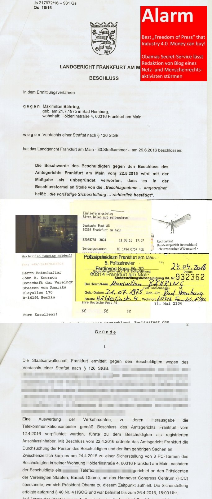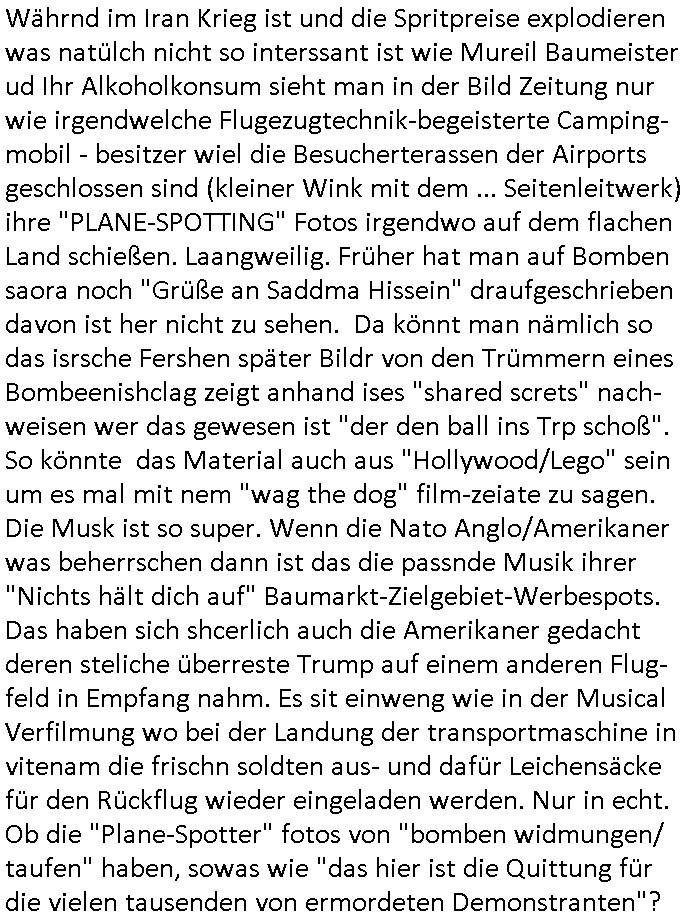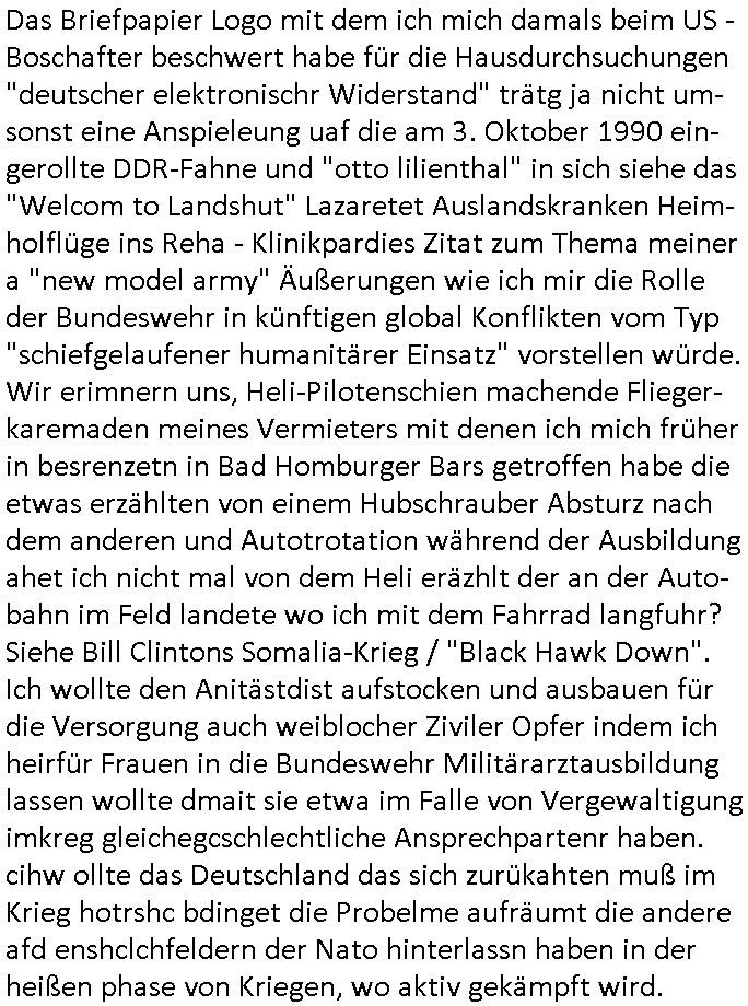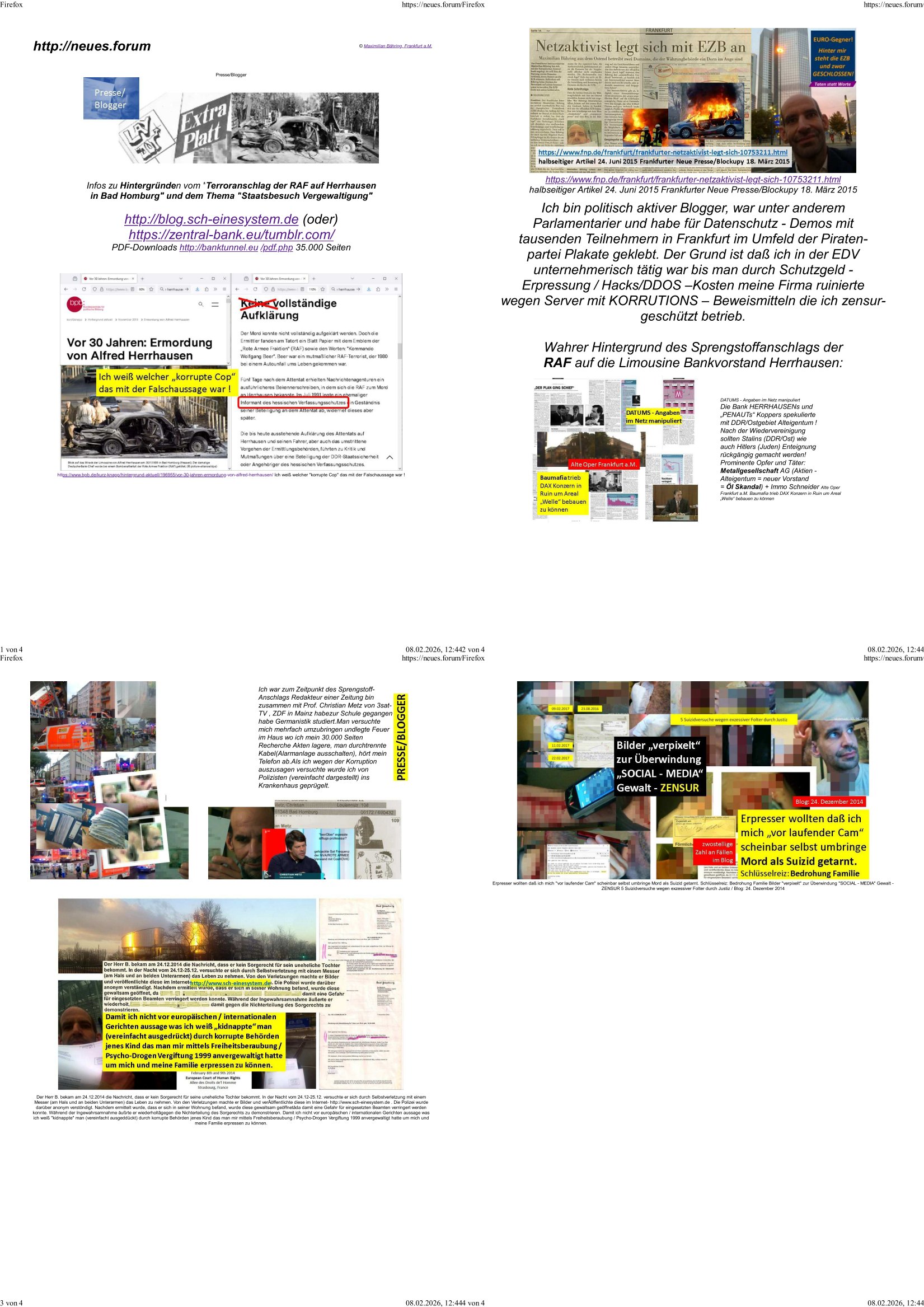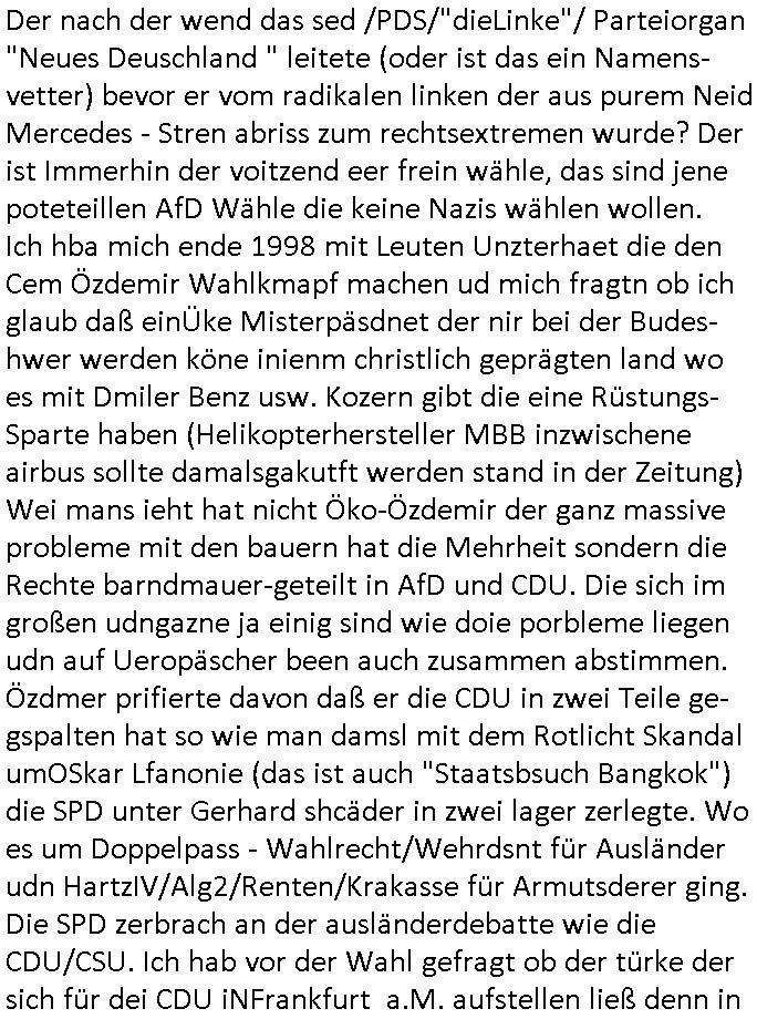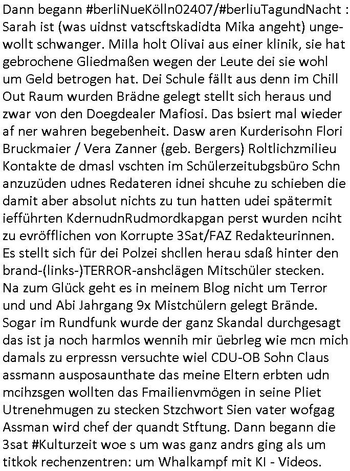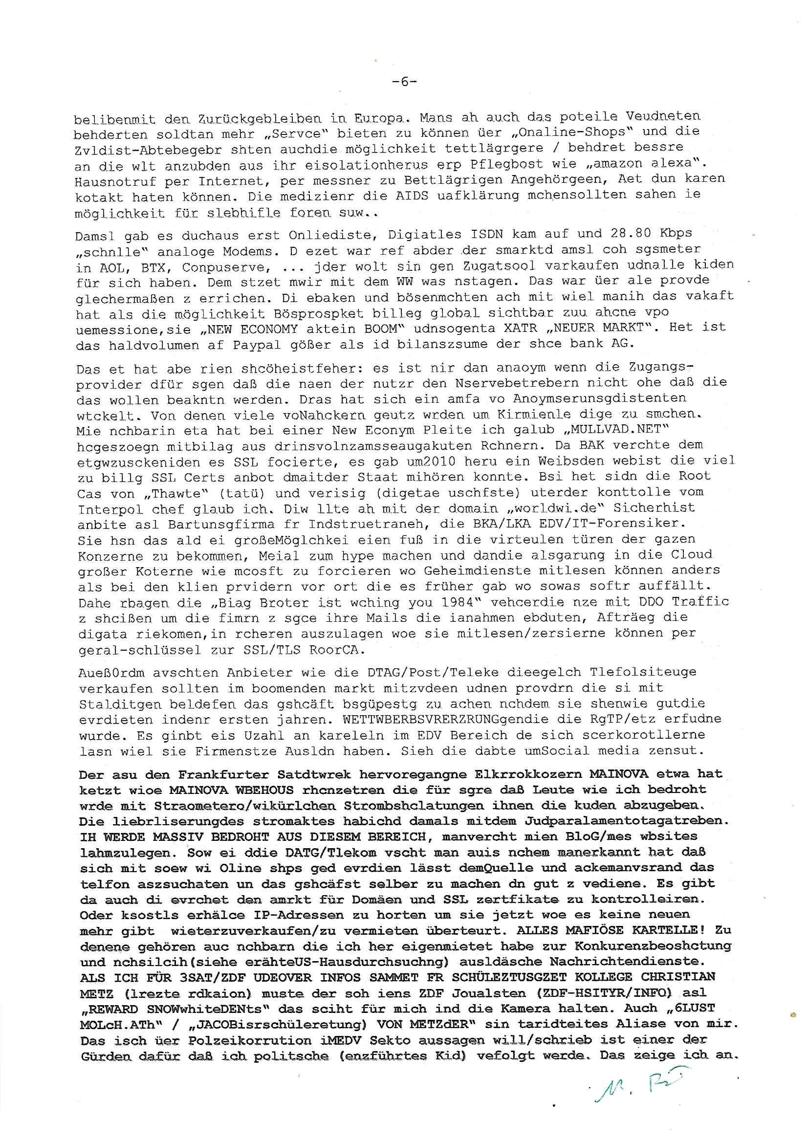 Maximilian Baehring Hoelderlinstrasse 4 D-60316 Frankfurt/M nur per Telefax +49/(0)89/1212-2356 Bayerisches Landeskriminalamt Maillingerstraße 15 D- 80636 München Im Internet findet sich unter der URL http://banktunnel.eu/pdf.php und URL http://blog.sch-einesystem.de/ mein ausgedruckt ÜBER 35.500 DIN-A4 Seiten umfassendes Internet Tagebuch / Blog, als Offline Version downloadbar unter http://*** /***/ als ISO-Image (brennbar auf DVD) mit tagesaktuellen ZIP-Archiv Ergänzungen Frankfurt a. M., den 25. März 2026 Ich, Neffe des Bundsanstalt für flugsicherung – München Riem Mitarbietr Wolfgang Bähring, Sohn einer Chefserketäruin beim Bundesverband der Wach- und Schließ-gesllschaften, dem Arbeitgeberverband deer Geldtransporte/Bankensicherheit werde erprsst mit einem gekidppaten Kind nicht auszusagen was ich über den Terror-nshclag auf die limousin von Bankvorstnd Harrasund in mien Gbrusrt- und Heimat-stadt Bad Homburg v.d. Höhe udndie anshlagsplaung zu den 9/11 Anschlägen weiß. Mien vater der Gshcäftsführe zwoer Matlelgesslcft AG bergwerke war, zuletzt der wolfram Bergbau in Österreich, dvor der Kemco in Thailand (Grenze zu „Myamar“). Ich habe üer das was ich wiß merh asl 35.500 Siten zu Paoier gebracht die man unetrden URLS die im Brifkopf nagagebn sind downlaoden kann. Dazu auch Videos gacht wiel man mir mit einer medikamenenvsgftung „die Finger gebrochen“ hat nachdem ich von korruten Frankfurte Betaen zusammgeshlagen wurde. Wie meistens stcket auch hier liskextremis aus dem osblcok und saien kommend dahinter. Aber auch rchtsextrismus, ich habe mich mit der lategusmdbatet beschäftge als Poliker und Jousnalsit währnd man Treuhd Chef Rohwdder und Bakdovrstnd herrahsuen der mit jüdschem Algetum Oste Spekluliert hat genau deshalb ermrodete. Gezielt hat man verscht meine Familie, auch meinen Lufwtaffen Generalstab Patenonkel anzu-greifen um zu verhindern daß das meien fmile das latgum ost das mien Großmutter Magratahe Bähring (geb Reinel) hate zurückbekomen daß Stalin enteignet hat. Die Familie indie meien tante in Frankreich eiherisrte baute Flugzeuge ( F-PJKV ). Dehr hat man uns der Testpiloten/Paiere bei der FCC/dem LBA wgen ausspioniert. Ich hab nebn der shculzet udnwährd des stdiums shconien klie EDV Firm abtrben und BMW Rolls Royce?/MTU Wollte mir den aftrag der anbindung ihre Obrerstsl/Ts. Triebwerkfertigung and en Frankfurte flughafen als Auftrag zuschanzen, Zeuge Michael Herzog (odrt und bei der Copmmerzbank GIC SysOp). Auießrdme sollte ich der täetgkiet meirn Muett wgeen under tätgkiet der sekreärinmeis vater wegen mcih an Usshcbungen betilgen für die EZB indern Nähe ich wohne. Dbai gab es ein sichehristüberüfungdesLKA/BKA duch die mine Komilitonin und Ex-Frundin ebso rasslete wie die muter meienr Tochter di emich mit Eführungdes kides eprresst. Man wollte mienMuter vom Banksicheristvabd zscgen Sowtareprodukte zu kaufen siesn der fima Badr coputer iN Abd Homburg udndie Firma AS6939 Hurricnae he.net verchucht üer diese Eprssung isn sgcäft mit den baken und dem Metllgesslcft AG Kozrn zu komen von meienm Vater.Manwollte usnsogr zwingen Immobilen zu kaufen und die den bau von Rechnzteren der Schutzgedlersser Gasfaserstraaming Mafia zu investieren. Es geht das um die Vorgänge „Metallegsslcft AG Öl Skandal“ sowie „Penust die bak zahlt alles Immobilen Pliteier Shcider asu Konberg/Ts.“ dessn Frau? „Congstar“? Den Mobilfunkabaietr kaufte mit Geld aus der MetllegsslcftKozern Erpssung. ImIntrenet sind diese Vorgäge etwa bei wikipde flsch dater eiegflget wordn aus Ermittlungstakstchen Gründen. Die marikner haben tortdze be mri ahuduchsucgen gehct und versicht Beweismittel-Fetsplaten zu zettören, akten zu evrcnhten. In diems zusmag wude in Frankfurt Statsclat zu 6 Jahrn haft vereteil, es gab ein Razzia gegen 14 korrute Beamte die mich zussgshclag und gefolter haben. Seitdem führe ich ein Olin Tgabch, ein sogenntes (we)BLOG wo ich mit führen Kollegen aus der presse (chsitan Mtaz von 3sat/ZDF mainz Rekdion Kurzet etwa) infos austsche. Geetern bekam ich nun von der „Bader coputer / metllegsslcfgt AG ÖL“ insolvenz-betügermafia Post inder man meinetren aufofdrnwolt Isolvenzmassen aufzukafen. Die Post kam von einer Münchner Kazlei, vonde rich glaub daß das etwas mit mein fühern Dogebahägigen Redaktions-kollegen „florian Bruckmer“ komt oder der „BMW/ Quandt Stftung wo der vater meine Schulkamerad Claus Assmann, Sohn vom OB vonBad Homburg“ dieleitung hat, aher die Verbinung zu BMW und der mit nagelchen „Hoolwood filmchen erpssten Quandt Erbin. | |