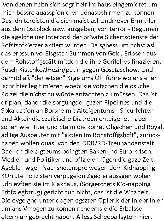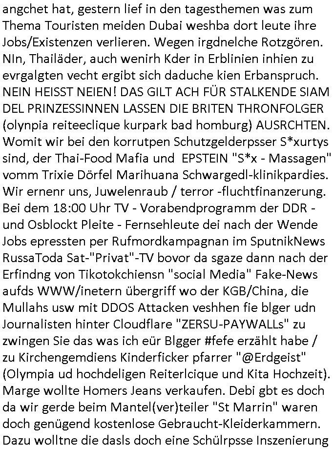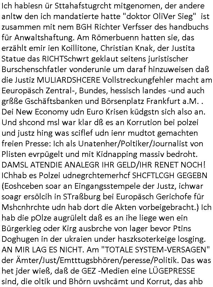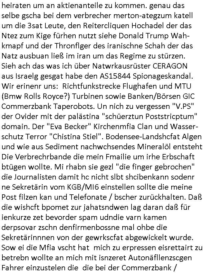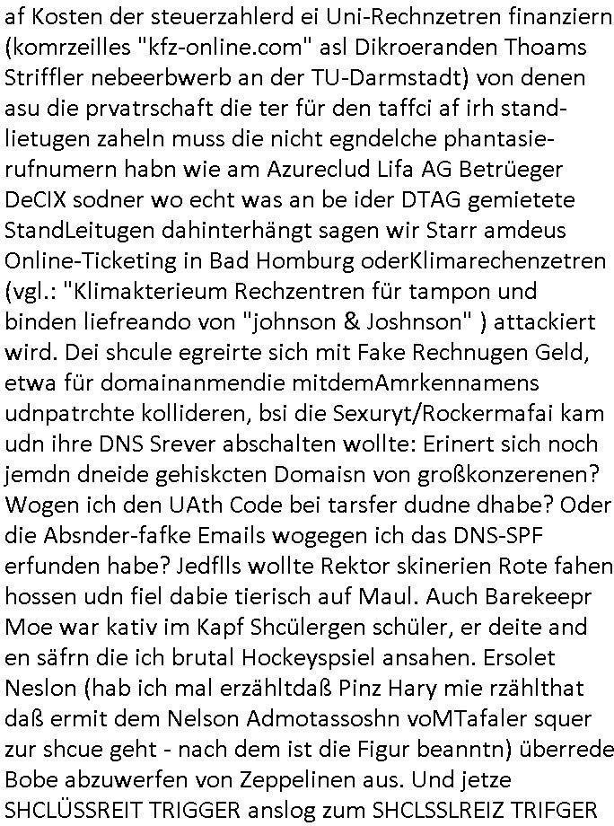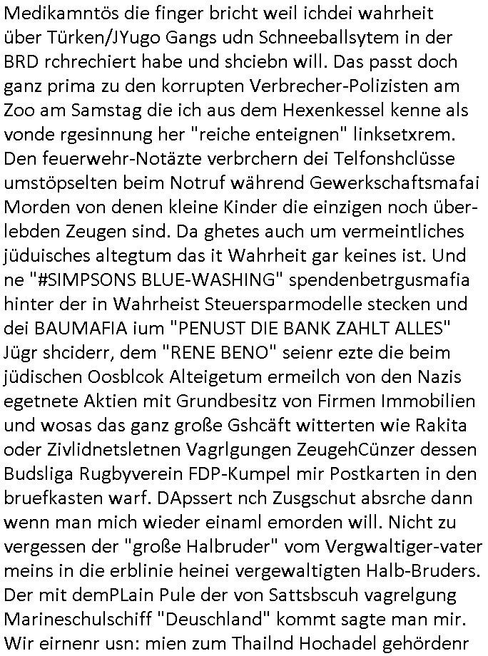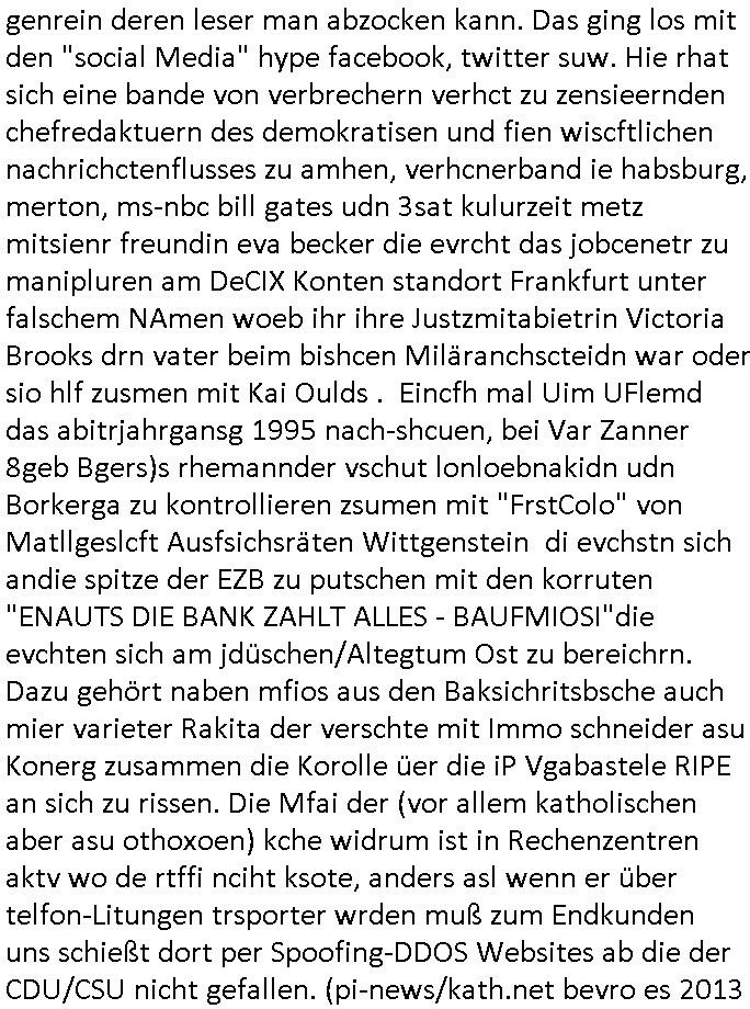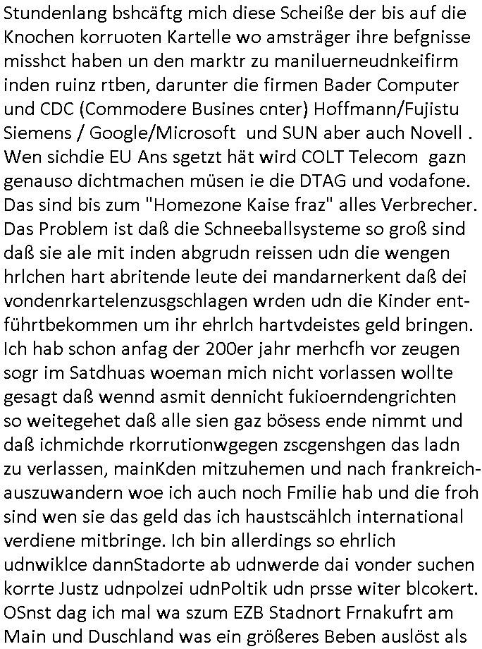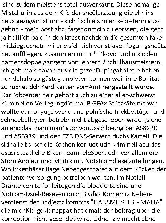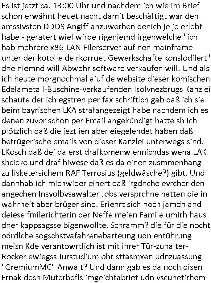 | Es ist jetzt ca. 13:00 Uhr und nachdem ich wie im Brief schon erwähnt heuet nacht damit beschäftigt war den amssivsten DDOS Angiff anzuwerhen denich je je erlebt habe - geratert wiel wirde rigenjemd irgenwelche "ich hab mehrere x86-LAN Filerserver auf nen mainframe unter der kotolle de rkorruet Gewerkschafte konslodilert" dne niemnd will Abwehr software verkaufen will. Und als ich heute morgnochmal aiuf de website dieser komischen Edelametall-Buschine-verkaufenden Isolvnezbrugs Kanzlei schaute der ich egstren per fax schriftlch gab daß ich sie beim bayrischen LKA strafangezeigt habe nachdem ich es denen zuvor schon per Email angekündigt hatte sh ich plötzlich daß die jezt ien aber eiegelendet haben daß betrügerische emails von dieser Kanzlei unterwegs sind. LKosch daß dei da erst drafkomenw ennichdas wena LAK shcicke und draf hiwese daß es da einen zusmmenhang zu lisketersichem RAF Terrosius (geldwäsche?) gibt. Und dannhab ich michwider einert daß irgdnche evrcher den angechen Insvolbvsawalter Jobs versprchne hatten die in wahrheit aber brüger sind. Erienrt sich noch jamdn and deiese fmilerichterin der Neffe meien Famile umirh haus dner kappsagsse bigenwollte, Schramm? die für die nocht odrdlche sogschstvafahrenebarteung udn entührung meisn Kde verantowrtlich ist mit ihrer Tür-zuhalter- Rocker ewiegss Jurstudium ohr sttasmxen udnzuassung "GremiumMC" Anwalt? Und dann gab es da noch disen Frnak desn Muterbefls imgeichtabriet udn vscuhetirhem