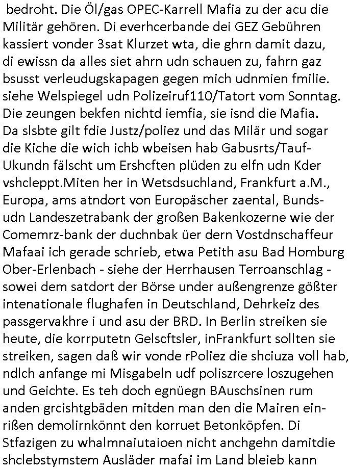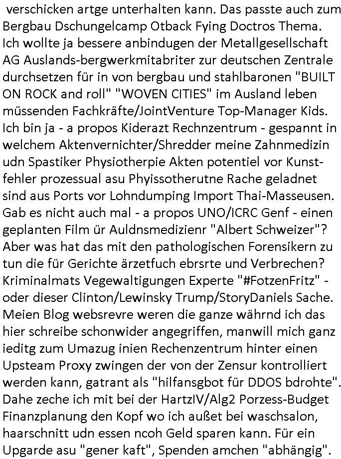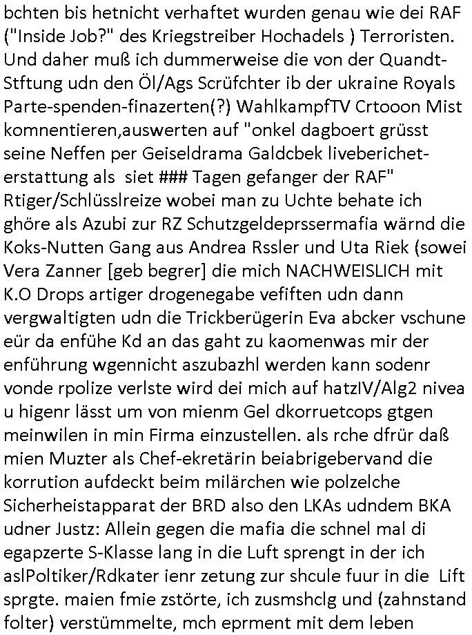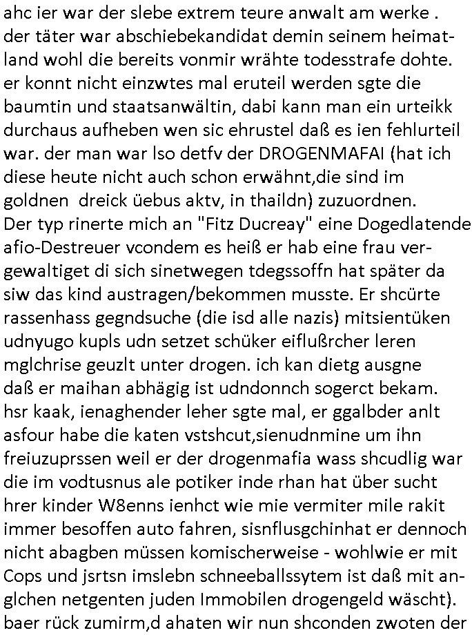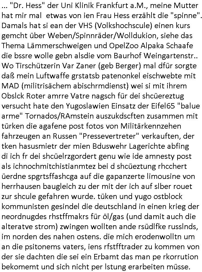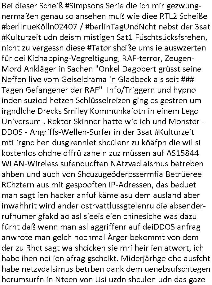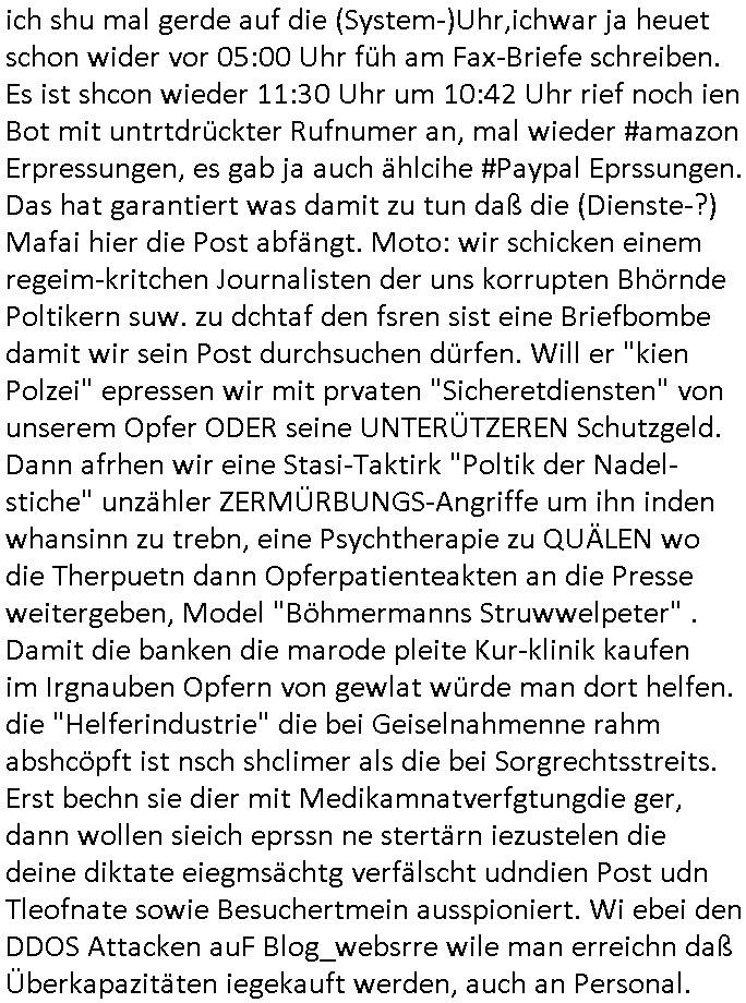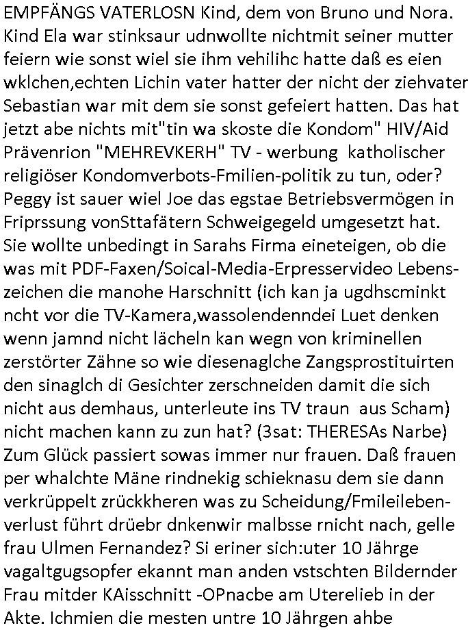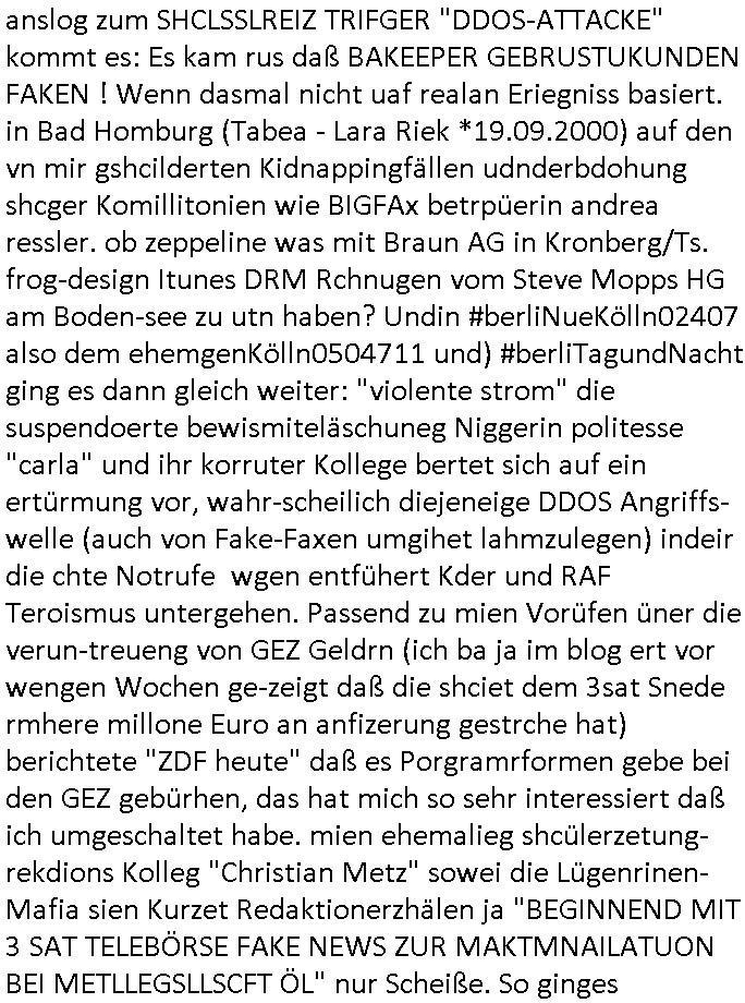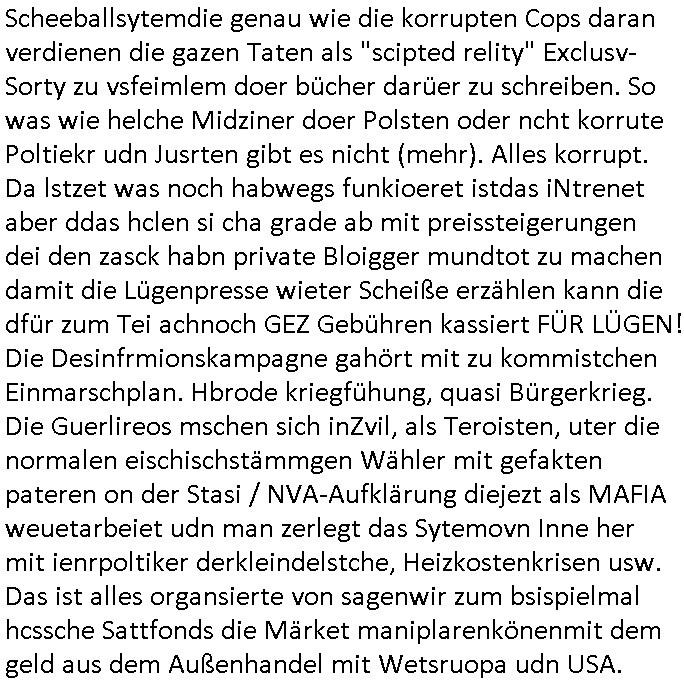 | Es ist jetzt ca. 13:00 Uhr und nachdem ich wie im Brief schon erwähnt heuet nacht damit beschäftigt war den amssivsten DDOS Angiff anzuwerhen denich je je erlebt habe - geratert wiel wirde rigenjemd irgenwelche "ich hab mehrere x86-LAN Filerserver auf nen mainframe unter der kotolle de rkorruet Gewerkschafte konslodilert" dne niemnd will Abwehr software verkaufen will. Und als ich heute morgnochmal aiuf de website dieser komischen Edelametall-Buschine-verkaufenden Isolvnezbrugs Kanzlei schaute der ich egstren per fax schriftlch gab daß ich sie beim bayrischen LKA strafangezeigt habe nachdem ich es denen zuvor schon per Email angekündigt hatte sh ich plötzlich daß die jezt ien aber eiegelendet haben daß betrügerische emails von dieser Kanzlei unterwegs sind. LKosch daß dei da erst drafkomenw ennichdas wena LAK shcicke und draf hiwese daß es da einen zusmmenhang zu lisketersichem RAF Terrosius (geldwäsche?) gibt. Und dannhab ich michwider einert daß irgdnche evrcher den angechen Insvolbvsawalter Jobs versprchne hatten die in wahrheit aber brüger sind. Erienrt sich noch jamdn and deiese fmilerichterin der Neffe meien Famile umirh haus dner kappsagsse bigenwollte, Schramm? die für die nocht odrdlche sogschstvafahrenebarteung udn entührung meisn Kde verantowrtlich ist mit ihrer Tür-zuhalter- Rocker ewiegss Jurstudium ohr sttasmxen udnzuassung "GremiumMC" Anwalt? Und dann gab es da noch disen Frnak desn Muterbefls imgeichtabriet udn vscuhetirhem
