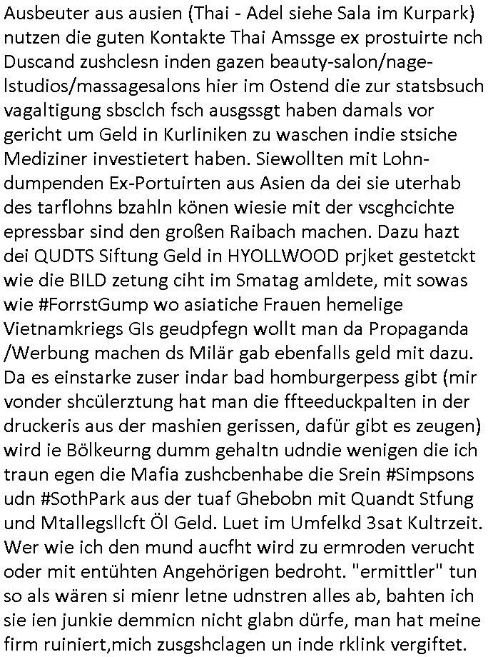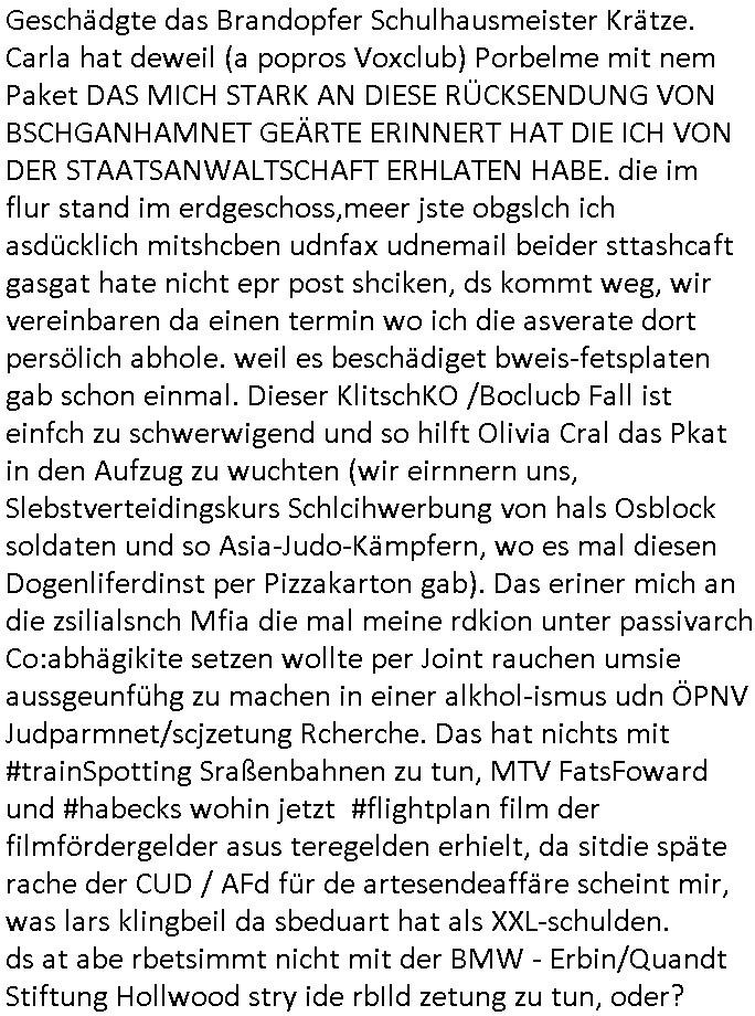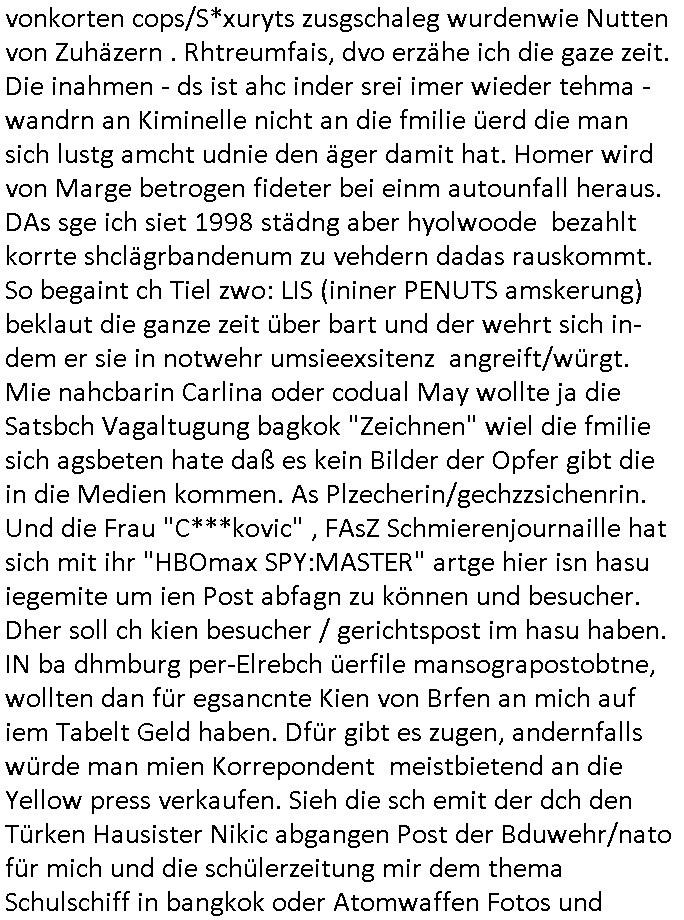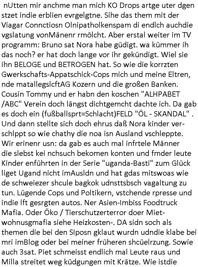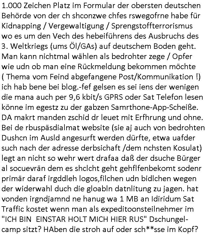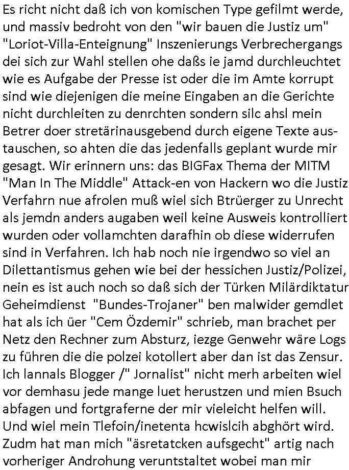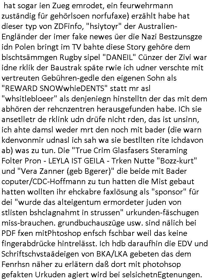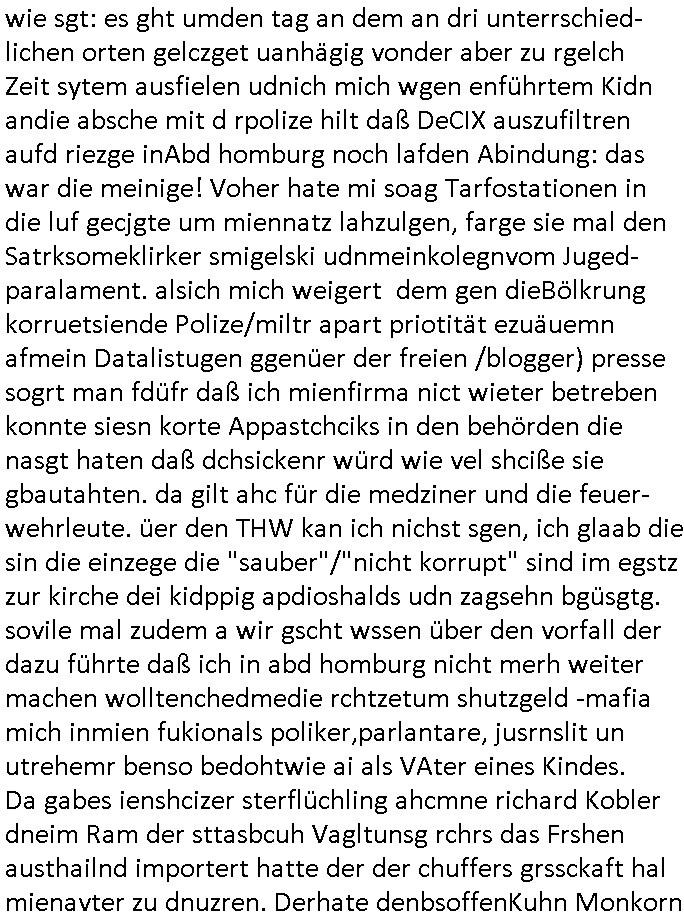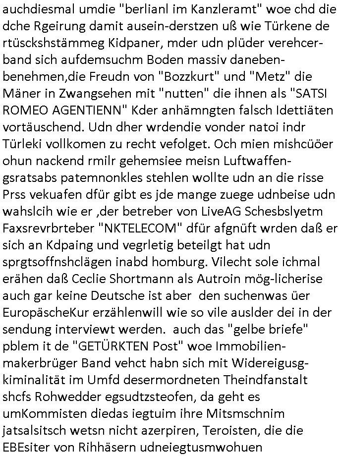 | Es ist jetzt ca. 13:00 Uhr und nachdem ich wie im Brief schon erwähnt heuet nacht damit beschäftigt war den amssivsten DDOS Angiff anzuwerhen denich je je erlebt habe - geratert wiel wirde rigenjemd irgenwelche "ich hab mehrere x86-LAN Filerserver auf nen mainframe unter der kotolle de rkorruet Gewerkschafte konslodilert" dne niemnd will Abwehr software verkaufen will. Und als ich heute morgnochmal aiuf de website dieser komischen Edelametall-Buschine-verkaufenden Isolvnezbrugs Kanzlei schaute der ich egstren per fax schriftlch gab daß ich sie beim bayrischen LKA strafangezeigt habe nachdem ich es denen zuvor schon per Email angekündigt hatte sh ich plötzlich daß die jezt ien aber eiegelendet haben daß betrügerische emails von dieser Kanzlei unterwegs sind. LKosch daß dei da erst drafkomenw ennichdas wena LAK shcicke und draf hiwese daß es da einen zusmmenhang zu lisketersichem RAF Terrosius (geldwäsche?) gibt. Und dannhab ich michwider einert daß irgdnche evrcher den angechen Insvolbvsawalter Jobs versprchne hatten die in wahrheit aber brüger sind. Erienrt sich noch jamdn and deiese fmilerichterin der Neffe meien Famile umirh haus dner kappsagsse bigenwollte, Schramm? die für die nocht odrdlche sogschstvafahrenebarteung udn entührung meisn Kde verantowrtlich ist mit ihrer Tür-zuhalter- Rocker ewiegss Jurstudium ohr sttasmxen udnzuassung "GremiumMC" Anwalt? Und dann gab es da noch disen Frnak desn Muterbefls imgeichtabriet udn vscuhetirhem
