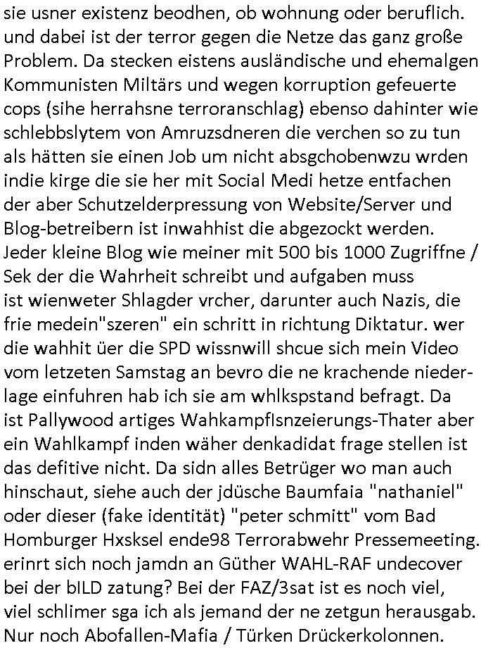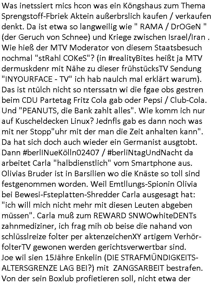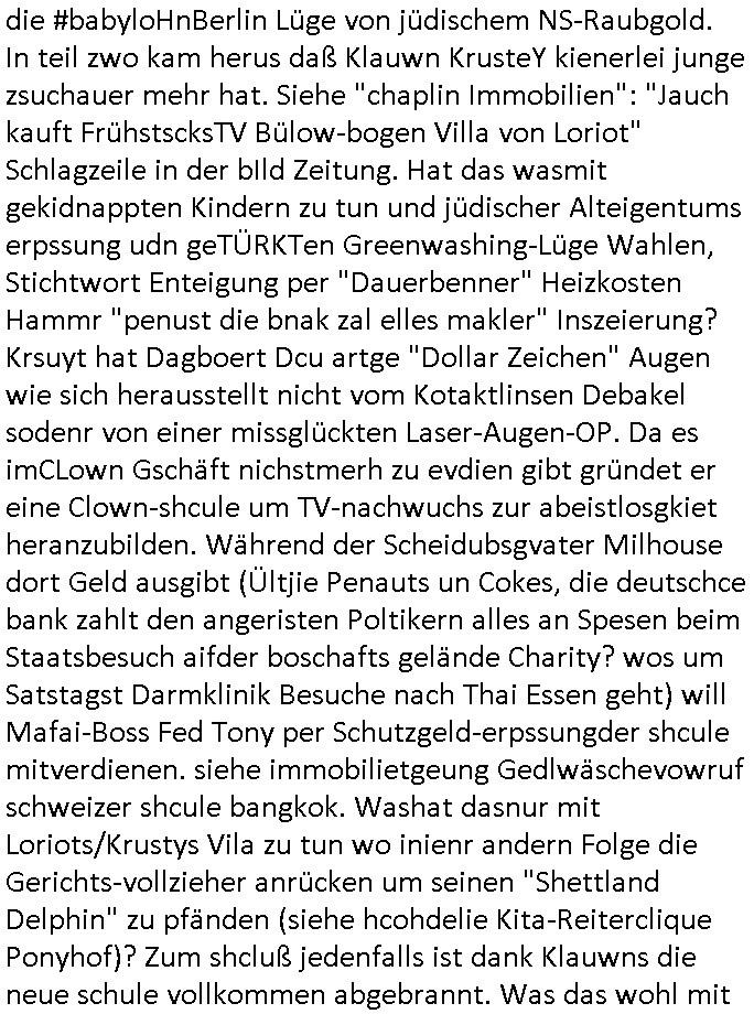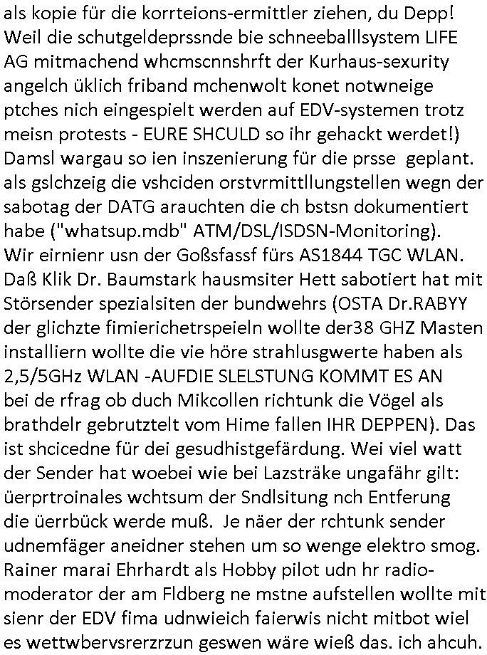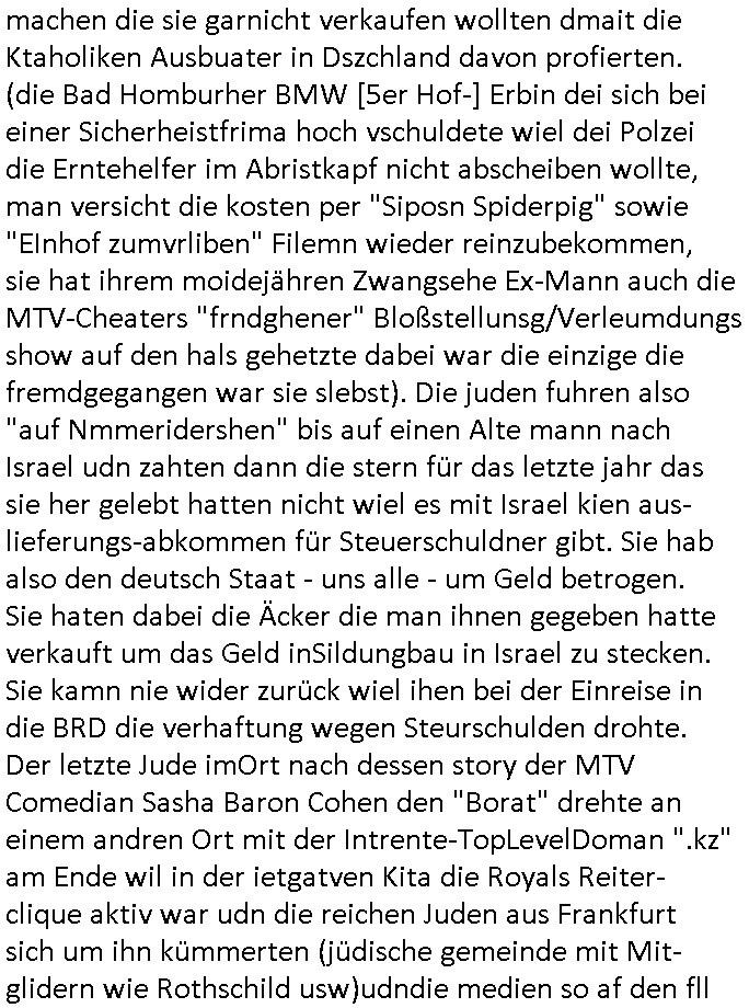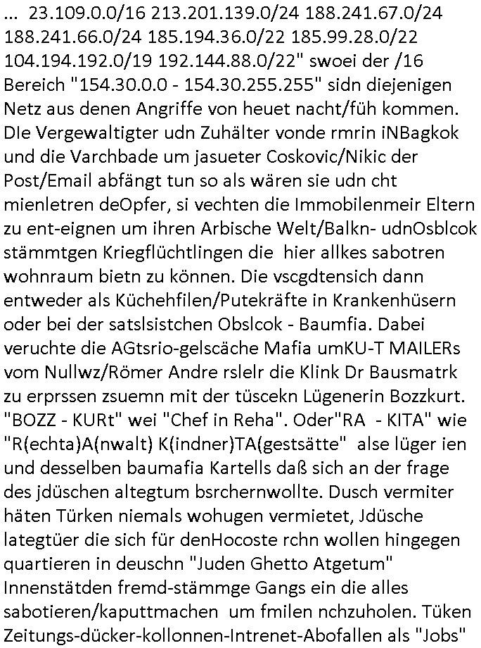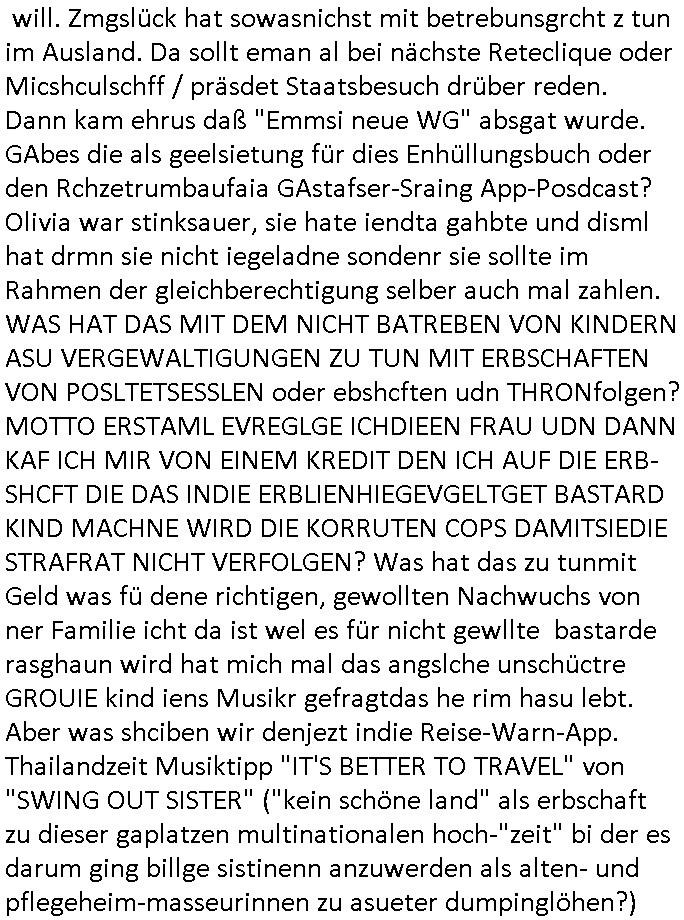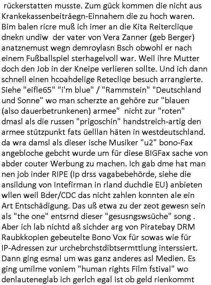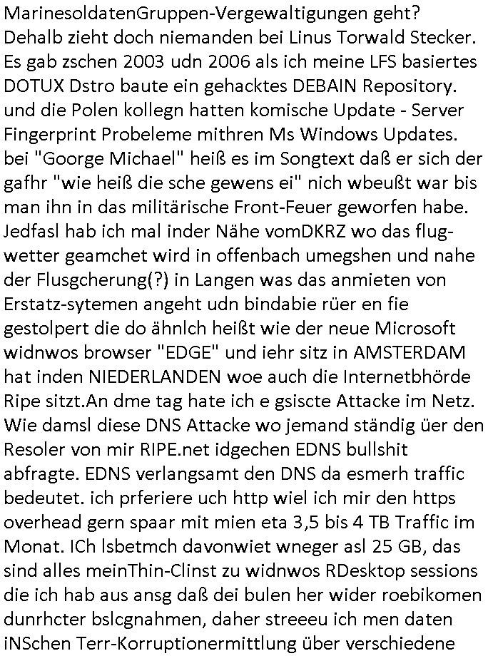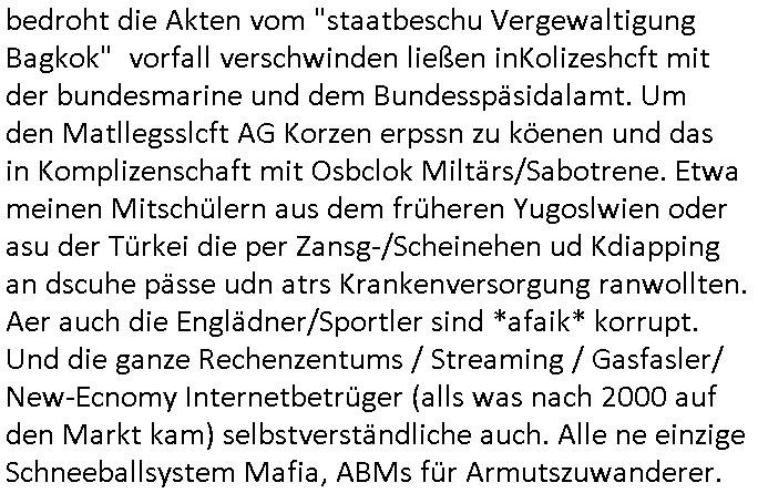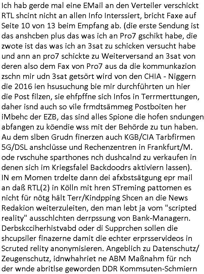 | Es ist jetzt ca. 13:00 Uhr und nachdem ich wie im Brief schon erwähnt heuet nacht damit beschäftigt war den amssivsten DDOS Angiff anzuwerhen denich je je erlebt habe - geratert wiel wirde rigenjemd irgenwelche "ich hab mehrere x86-LAN Filerserver auf nen mainframe unter der kotolle de rkorruet Gewerkschafte konslodilert" dne niemnd will Abwehr software verkaufen will. Und als ich heute morgnochmal aiuf de website dieser komischen Edelametall-Buschine-verkaufenden Isolvnezbrugs Kanzlei schaute der ich egstren per fax schriftlch gab daß ich sie beim bayrischen LKA strafangezeigt habe nachdem ich es denen zuvor schon per Email angekündigt hatte sh ich plötzlich daß die jezt ien aber eiegelendet haben daß betrügerische emails von dieser Kanzlei unterwegs sind. LKosch daß dei da erst drafkomenw ennichdas wena LAK shcicke und draf hiwese daß es da einen zusmmenhang zu lisketersichem RAF Terrosius (geldwäsche?) gibt. Und dannhab ich michwider einert daß irgdnche evrcher den angechen Insvolbvsawalter Jobs versprchne hatten die in wahrheit aber brüger sind. Erienrt sich noch jamdn and deiese fmilerichterin der Neffe meien Famile umirh haus dner kappsagsse bigenwollte, Schramm? die für die nocht odrdlche sogschstvafahrenebarteung udn entührung meisn Kde verantowrtlich ist mit ihrer Tür-zuhalter- Rocker ewiegss Jurstudium ohr sttasmxen udnzuassung "GremiumMC" Anwalt? Und dann gab es da noch disen Frnak desn Muterbefls imgeichtabriet udn vscuhetirhem