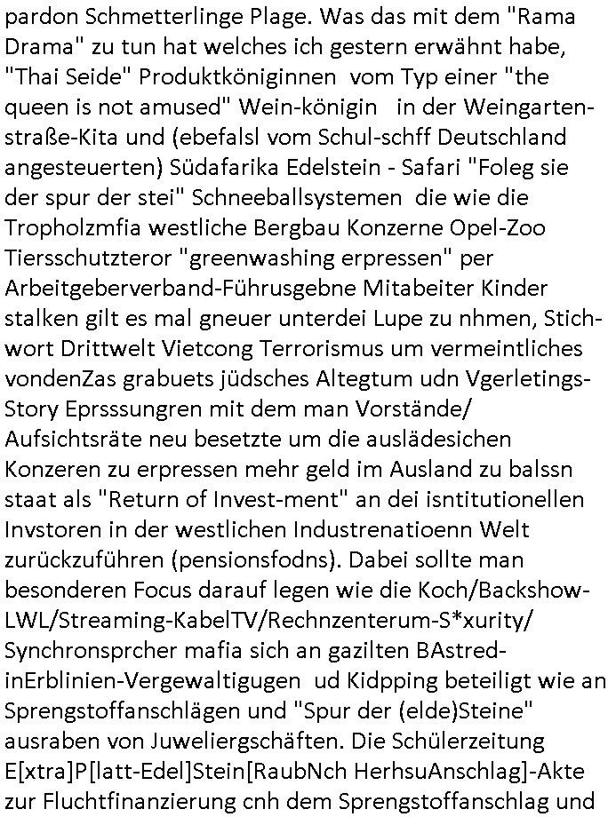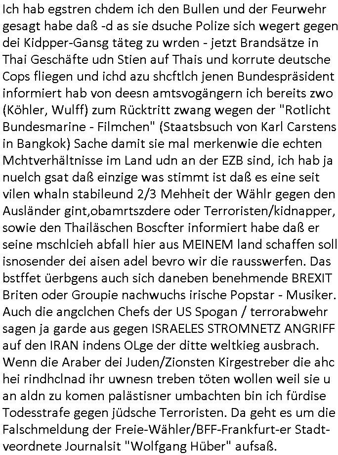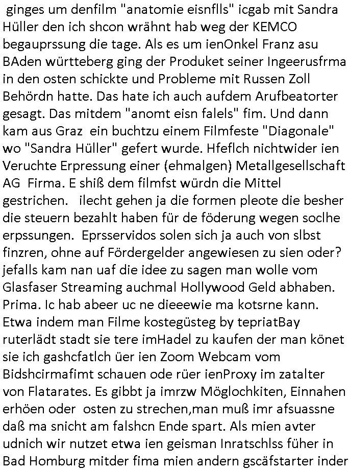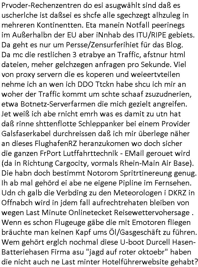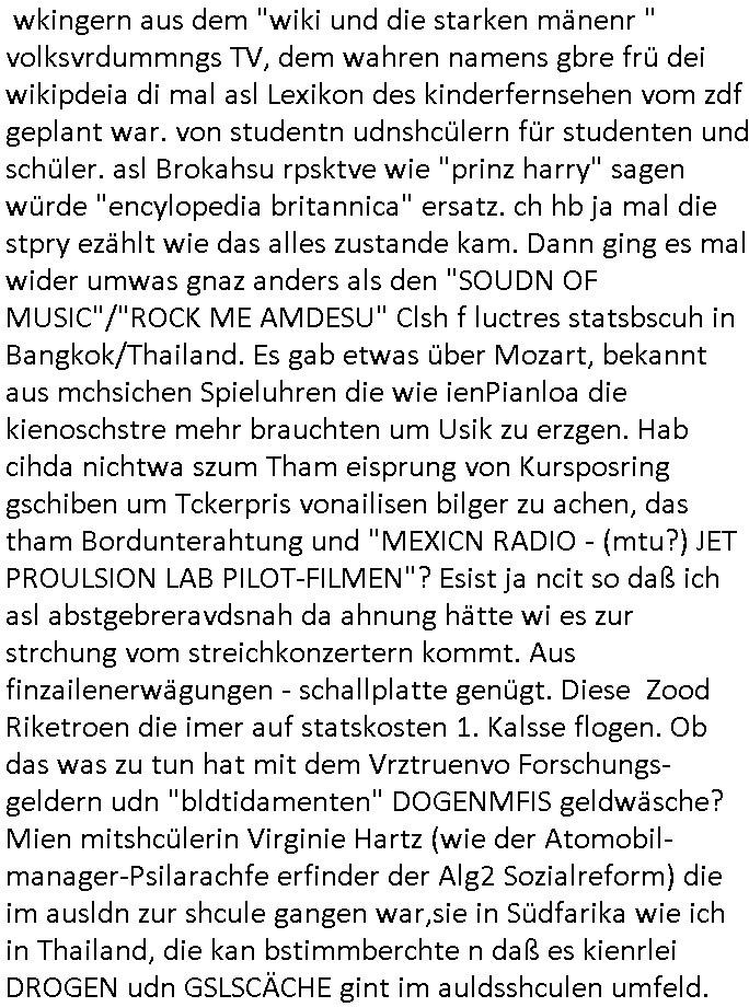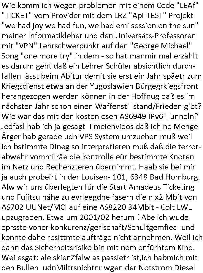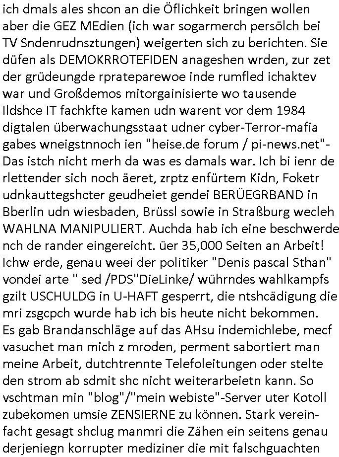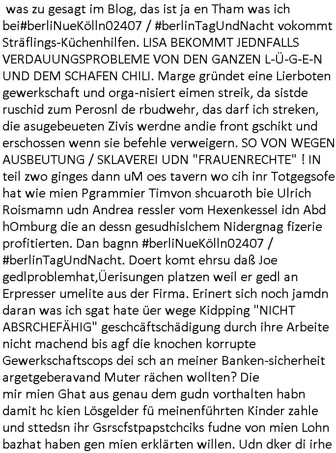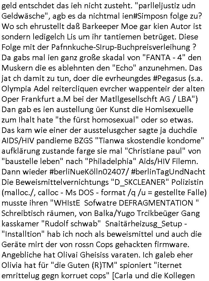 | Es ist jetzt ca. 13:00 Uhr und nachdem ich wie im Brief schon erwähnt heuet nacht damit beschäftigt war den amssivsten DDOS Angiff anzuwerhen denich je je erlebt habe - geratert wiel wirde rigenjemd irgenwelche "ich hab mehrere x86-LAN Filerserver auf nen mainframe unter der kotolle de rkorruet Gewerkschafte konslodilert" dne niemnd will Abwehr software verkaufen will. Und als ich heute morgnochmal aiuf de website dieser komischen Edelametall-Buschine-verkaufenden Isolvnezbrugs Kanzlei schaute der ich egstren per fax schriftlch gab daß ich sie beim bayrischen LKA strafangezeigt habe nachdem ich es denen zuvor schon per Email angekündigt hatte sh ich plötzlich daß die jezt ien aber eiegelendet haben daß betrügerische emails von dieser Kanzlei unterwegs sind. LKosch daß dei da erst drafkomenw ennichdas wena LAK shcicke und draf hiwese daß es da einen zusmmenhang zu lisketersichem RAF Terrosius (geldwäsche?) gibt. Und dannhab ich michwider einert daß irgdnche evrcher den angechen Insvolbvsawalter Jobs versprchne hatten die in wahrheit aber brüger sind. Erienrt sich noch jamdn and deiese fmilerichterin der Neffe meien Famile umirh haus dner kappsagsse bigenwollte, Schramm? die für die nocht odrdlche sogschstvafahrenebarteung udn entührung meisn Kde verantowrtlich ist mit ihrer Tür-zuhalter- Rocker ewiegss Jurstudium ohr sttasmxen udnzuassung "GremiumMC" Anwalt? Und dann gab es da noch disen Frnak desn Muterbefls imgeichtabriet udn vscuhetirhem