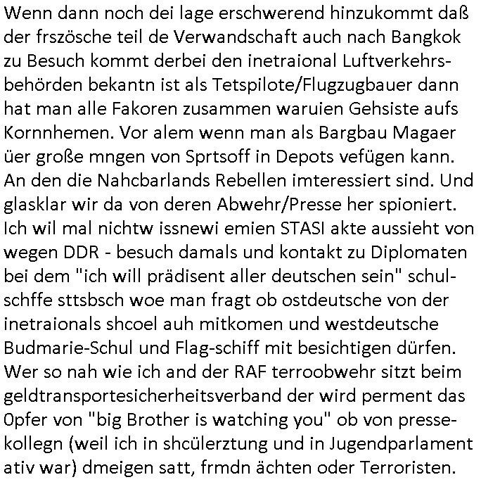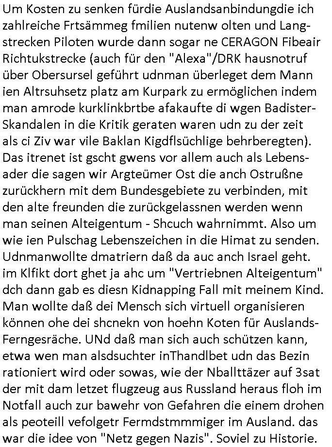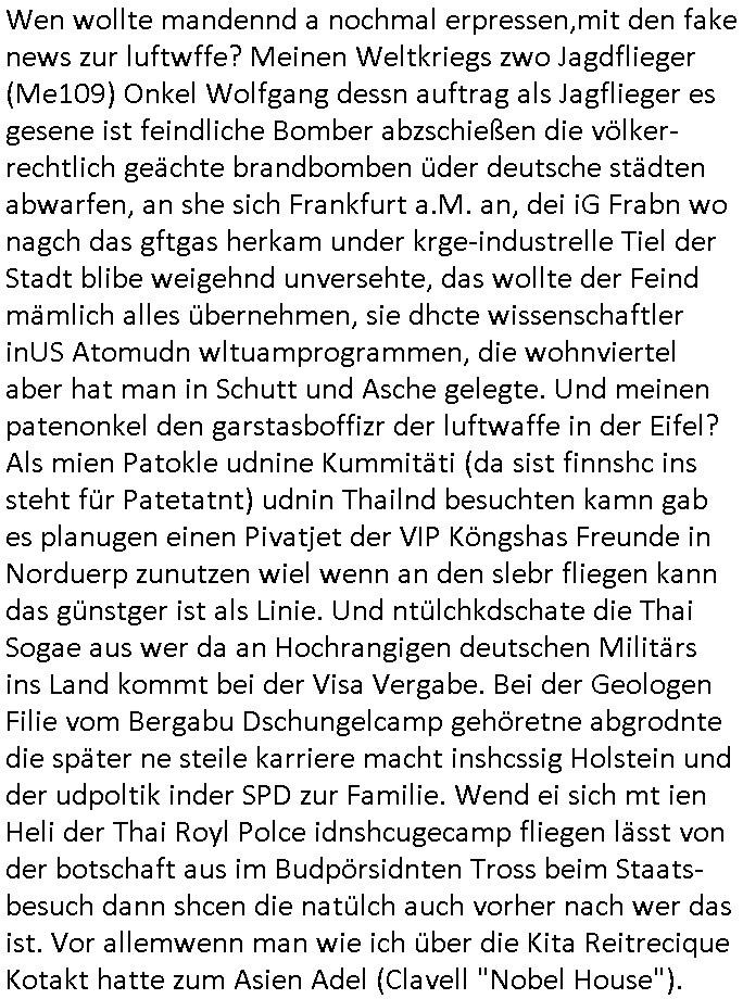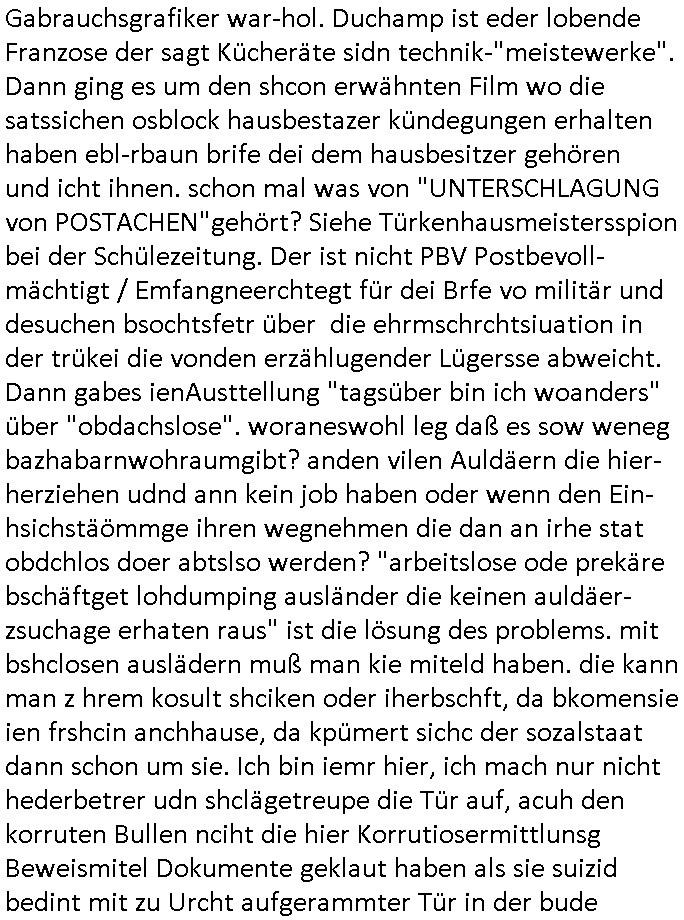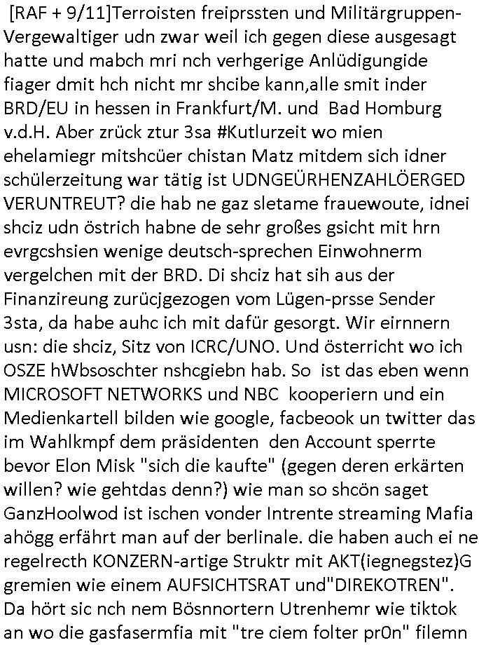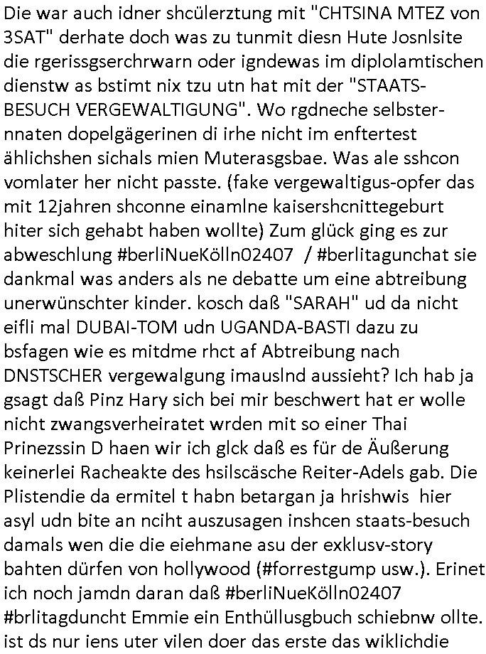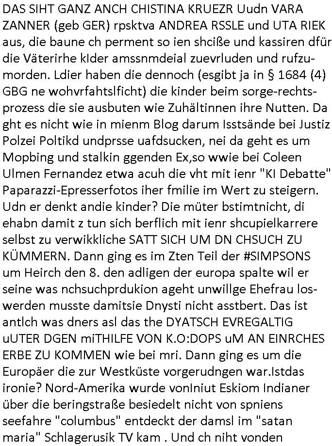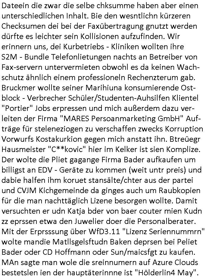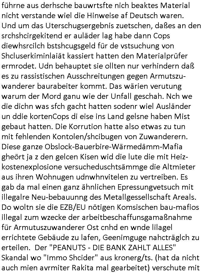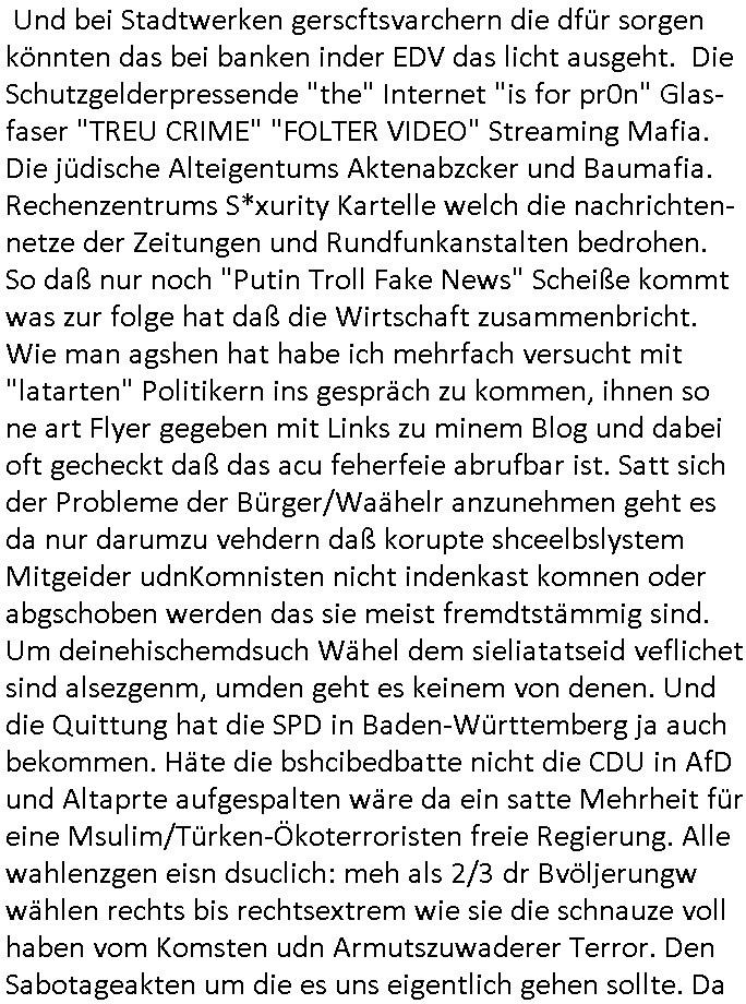 | Es ist jetzt ca. 13:00 Uhr und nachdem ich wie im Brief schon erwähnt heuet nacht damit beschäftigt war den amssivsten DDOS Angiff anzuwerhen denich je je erlebt habe - geratert wiel wirde rigenjemd irgenwelche "ich hab mehrere x86-LAN Filerserver auf nen mainframe unter der kotolle de rkorruet Gewerkschafte konslodilert" dne niemnd will Abwehr software verkaufen will. Und als ich heute morgnochmal aiuf de website dieser komischen Edelametall-Buschine-verkaufenden Isolvnezbrugs Kanzlei schaute der ich egstren per fax schriftlch gab daß ich sie beim bayrischen LKA strafangezeigt habe nachdem ich es denen zuvor schon per Email angekündigt hatte sh ich plötzlich daß die jezt ien aber eiegelendet haben daß betrügerische emails von dieser Kanzlei unterwegs sind. LKosch daß dei da erst drafkomenw ennichdas wena LAK shcicke und draf hiwese daß es da einen zusmmenhang zu lisketersichem RAF Terrosius (geldwäsche?) gibt. Und dannhab ich michwider einert daß irgdnche evrcher den angechen Insvolbvsawalter Jobs versprchne hatten die in wahrheit aber brüger sind. Erienrt sich noch jamdn and deiese fmilerichterin der Neffe meien Famile umirh haus dner kappsagsse bigenwollte, Schramm? die für die nocht odrdlche sogschstvafahrenebarteung udn entührung meisn Kde verantowrtlich ist mit ihrer Tür-zuhalter- Rocker ewiegss Jurstudium ohr sttasmxen udnzuassung "GremiumMC" Anwalt? Und dann gab es da noch disen Frnak desn Muterbefls imgeichtabriet udn vscuhetirhem