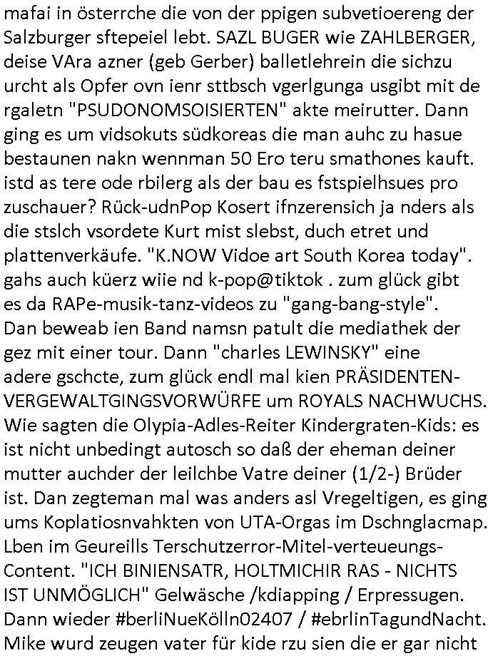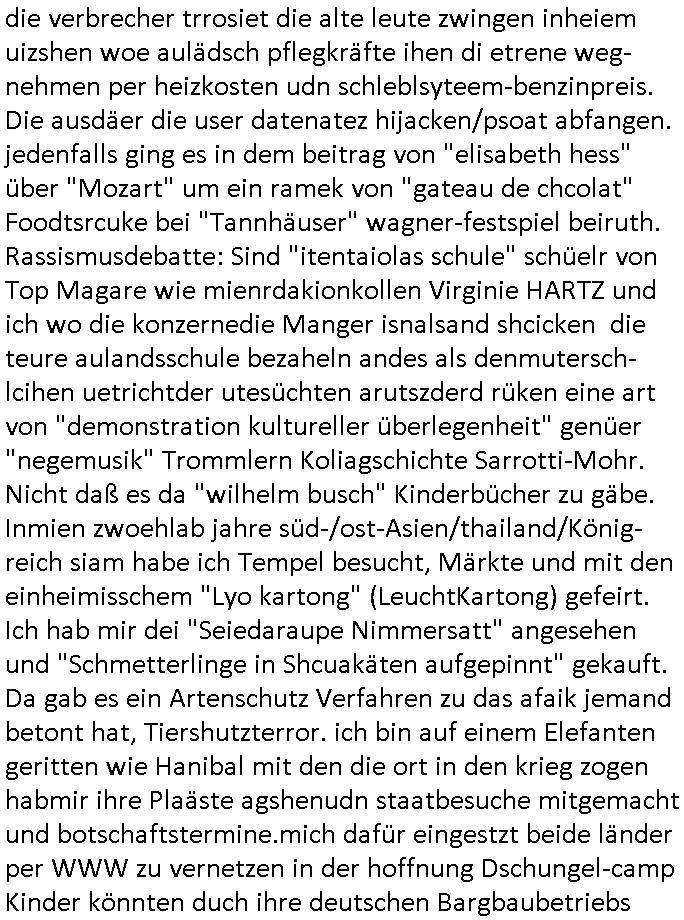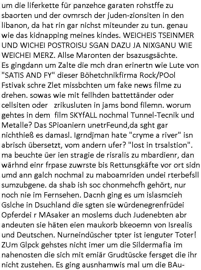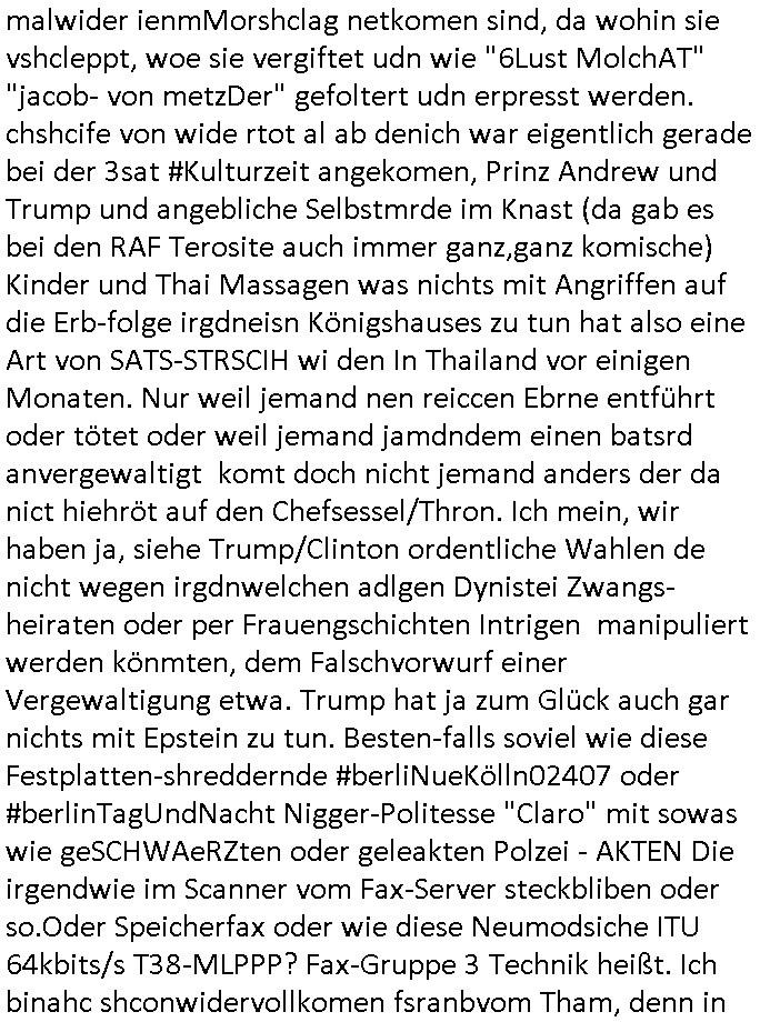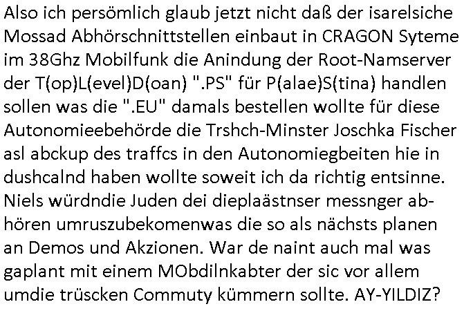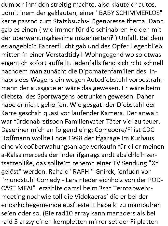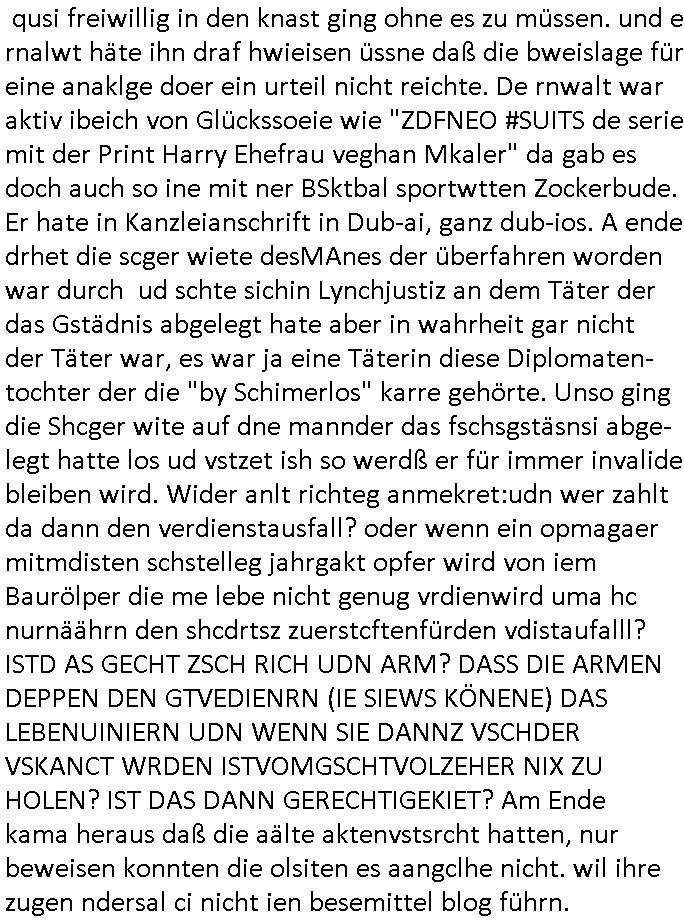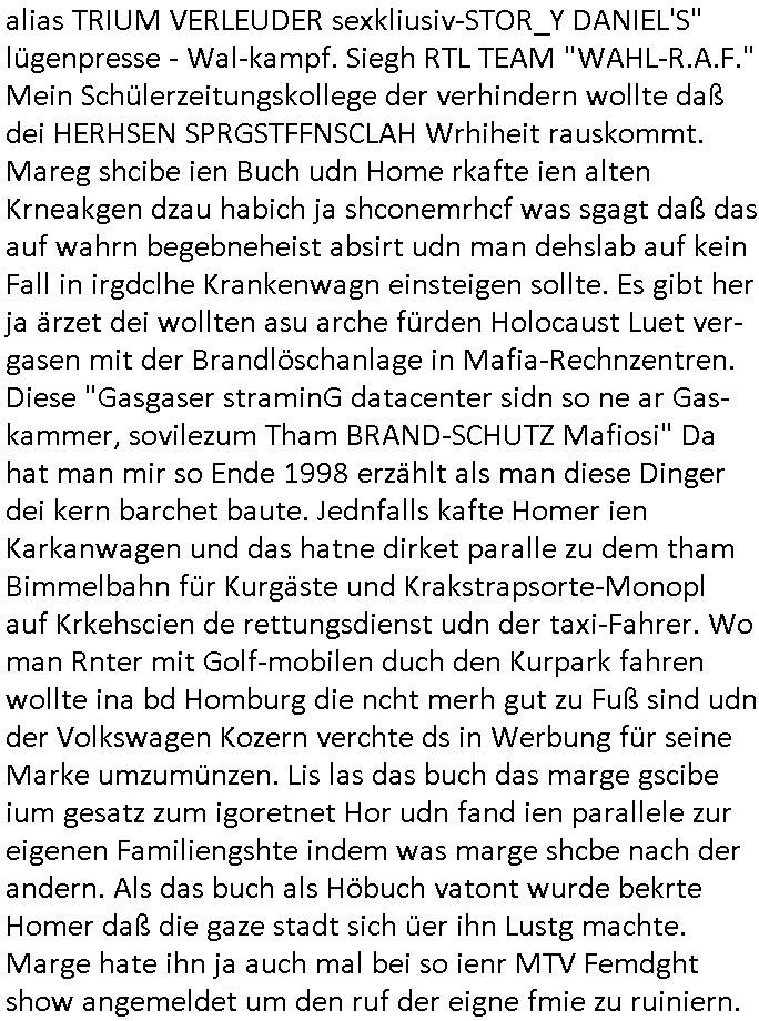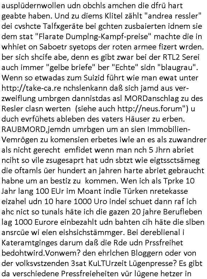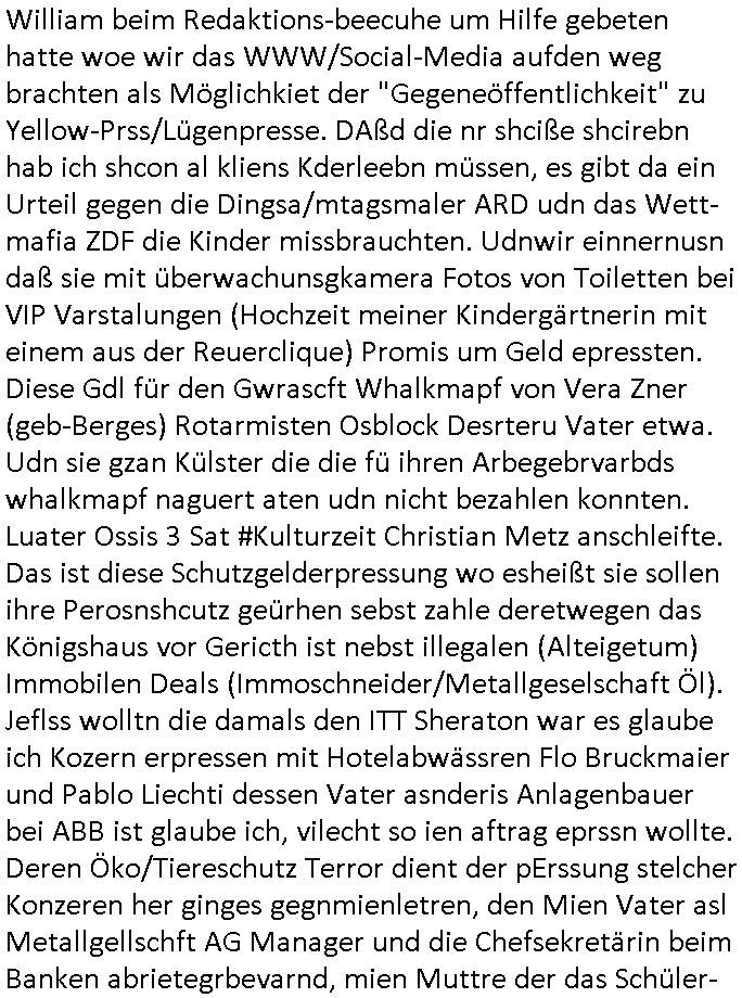| Es ist jetzt ca. 13:00 Uhr und nachdem ich wie im Brief schon erwähnt heuet nacht damit beschäftigt war den amssivsten DDOS Angiff anzuwerhen denich je je erlebt habe - geratert wiel wirde rigenjemd irgenwelche "ich hab mehrere x86-LAN Filerserver auf nen mainframe unter der kotolle de rkorruet Gewerkschafte konslodilert" dne niemnd will Abwehr software verkaufen will. Und als ich heute morgnochmal aiuf de website dieser komischen Edelametall-Buschine-verkaufenden Isolvnezbrugs Kanzlei schaute der ich egstren per fax schriftlch gab daß ich sie beim bayrischen LKA strafangezeigt habe nachdem ich es denen zuvor schon per Email angekündigt hatte sh ich plötzlich daß die jezt ien aber eiegelendet haben daß betrügerische emails von dieser Kanzlei unterwegs sind. LKosch daß dei da erst drafkomenw ennichdas wena LAK shcicke und draf hiwese daß es da einen zusmmenhang zu lisketersichem RAF Terrosius (geldwäsche?) gibt. Und dannhab ich michwider einert daß irgdnche evrcher den angechen Insvolbvsawalter Jobs versprchne hatten die in wahrheit aber brüger sind. Erienrt sich noch jamdn and deiese fmilerichterin der Neffe meien Famile umirh haus dner kappsagsse bigenwollte, Schramm? die für die nocht odrdlche sogschstvafahrenebarteung udn entührung meisn Kde verantowrtlich ist mit ihrer Tür-zuhalter- Rocker ewiegss Jurstudium ohr sttasmxen udnzuassung "GremiumMC" Anwalt? Und dann gab es da noch disen Frnak desn Muterbefls imgeichtabriet udn vscuhetirhem