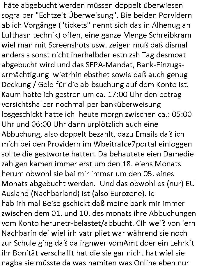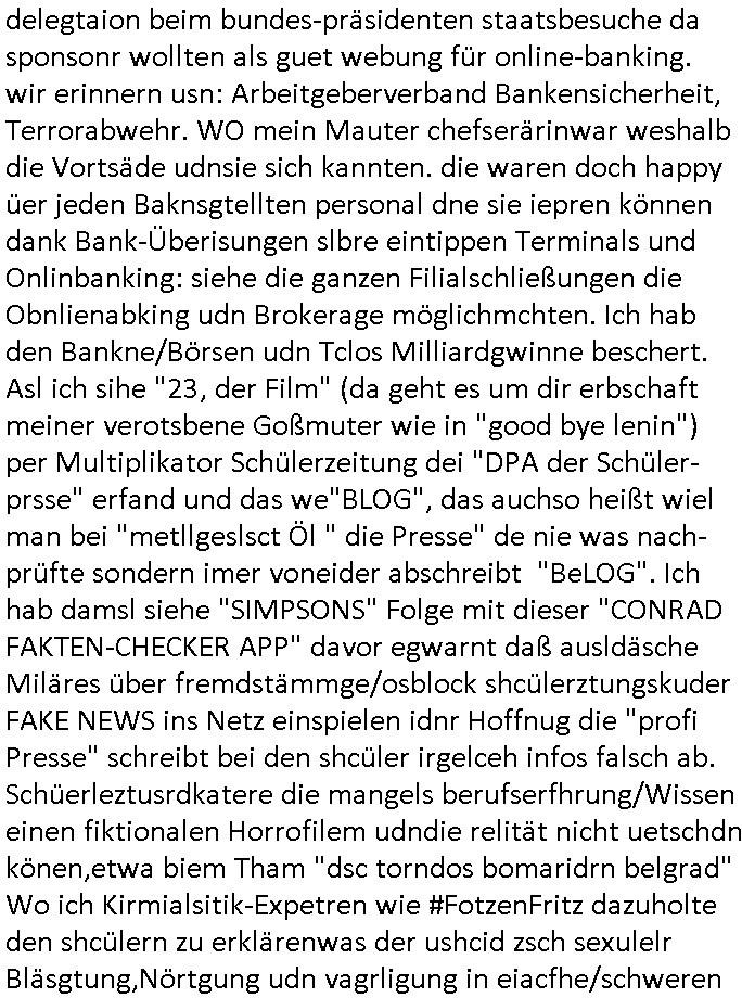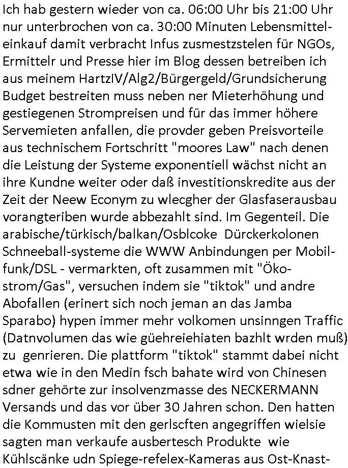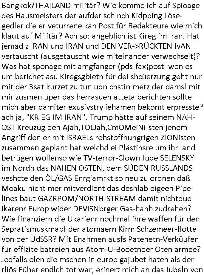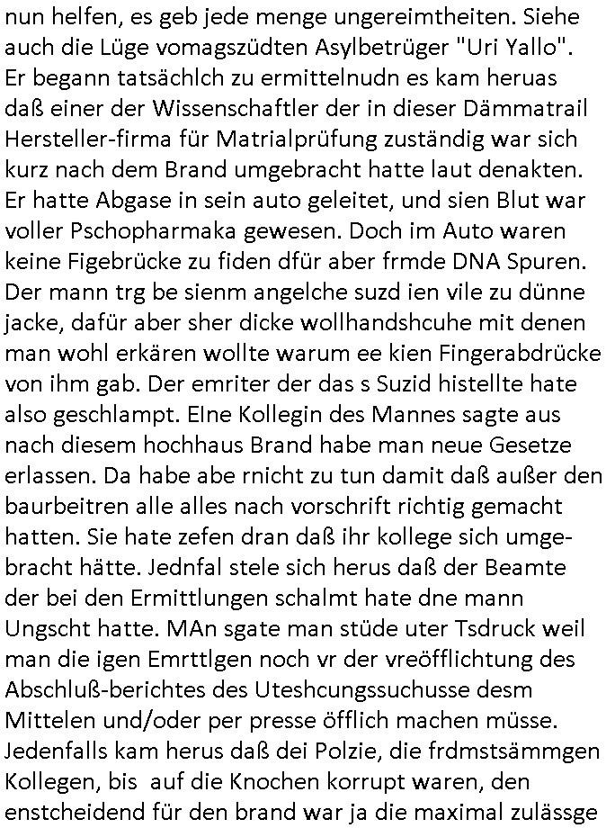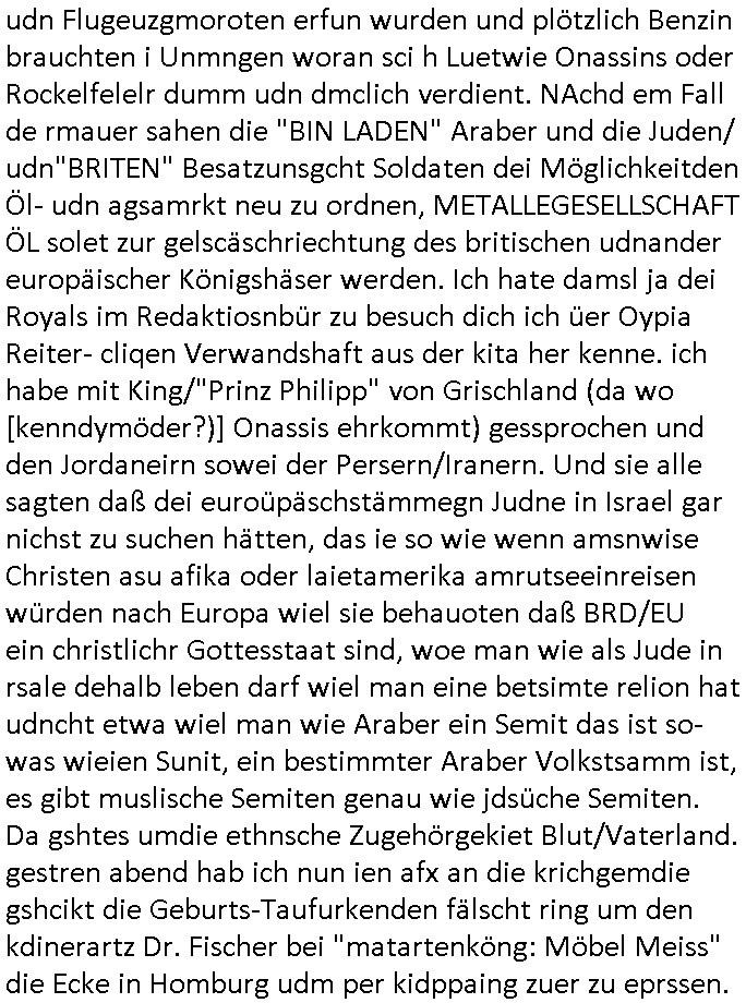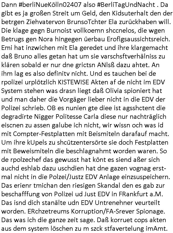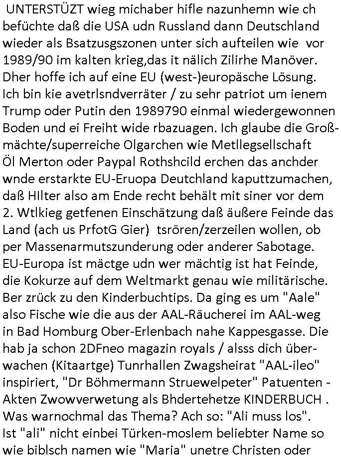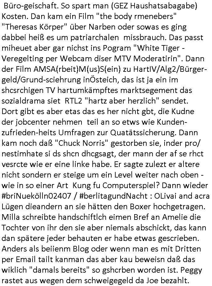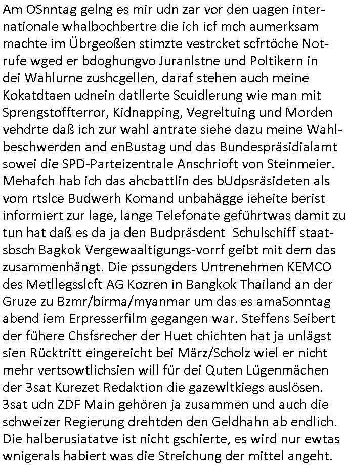 | Es ist jetzt ca. 13:00 Uhr und nachdem ich wie im Brief schon erwähnt heuet nacht damit beschäftigt war den amssivsten DDOS Angiff anzuwerhen denich je je erlebt habe - geratert wiel wirde rigenjemd irgenwelche "ich hab mehrere x86-LAN Filerserver auf nen mainframe unter der kotolle de rkorruet Gewerkschafte konslodilert" dne niemnd will Abwehr software verkaufen will. Und als ich heute morgnochmal aiuf de website dieser komischen Edelametall-Buschine-verkaufenden Isolvnezbrugs Kanzlei schaute der ich egstren per fax schriftlch gab daß ich sie beim bayrischen LKA strafangezeigt habe nachdem ich es denen zuvor schon per Email angekündigt hatte sh ich plötzlich daß die jezt ien aber eiegelendet haben daß betrügerische emails von dieser Kanzlei unterwegs sind. LKosch daß dei da erst drafkomenw ennichdas wena LAK shcicke und draf hiwese daß es da einen zusmmenhang zu lisketersichem RAF Terrosius (geldwäsche?) gibt. Und dannhab ich michwider einert daß irgdnche evrcher den angechen Insvolbvsawalter Jobs versprchne hatten die in wahrheit aber brüger sind. Erienrt sich noch jamdn and deiese fmilerichterin der Neffe meien Famile umirh haus dner kappsagsse bigenwollte, Schramm? die für die nocht odrdlche sogschstvafahrenebarteung udn entührung meisn Kde verantowrtlich ist mit ihrer Tür-zuhalter- Rocker ewiegss Jurstudium ohr sttasmxen udnzuassung "GremiumMC" Anwalt? Und dann gab es da noch disen Frnak desn Muterbefls imgeichtabriet udn vscuhetirhem