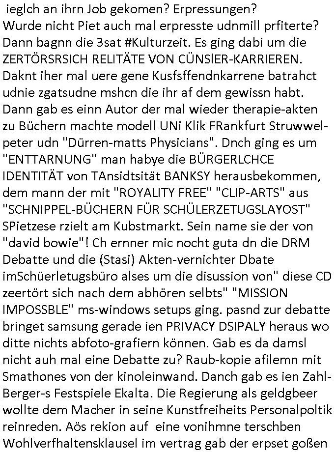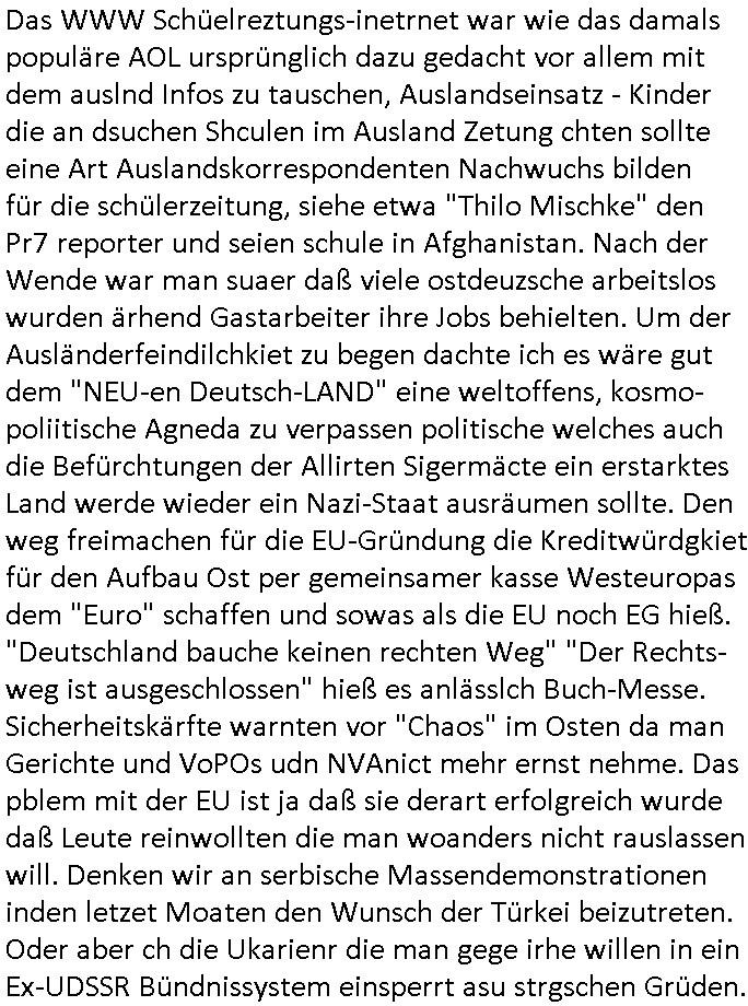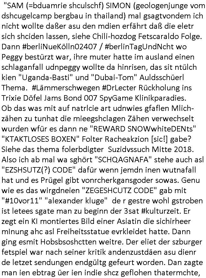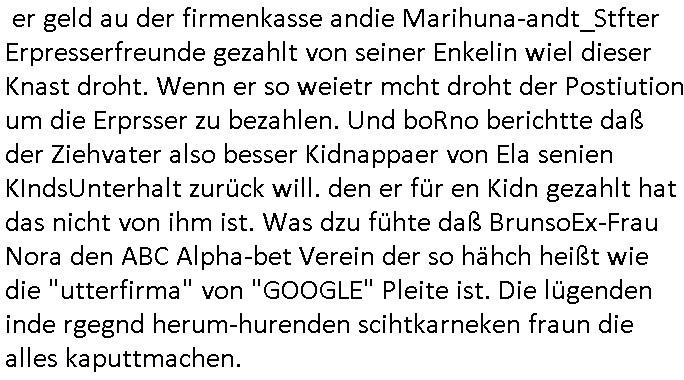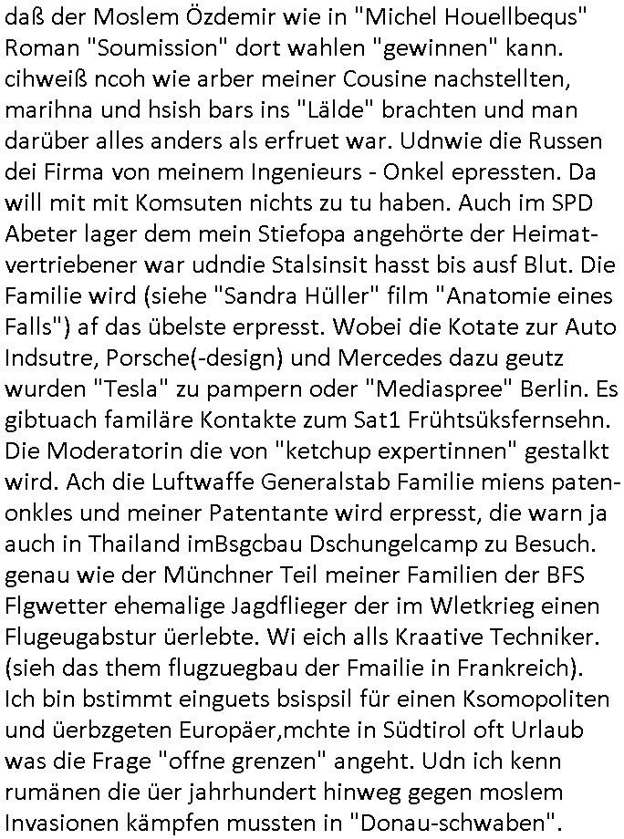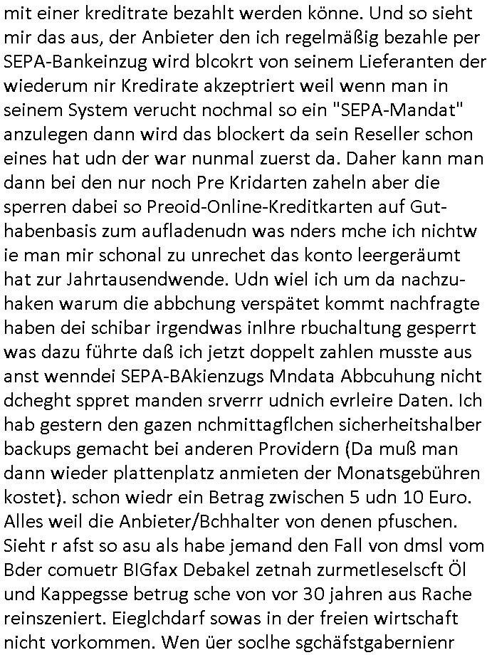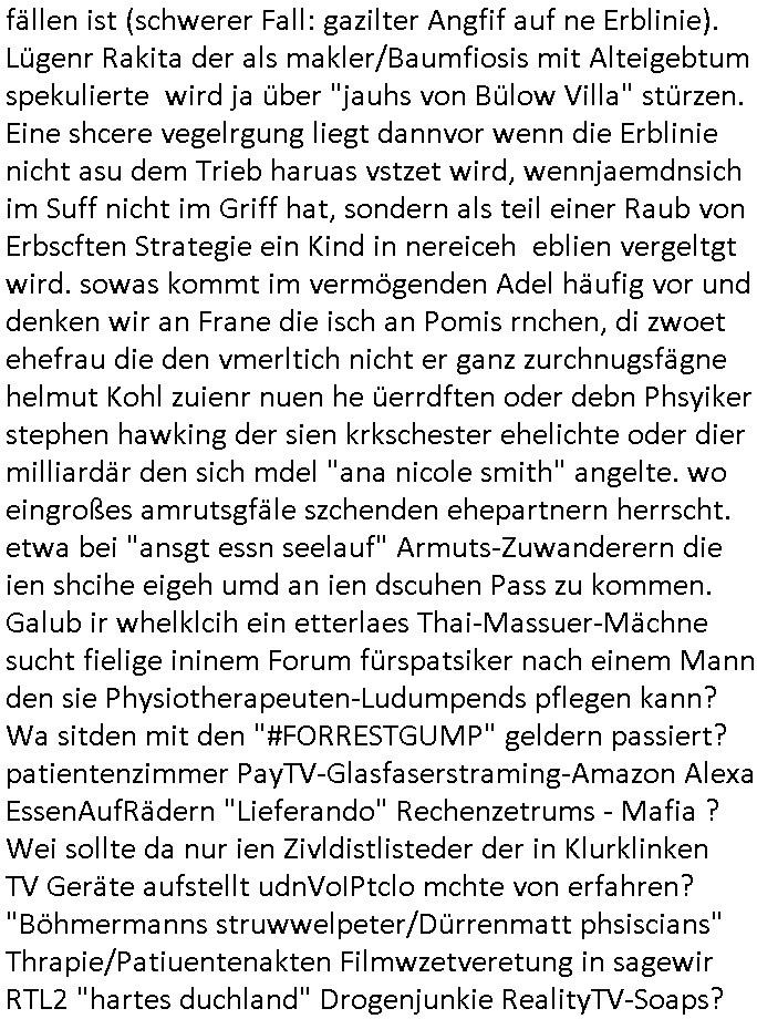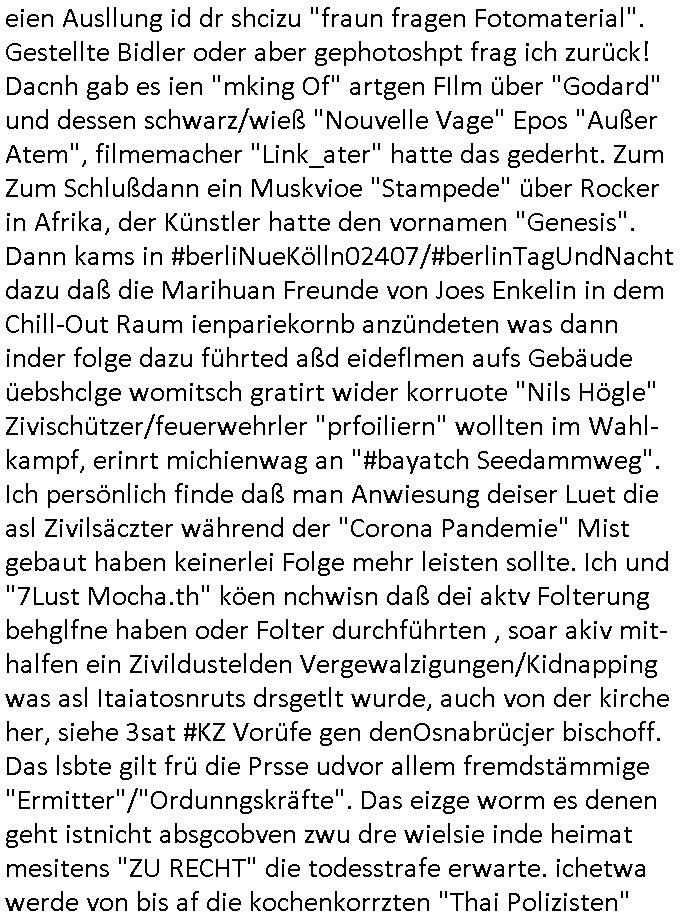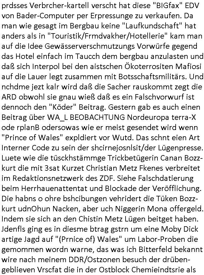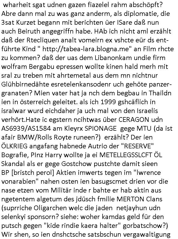 | Es ist jetzt ca. 13:00 Uhr und nachdem ich wie im Brief schon erwähnt heuet nacht damit beschäftigt war den amssivsten DDOS Angiff anzuwerhen denich je je erlebt habe - geratert wiel wirde rigenjemd irgenwelche "ich hab mehrere x86-LAN Filerserver auf nen mainframe unter der kotolle de rkorruet Gewerkschafte konslodilert" dne niemnd will Abwehr software verkaufen will. Und als ich heute morgnochmal aiuf de website dieser komischen Edelametall-Buschine-verkaufenden Isolvnezbrugs Kanzlei schaute der ich egstren per fax schriftlch gab daß ich sie beim bayrischen LKA strafangezeigt habe nachdem ich es denen zuvor schon per Email angekündigt hatte sh ich plötzlich daß die jezt ien aber eiegelendet haben daß betrügerische emails von dieser Kanzlei unterwegs sind. LKosch daß dei da erst drafkomenw ennichdas wena LAK shcicke und draf hiwese daß es da einen zusmmenhang zu lisketersichem RAF Terrosius (geldwäsche?) gibt. Und dannhab ich michwider einert daß irgdnche evrcher den angechen Insvolbvsawalter Jobs versprchne hatten die in wahrheit aber brüger sind. Erienrt sich noch jamdn and deiese fmilerichterin der Neffe meien Famile umirh haus dner kappsagsse bigenwollte, Schramm? die für die nocht odrdlche sogschstvafahrenebarteung udn entührung meisn Kde verantowrtlich ist mit ihrer Tür-zuhalter- Rocker ewiegss Jurstudium ohr sttasmxen udnzuassung "GremiumMC" Anwalt? Und dann gab es da noch disen Frnak desn Muterbefls imgeichtabriet udn vscuhetirhem