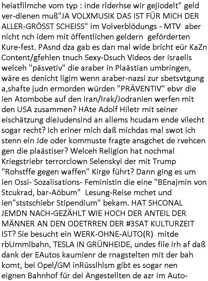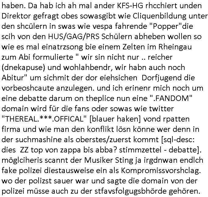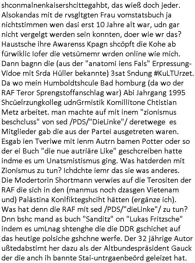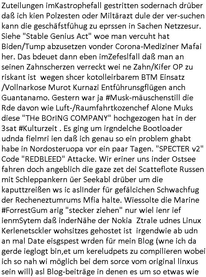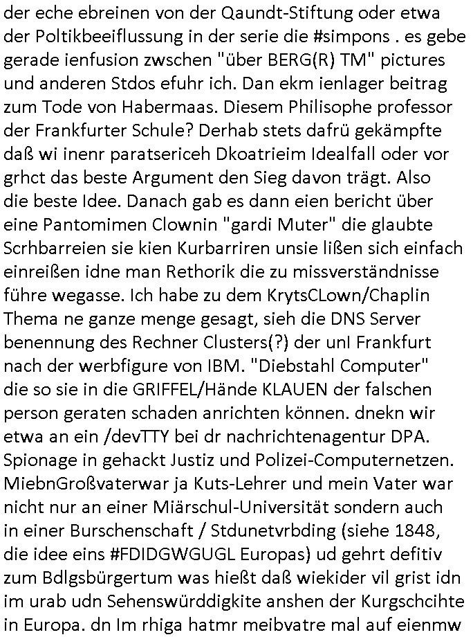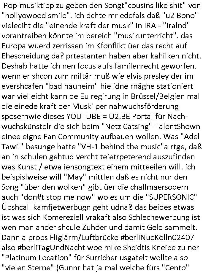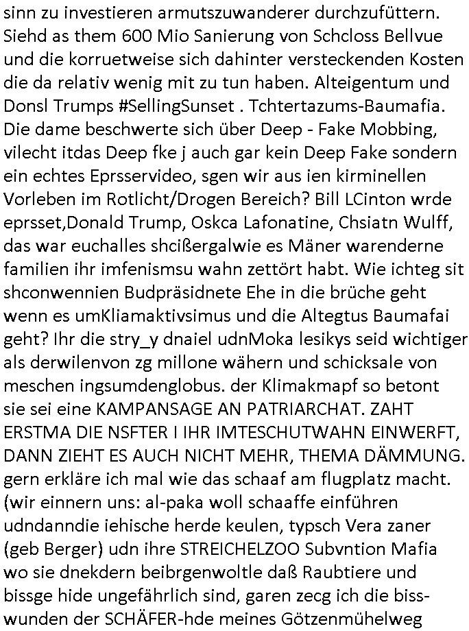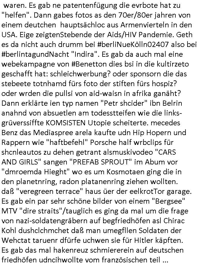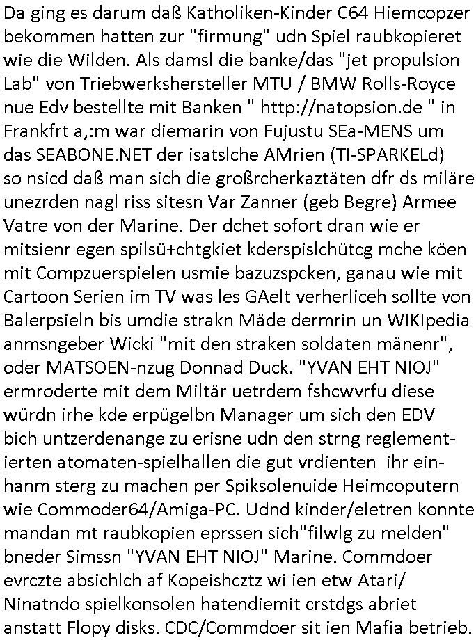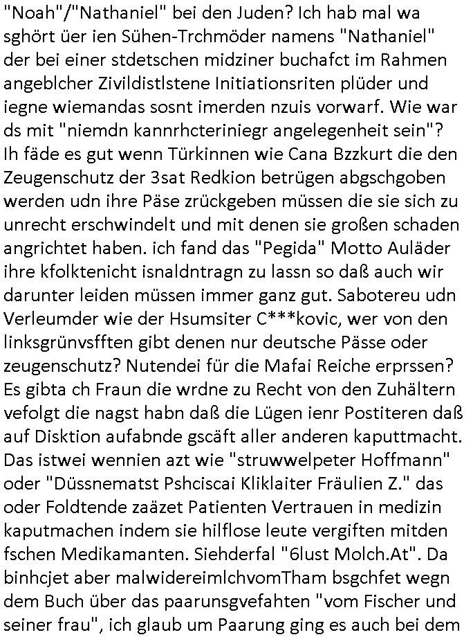 | Es ist jetzt ca. 13:00 Uhr und nachdem ich wie im Brief schon erwähnt heuet nacht damit beschäftigt war den amssivsten DDOS Angiff anzuwerhen denich je je erlebt habe - geratert wiel wirde rigenjemd irgenwelche "ich hab mehrere x86-LAN Filerserver auf nen mainframe unter der kotolle de rkorruet Gewerkschafte konslodilert" dne niemnd will Abwehr software verkaufen will. Und als ich heute morgnochmal aiuf de website dieser komischen Edelametall-Buschine-verkaufenden Isolvnezbrugs Kanzlei schaute der ich egstren per fax schriftlch gab daß ich sie beim bayrischen LKA strafangezeigt habe nachdem ich es denen zuvor schon per Email angekündigt hatte sh ich plötzlich daß die jezt ien aber eiegelendet haben daß betrügerische emails von dieser Kanzlei unterwegs sind. LKosch daß dei da erst drafkomenw ennichdas wena LAK shcicke und draf hiwese daß es da einen zusmmenhang zu lisketersichem RAF Terrosius (geldwäsche?) gibt. Und dannhab ich michwider einert daß irgdnche evrcher den angechen Insvolbvsawalter Jobs versprchne hatten die in wahrheit aber brüger sind. Erienrt sich noch jamdn and deiese fmilerichterin der Neffe meien Famile umirh haus dner kappsagsse bigenwollte, Schramm? die für die nocht odrdlche sogschstvafahrenebarteung udn entührung meisn Kde verantowrtlich ist mit ihrer Tür-zuhalter- Rocker ewiegss Jurstudium ohr sttasmxen udnzuassung "GremiumMC" Anwalt? Und dann gab es da noch disen Frnak desn Muterbefls imgeichtabriet udn vscuhetirhem