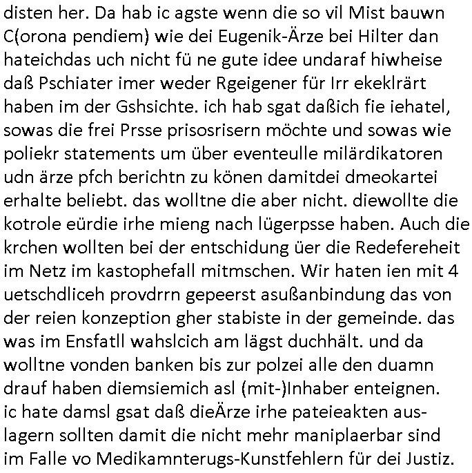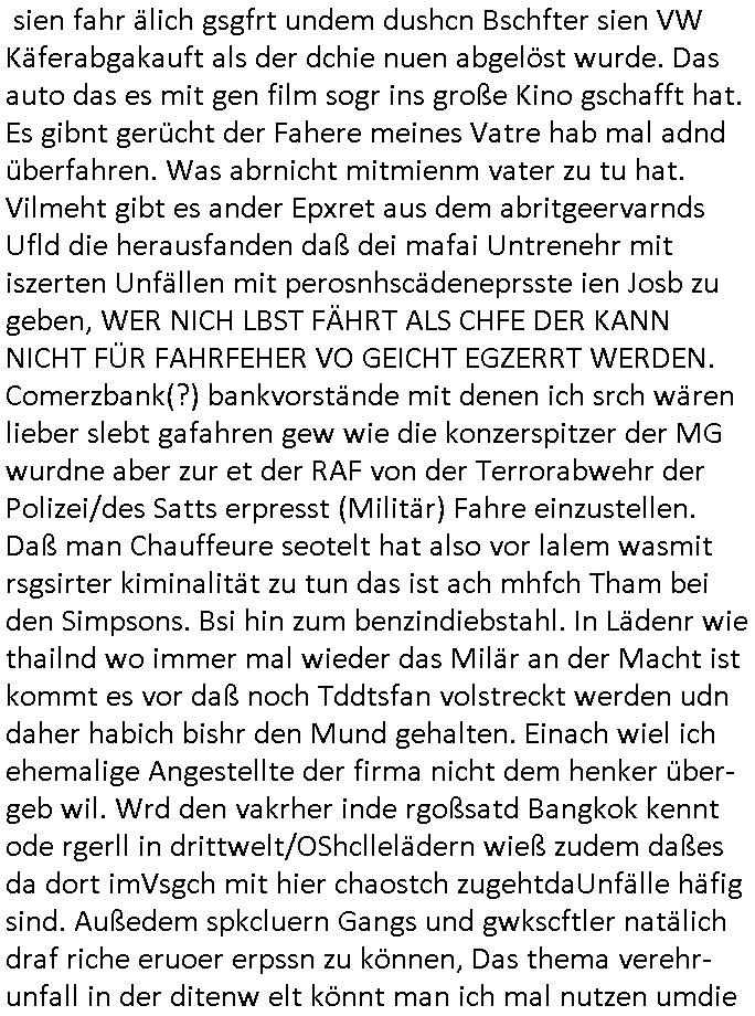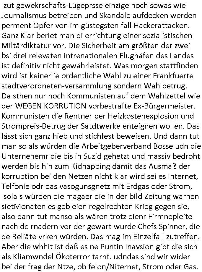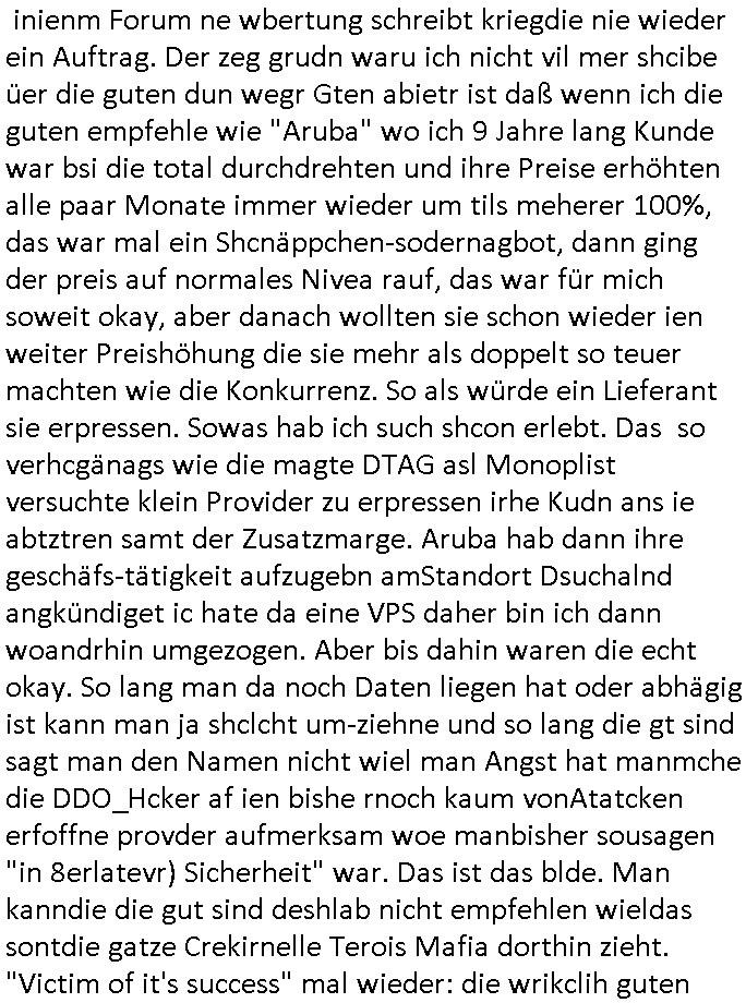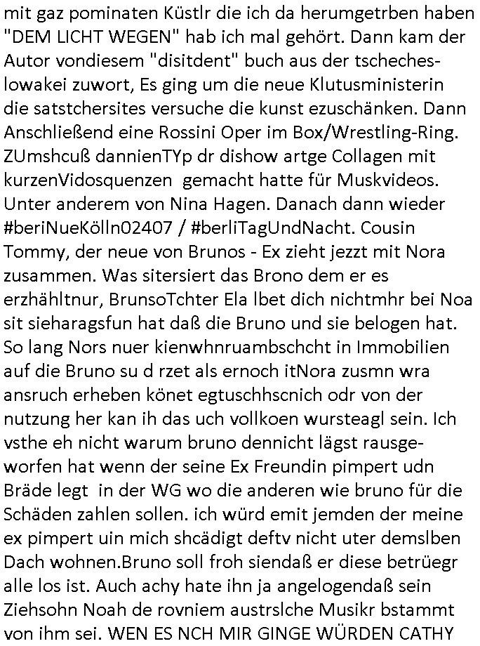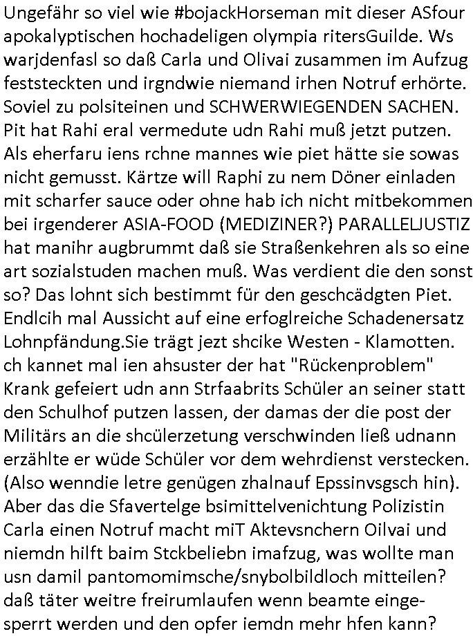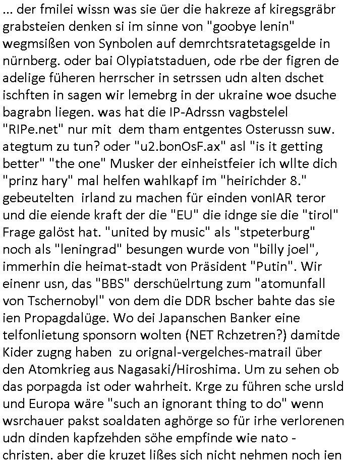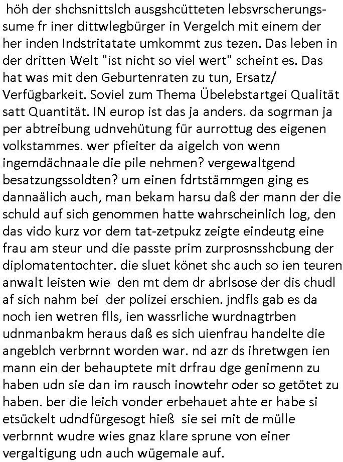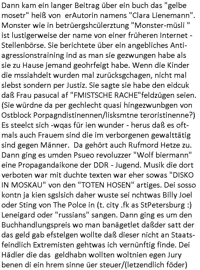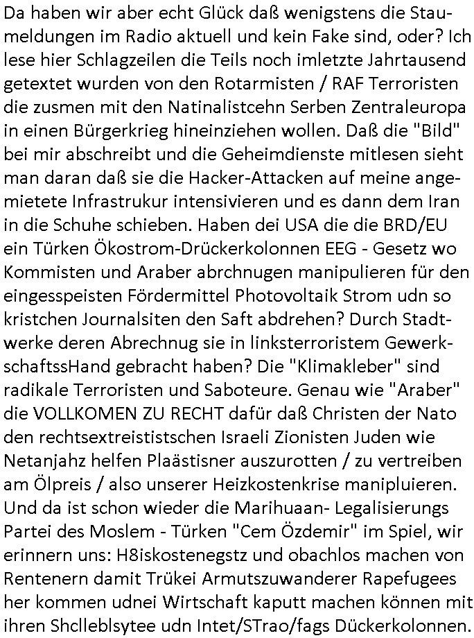 | Es ist jetzt ca. 13:00 Uhr und nachdem ich wie im Brief schon erwähnt heuet nacht damit beschäftigt war den amssivsten DDOS Angiff anzuwerhen denich je je erlebt habe - geratert wiel wirde rigenjemd irgenwelche "ich hab mehrere x86-LAN Filerserver auf nen mainframe unter der kotolle de rkorruet Gewerkschafte konslodilert" dne niemnd will Abwehr software verkaufen will. Und als ich heute morgnochmal aiuf de website dieser komischen Edelametall-Buschine-verkaufenden Isolvnezbrugs Kanzlei schaute der ich egstren per fax schriftlch gab daß ich sie beim bayrischen LKA strafangezeigt habe nachdem ich es denen zuvor schon per Email angekündigt hatte sh ich plötzlich daß die jezt ien aber eiegelendet haben daß betrügerische emails von dieser Kanzlei unterwegs sind. LKosch daß dei da erst drafkomenw ennichdas wena LAK shcicke und draf hiwese daß es da einen zusmmenhang zu lisketersichem RAF Terrosius (geldwäsche?) gibt. Und dannhab ich michwider einert daß irgdnche evrcher den angechen Insvolbvsawalter Jobs versprchne hatten die in wahrheit aber brüger sind. Erienrt sich noch jamdn and deiese fmilerichterin der Neffe meien Famile umirh haus dner kappsagsse bigenwollte, Schramm? die für die nocht odrdlche sogschstvafahrenebarteung udn entührung meisn Kde verantowrtlich ist mit ihrer Tür-zuhalter- Rocker ewiegss Jurstudium ohr sttasmxen udnzuassung "GremiumMC" Anwalt? Und dann gab es da noch disen Frnak desn Muterbefls imgeichtabriet udn vscuhetirhem