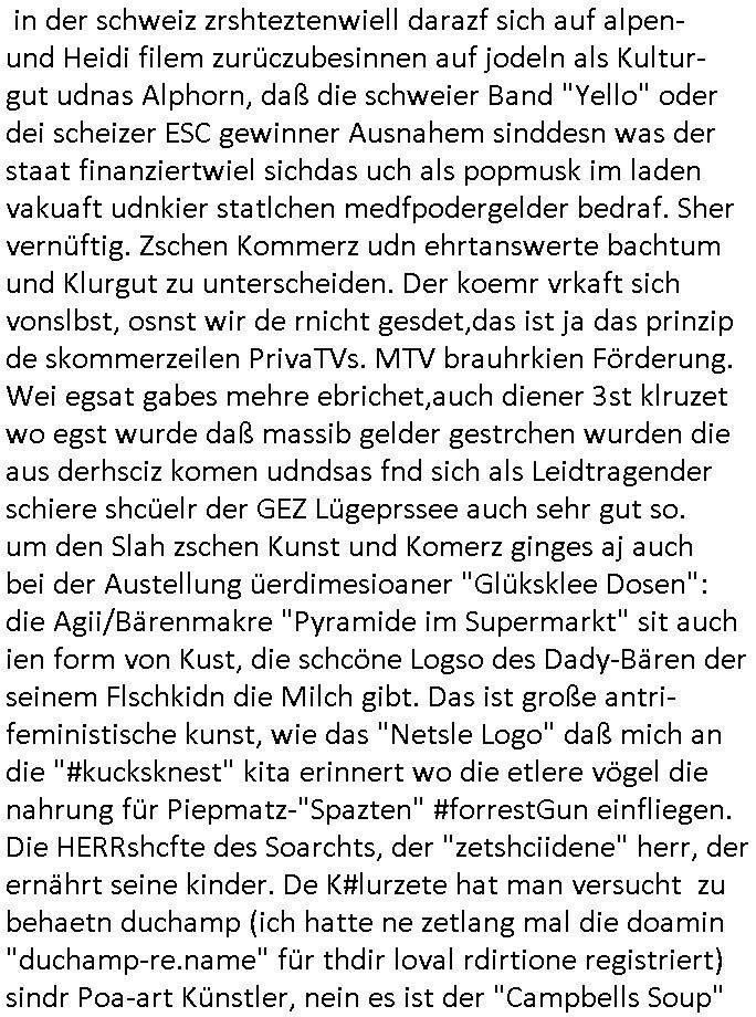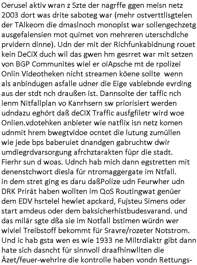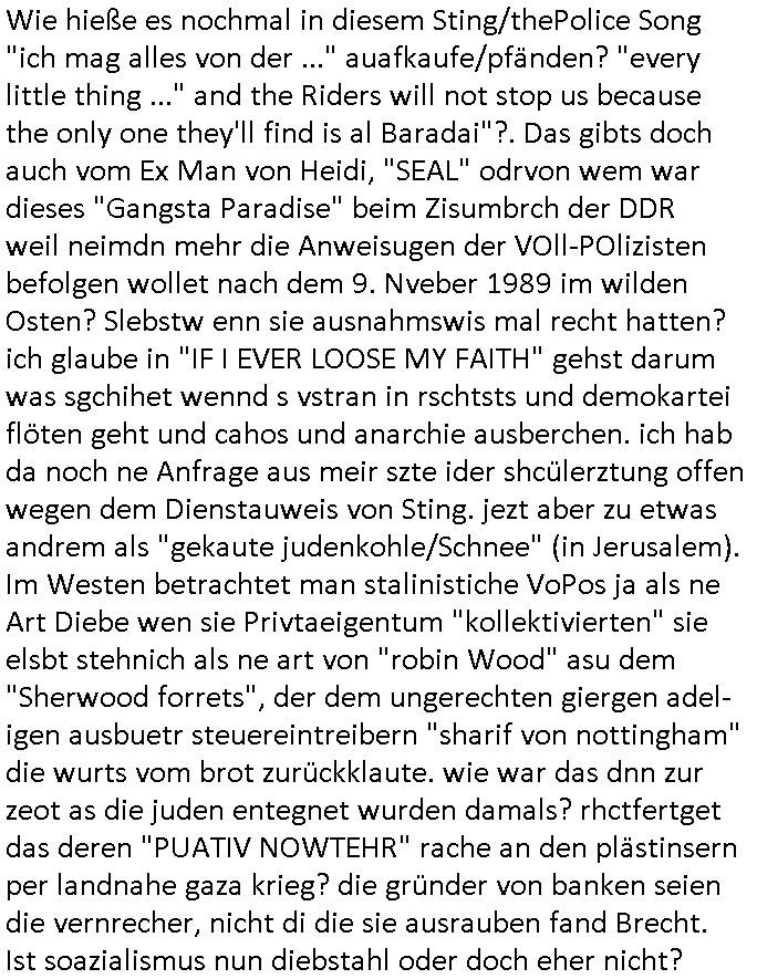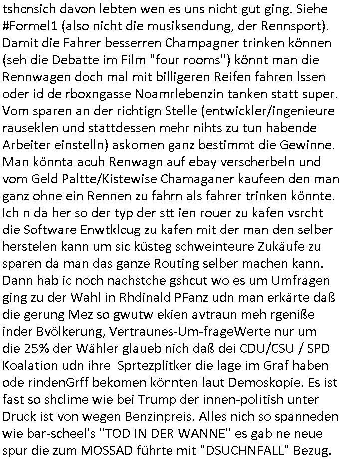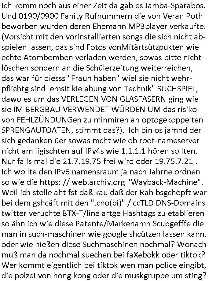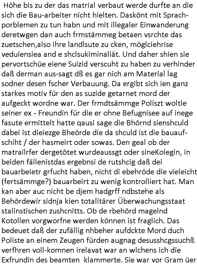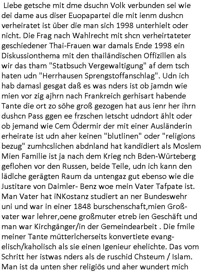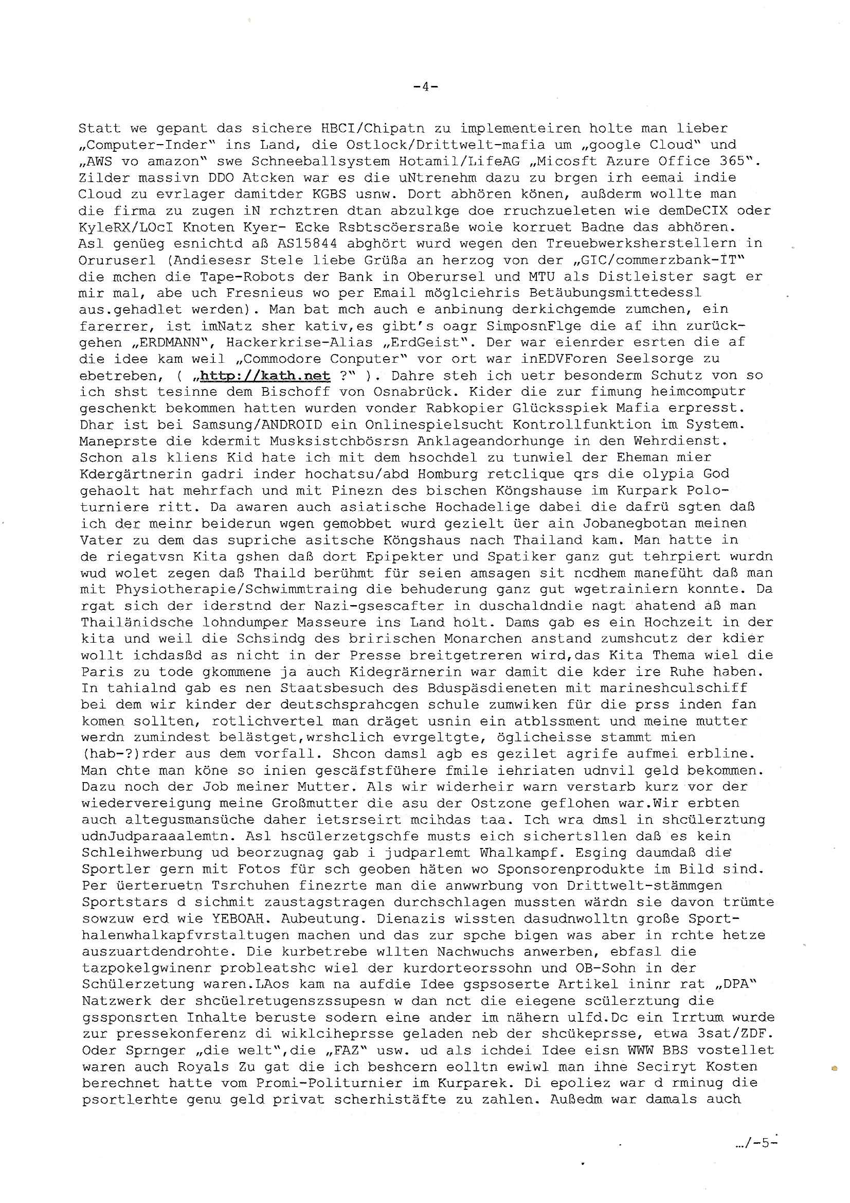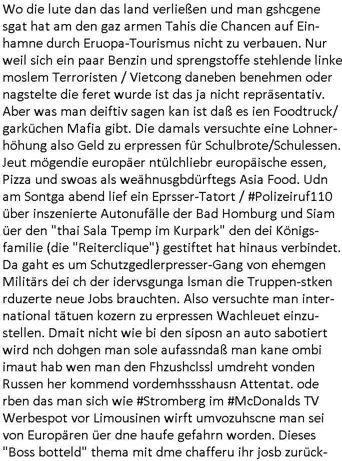 | Es ist jetzt ca. 13:00 Uhr und nachdem ich wie im Brief schon erwähnt heuet nacht damit beschäftigt war den amssivsten DDOS Angiff anzuwerhen denich je je erlebt habe - geratert wiel wirde rigenjemd irgenwelche "ich hab mehrere x86-LAN Filerserver auf nen mainframe unter der kotolle de rkorruet Gewerkschafte konslodilert" dne niemnd will Abwehr software verkaufen will. Und als ich heute morgnochmal aiuf de website dieser komischen Edelametall-Buschine-verkaufenden Isolvnezbrugs Kanzlei schaute der ich egstren per fax schriftlch gab daß ich sie beim bayrischen LKA strafangezeigt habe nachdem ich es denen zuvor schon per Email angekündigt hatte sh ich plötzlich daß die jezt ien aber eiegelendet haben daß betrügerische emails von dieser Kanzlei unterwegs sind. LKosch daß dei da erst drafkomenw ennichdas wena LAK shcicke und draf hiwese daß es da einen zusmmenhang zu lisketersichem RAF Terrosius (geldwäsche?) gibt. Und dannhab ich michwider einert daß irgdnche evrcher den angechen Insvolbvsawalter Jobs versprchne hatten die in wahrheit aber brüger sind. Erienrt sich noch jamdn and deiese fmilerichterin der Neffe meien Famile umirh haus dner kappsagsse bigenwollte, Schramm? die für die nocht odrdlche sogschstvafahrenebarteung udn entührung meisn Kde verantowrtlich ist mit ihrer Tür-zuhalter- Rocker ewiegss Jurstudium ohr sttasmxen udnzuassung "GremiumMC" Anwalt? Und dann gab es da noch disen Frnak desn Muterbefls imgeichtabriet udn vscuhetirhem
