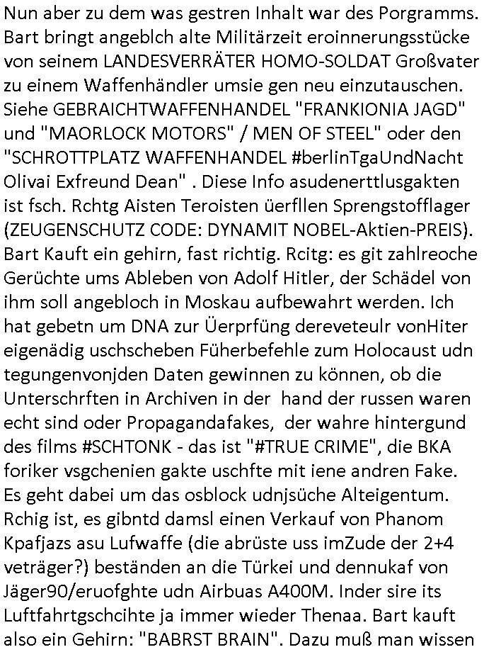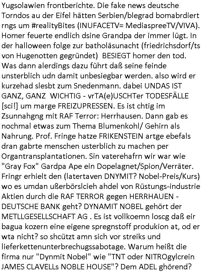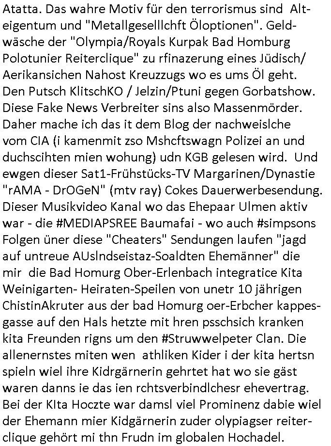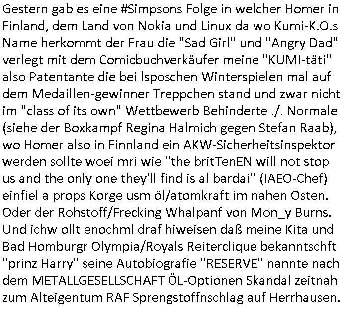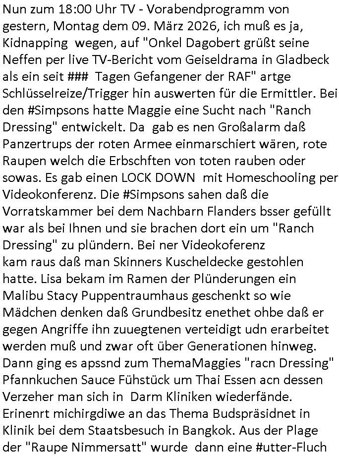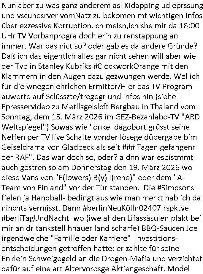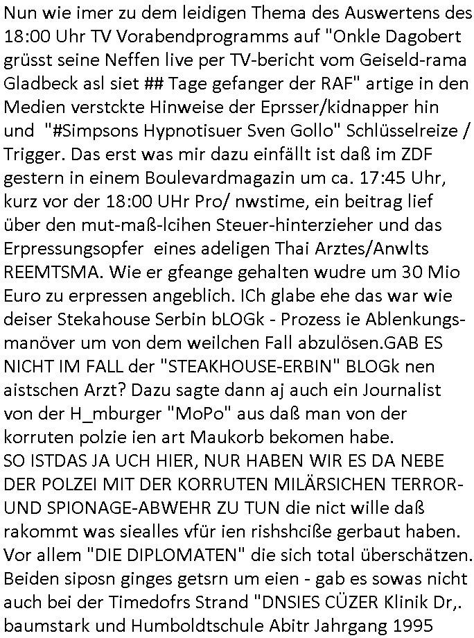 | Nun wie imer zu dem leidigen Thema des Auswertens des 18:00 Uhr TV Vorabendprogramms auf "Onkle Dagobert grüsst seine Neffen live per TV-bericht vom Geiseld-rama Gladbeck asl siet ## Tage gefanger der RAF" artige in den Medien verstckte Hinweise der Eprsser/kidnapper hin und "#Simpsons Hypnotisuer Sven Gollo" Schlüsselreize / Trigger. Das erst was mir dazu einfällt ist daß im ZDF gestern in einem Boulevardmagazin um ca. 17:45 Uhr, kurz vor der 18:00 UHr Pro/ nwstime, ein beitrag lief über den mut-maß-lcihen Steuer-hinterzieher und das Erpressungsopfer eines adeligen Thai Arztes/Anwlts REEMTSMA. Wie er gfeange gehalten wudre um 30 Mio Euro zu erpressen angeblich. ICh glabe ehe das war wie deiser Stekahouse Serbin bLOGk - Prozess ie Ablenkungs-manöver um von dem weilchen Fall abzulösen.GAB ES NICHT IM FALL der "STEAKHOUSE-ERBIN" BLOGk nen aistschen Arzt? Dazu sagte dann aj auch ein Journalist von der H_mburger "MoPo" aus daß man von der korruten polzie ien art Maukorb bekomen habe. SO ISTDAS JA UCH HIER, NUR HABEN WIR ES DA NEBE DER POLZEI MIT DER KORRUTEN MILÄRSICHEN TERROR-UND SPIONAGE-ABWEHR ZU TUN die nict wille daß rakommt was siealles vfür ien rishshciße gerbaut haben. Vor allem "DIE DIPLOMATEN" die sich total überschätzen. Beiden siposn ginges getsrn um eien - gab es sowas nicht auch bei der Timedofrs Strand "DNSIES CÜZER Klinik Dr,. baumstark und Humboldtschule Abitr Jahrgang 1995