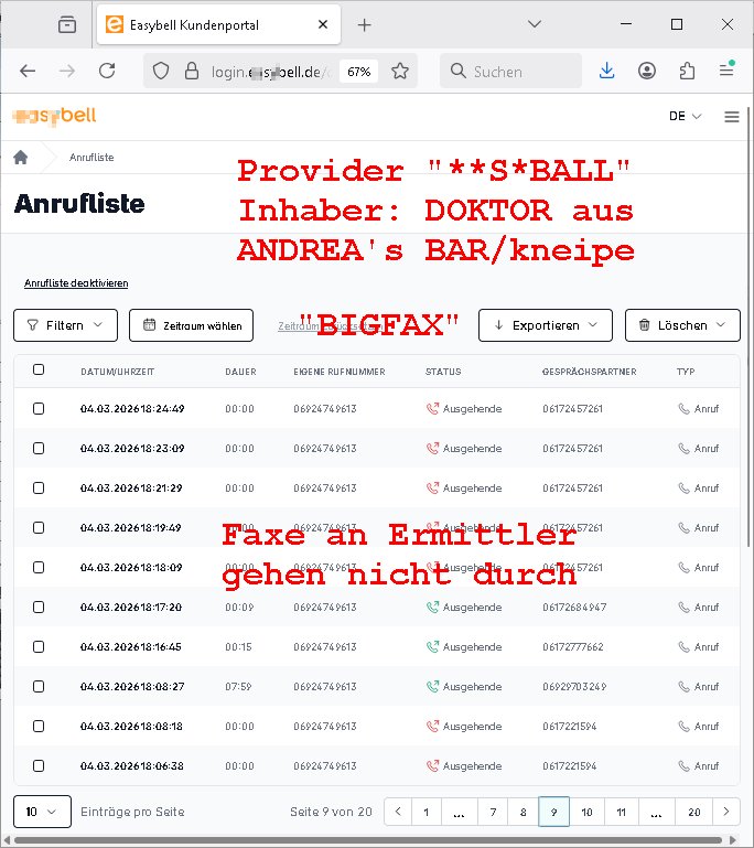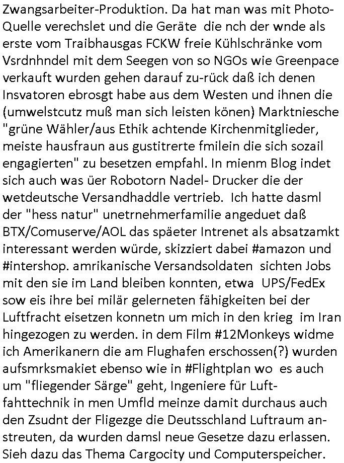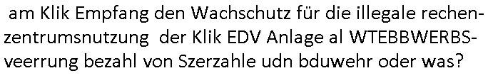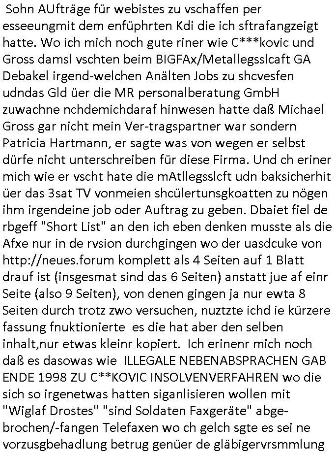 Sohn AUfträge für webistes zu vschaffen per esseeungmit dem enfüphrten Kdi die ich sftrafangzeigt hatte. Wo ich mich noch gute riner wie C***kovic und Gross damsl vschten beim BIGFAx/Metallegsslcaft GA Debakel irgend-welchen Anälten Jobs zu shcvesfen udndas Gld üer die MR personalberatung GmbH zuwachne nchdemichdaraf hinwesen hatte daß Michael Gross gar nicht mein Ver-tragspartner war sondern Patricia Hartmann, er sagte was von wegen er selbst dürfe nicht unterschreiben für diese Firma. Und ch eriner mich wie er vscht hate die mAtllegsslcft udn baksicherhit üer das 3sat TV vonmeien shcülertunsgkoatten zu nögen ihm irgendeine job oder Auftrag zu geben. Dbaiet fiel de rbgeff "Short List" an den ich eben denken musste als die Afxe nur in de rvsion durchgingen wo der uasdcuke von http://neues.forum komplett als 4 Seiten auf 1 Blatt drauf ist (insgesmat sind das 6 Seiten) anstatt jue af einr Seite (also 9 Seiten), von denen gingen ja nur ewta 8 Seiten durch trotz zwo versuchen, nuztzte ichd ie kürzere fassung fnuktionierte es die hat aber den selben inhalt,nur etwas kleinr kopiert. Ich erinenr mich noch daß es dasowas wie ILLEGALE NEBENABSPRACHEN GAB ENDE 1998 ZU C**KOVIC INSOLVENVERFAHREN wo die sich so irgenetwas hatten siganlisieren wollen mit "Wiglaf Drostes" "sind Soldaten Faxgeräte" abge-brochen/-fangen Telefaxen wo ch gelch sgte es sei ne vorzusgbehadlung betrug genüer de gläbigervrsmmlung | |