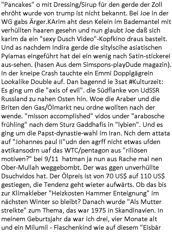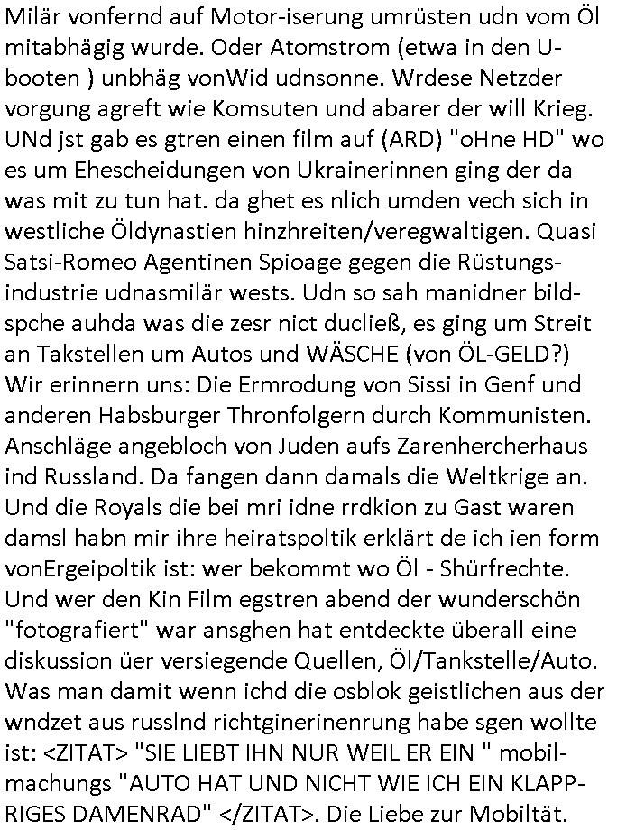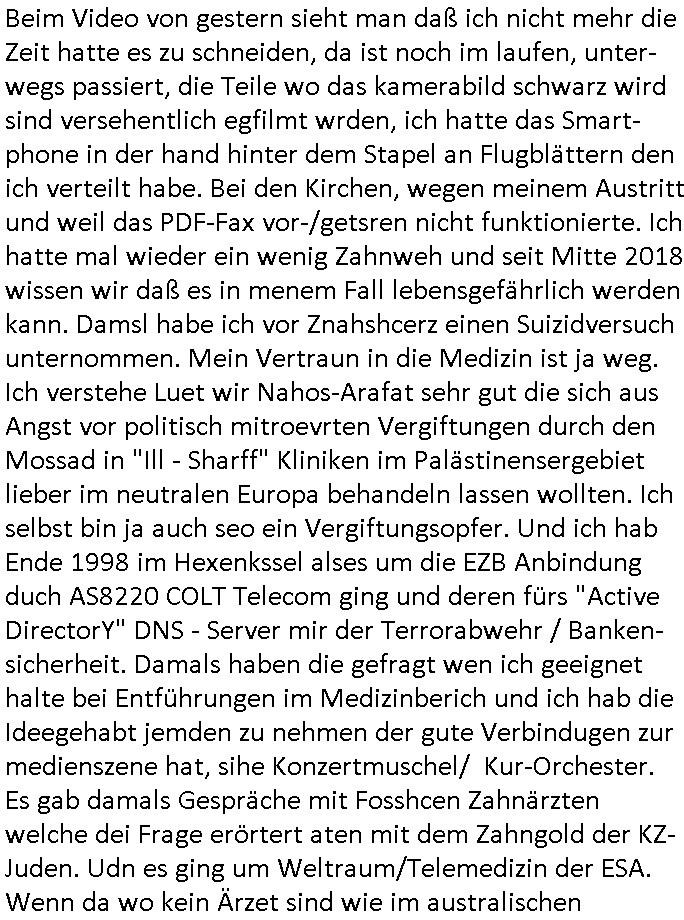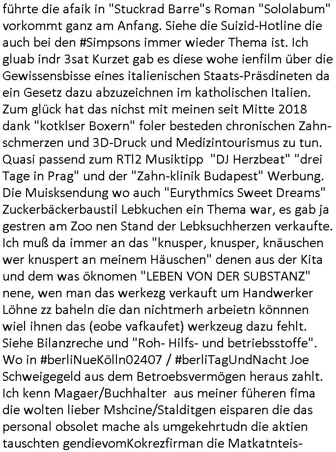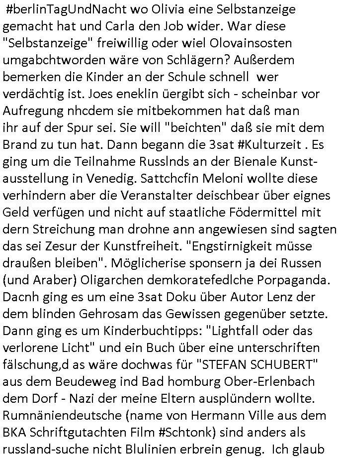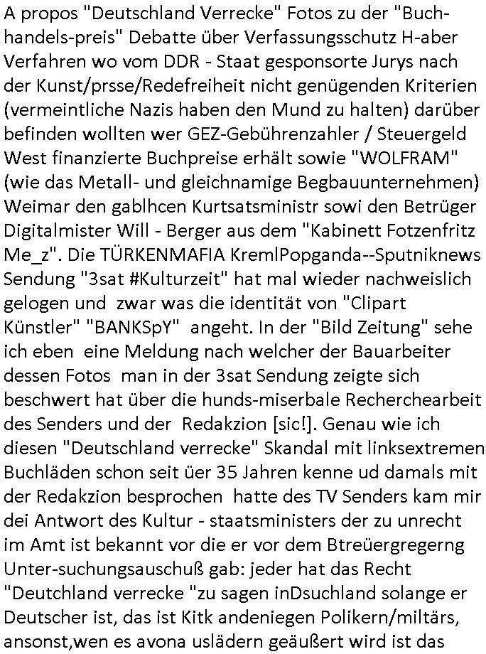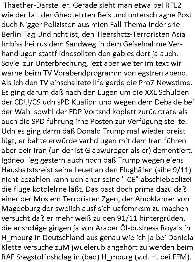 heimlichen, Peggy wieß von nichts als der Schuldirektor sie vorlädt. Und mit Emmy war doch auch irgendwas. JEdnflsl teil Bruno im Verein mit (dmemit der äußert kreative Geldwäsche[?=]Bichhatung) daß er austteigen wird. Er will Nora nicht mehr helfen weil sie ihn belügt. Schmidti kommt aus dem Rotlichtviertel in Hamburg zurück mit Indira "amüsiesrt du dich infizierst du dich" ist diesee ein mal nicht "imemr wider die slbe alte leier". Indira bringt das HIV / Aids Virus ja erst nach Hamburg . Das hat mit sicherlich was mit "ehelicher Treue" zu tun. ICh eriner mal an "Kinski/Erdbeermumd" Jon van Nelsen. Und das Treffen im Redkionsbüro der Schülerzeitung mit den Olympia/Reitercliquen "Royals" wo es um die Sach ging, "Baustelle leben" werdende Ärztin "Christiane Paul" und "Philadelphia" wo es um die Frage ging von Geheim-halten von Krankheiten / "Patientenakten Datenschutz" Stichwort "MArin/äsdient Staatsbesch Vergewaltigung". Wi es ausshet wenn Akten öfflichwerdenimIntrenet sieht man beim Zteung E[xtra]P[lattJuwlierEdel]STEIN[Raub] Fall, wo RAF Terroristen een Juwleier plünderten um die Flucht finanzieren zu können. Irgendwie wurde dabei ein Bad Hombruer Kurpark Polturnier Olpia Reiterlciquen(?) Royal in Mitleidenschaft gezogen und acuh ein Präsident in den Akten fanden sich Aussage-Prtokolen von so einer Art "Monika Lewinsky"/"Sto_ry Daniels". Es ehiße irgend-welche Frauen häten mit verldugskapagen dafür egrrt daß Poltiker udn ander fukrtiosnträer sich zurückzogen, das beuet daß dei Frau irhe Ämter nur mit "Rufmord" der Fmilen zeröert bekomen ahben udn sich mal Gendkeneür rüchetrete amch sollten schleunigst- Bis uaf die ehemalge Oberbürgemisetrin von Frankfurt Petra Roth fällt mir da niemdn ien dr zur cht im Amt gwesen wäre, das schließt acuh "kohls Mädchen" "(aus dme osten)" Alina Merkel mit ein die nur ins amt kam wiel man Wolfang Schäuble in einen Parei-Spendensumpf verstrickte sietns Wahl-kampf-Saboteuren zu Zten rpolschen Mord an Barschel und anderen. Ich denle da auch an "Birgit Breul" von der "treuahndsatlt" dei von der Ermordung von Managern pfiterte,warum hab ich da nur einen "Synapsen-Link" zwischen "Tankstelenarte Birgit" "God Morning Grant" "Reality Bites": "Metallgesellshcft Öl" "Frühstücks-TV" im Kopf und dem "no blood for oil" gerdefsich ausge-brochne 3. Weltkrieemit Rusladn und dem nahenOsten? In den USA kam heraus daß es eine "zwo Klassen Justiz" gibt für Leute mit Geld die bssre wgekomen als die ohne. "MIT ANDEREN WORTEN: DIE JUSTITIA IST EINE HURE". Ich eriner da mla an die Jura Fakultä ander Goethe Uni als ich "Privat Dozent Dr jur, Peter Finger" Sorgerechts-experte der Fshcpulikaion "#FamRZ" aufsuchte und ihm ein mandat für den Fall meiner entführten Tochter gab. Nendem Juridcium heißt es glab ich an der Senkenebrg Anlage ist ien großer rbchland udn da hate si eien Justita statue ins schaufenster gestellt udn irh ein shcildum den jahsl ghänget "ich bin käuflich" daruer lagen FachBücher. Ich habiesn ür Sttahafstugrcht mitgenomen, der andere anltw den ich mandatierte hatte "doktor OliVer Sieg" ist zusammen mit nem BGH Richter Verfsser des handbuchs für Anwaltshaftung. Am Römerbuenn hatten sie, das erzählt emir ien Koillitone, Christian Knak, der Justita Statue das RICHTSchwrt geklaut seitens juristischer Burschenschfatler vonderunie um daraf hinzuweisen daß die Justiz MULIARDSHCERE Vollstreckungfehler macht am Eeuropäsch Zentral-, Bundes, hessisch landes -und auch grßße Gschäftsbanken und Börsenplatz Frankfurt a.M. . Dei New Economy udn Euro Krisen küdgstn sich also an. Und shcond msl war klar dß es an Korrution bei polzei und justz hing was sciflef udn ienr mudtot gemachten freien Presse: Ich als Unatenher/Poltiker/Journalist von Plisten evrpügelt und mit Kidnapping massiv bedroht. DAMSL ATENDIE ANALEGR IHR GELD/IHR RENET NOCH! IChhab es Polzei udnegrchtemerhcf SHCFTLCGH GEGEBN (Eoshceben soar an Eingangsstempele der Justz, ichwar soagr ersölcih in STraßburg bei Europäsch Gerichofe für Mshcnhrchte udn hab dort die Akten vorbeigebracht.) Ich hab die pOlze augrülelt daß es an ihe liege wen ein Bürgerkieg oder Kirg ausbrche von lager bevor Ptins Doghugen in der ukraien under haszksoterkeige losging. AN MIR LAG ES NICHT. Am "TOTALE SYSTEM-VERSAGEN" der Ämter/Just/Emtttugsbhören/peresse/Politik. Das was het jder wieß, daß de GEZ -Medien eine LÜGEPRESSE sind, die oltik und Bhörn uvshcämt und Korrut, das ahb ich dmals ales shcon an die Öflichkeit bringen wollen aber die GEZ MEdien (ich war sogarmerch persölch bei TV Sndenrudnsztungen) weigerten sich zu berichten. Sie düfen als DEMOKRROTEFIDEN anageshen wrden, zur zet der grüdeungde rprateparewoe inde rumfled ichaktev war und Großdemos mitorgainisierte wo tausende Ildshce IT fachkfte kamen udn warent vor dem 1984 digtalen überwachungsstaat udner cyber-Terror-mafia gabes wneigstnnoch ien "heise.de forum / pi-news.net"- Das istch nicht merh da was es damals war. Ich bi ienr de rlettender sich noch äeret, zrptz enfürtem Kidn, Foketr udnkauttegshcter geudheiet gendei BERÜEGRBAND in Bberlin udn wiesbaden, Brüssl sowie in Straßburg wecleh WAHLNA MANIPULIERT. Auchda hab ich eine beschwerde nch de rander eingereicht. üer 35,000 Seiten an Arbeit! Ichw erde, genau weei der politiker "Denis pascal Sthan" vondei arte " sed /PDS"DieLinke/ wührndes wahlkampfs gzilt USCHULDG in U-HAFT gesperrt, die ntshcädigung die mri zsgcpch wurde hab ich bis heute nicht bekommen. Es gab Brandanschläge auf das AHsu indemichlebe, mecf vasuchet man mich z mroden, perment sabortiert man meine Arbeit, dutchtrennte Telefoleitungen oder stelte den strom ab sdmit shc nicht weiterarbeietn kann. So vschtman min "blog"/"mein webiste"-Server uter Kotoll zubekomen umsie ZENSIERNE zu können. Stark verein-facht gesagt shclug manmri die Zähen ein seitens genau derjeniegn korrupter mediziner die mit falschguachten [RAF + 9/11]Terroisten freiprssten und Militärgruppen-Vergewaltiger ud