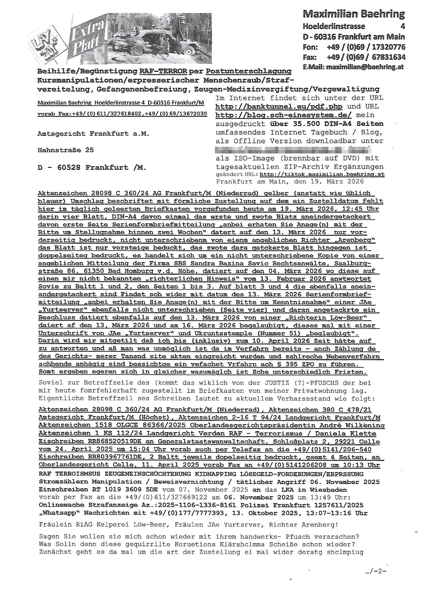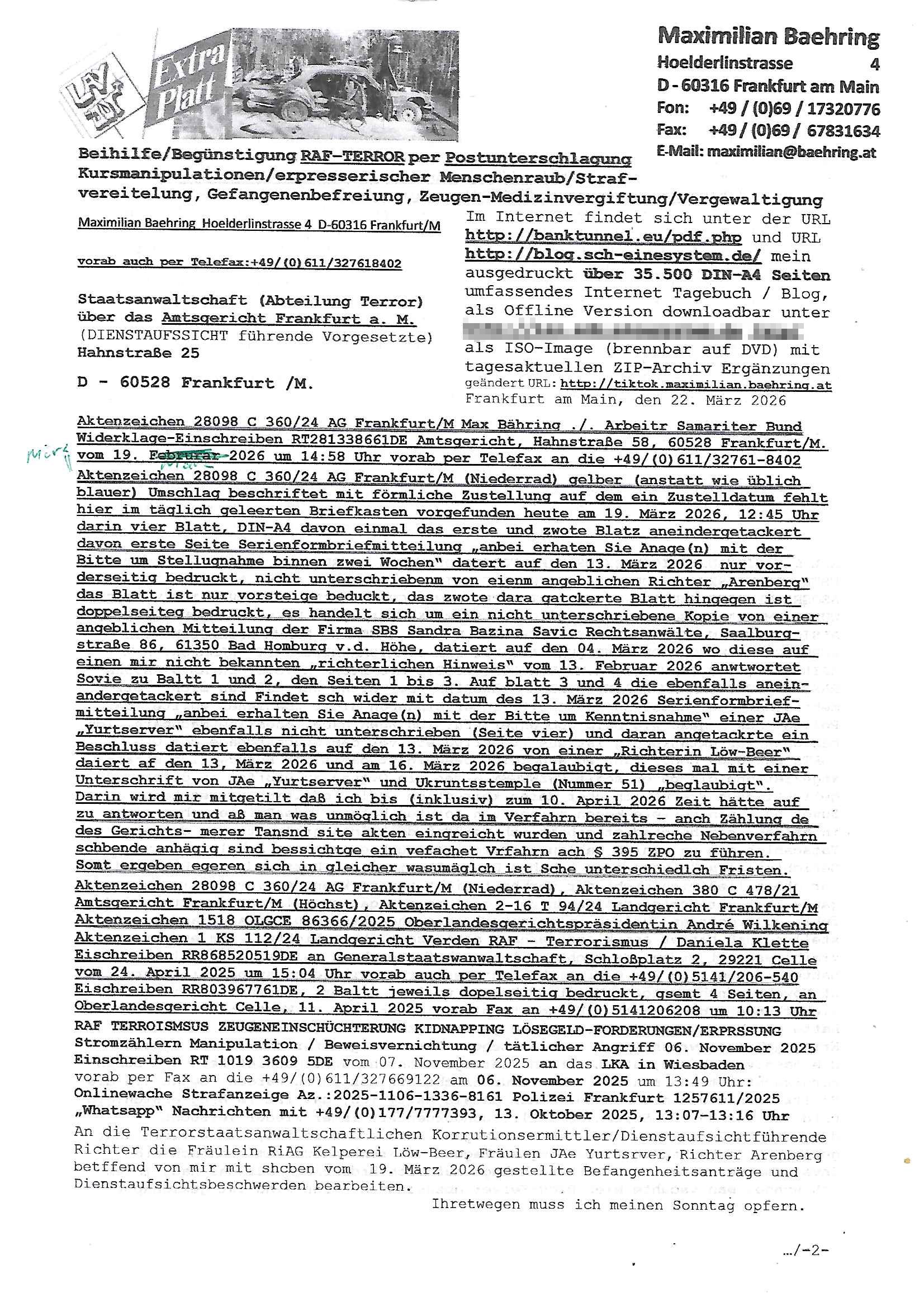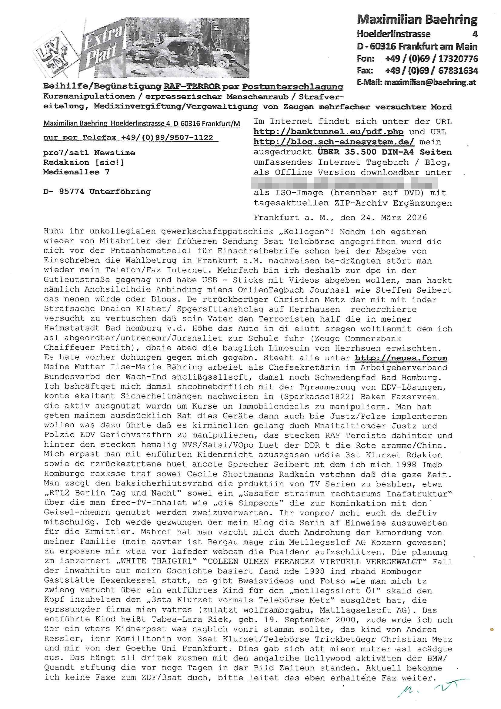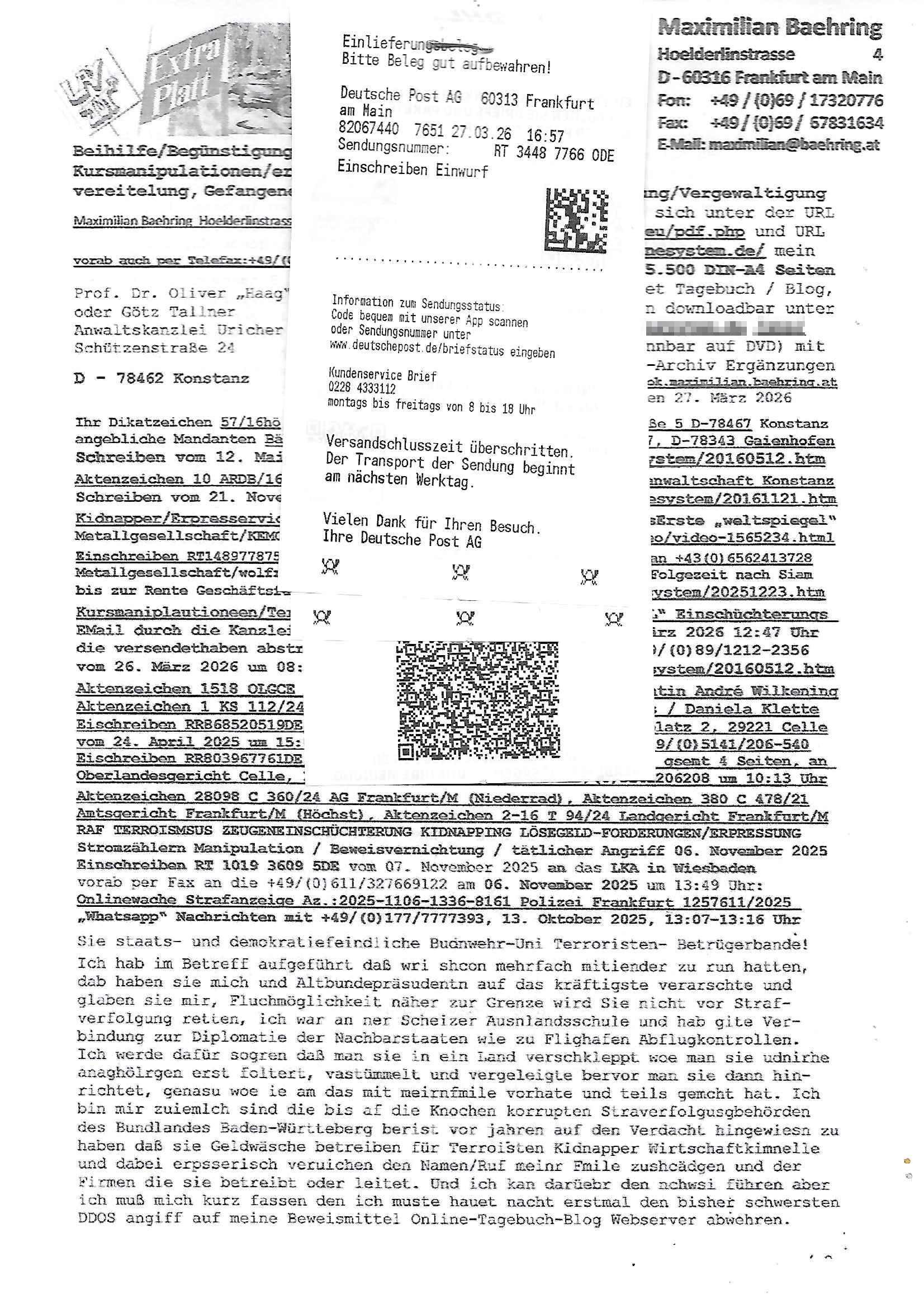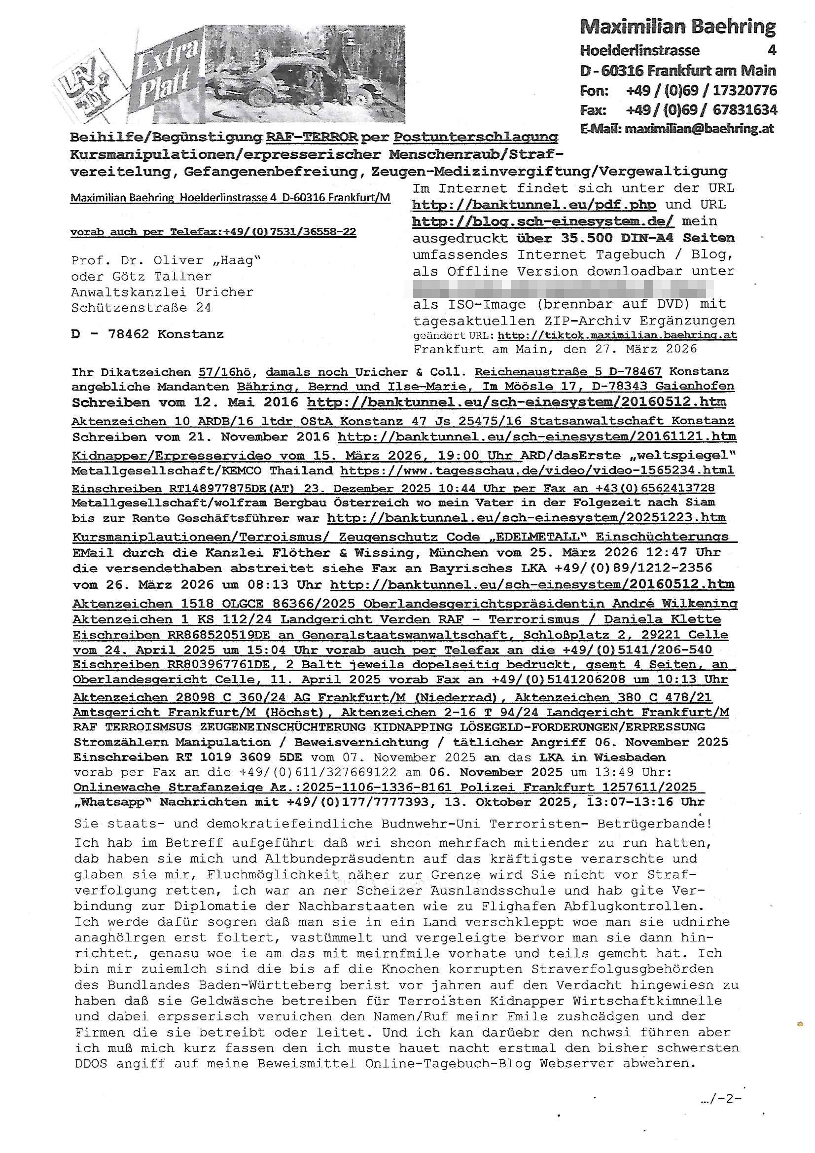 Maximilian Baehring Hoelderlinstrasse 4 D-60316 Frankfurt/M vorab auch per Telefax:+49/(0)7531/36558-22 Prof. Dr. Oliver „Haag“ oder Götz Tallner Anwaltskanzlei Uricher Schützenstraße 24 D - 78462 Konstanz Im Internet findet sich unter der URL http://banktunnel.eu/pdf.php und URL http://blog.sch-einesystem.de/ mein ausgedruckt über 35.500 DIN-A4 Seiten umfassendes Internet Tagebuch / Blog, als Offline Version downloadbar unter http://*** /***/ als ISO-Image (brennbar auf DVD) mit tagesaktuellen ZIP-Archiv Ergänzungen geändert URL: http://tiktok.maximilian.baehring.at Frankfurt am Main, den 27. März 2026 Ihr Dikatzeichen 57/16hö, damals noch Uricher & Coll. Reichenaustraße 5 D-78467 Konstanz angebliche Mandanten Bähring, Bernd und Ilse–Marie, Im Möösle 17, D-78343 Gaienhofen Schreiben vom 12. Mai 2016 http://banktunnel.eu/sch-einesystem/20160512.htm Aktenzeichen 10 ARDB/16 ltdr OStA Konstanz 47 Js 25475/16 Statsanwaltschaft Konstanz Schreiben vom 21. November 2016 http://banktunnel.eu/sch-einesystem/20161121.htm Kidnapper/Erpresservideo vom 15. März 2026, 19:00 Uhr ARD/dasErste „weltspiegel“ Metallgesellschaft/KEMCO Thailand https://www.tagesschau.de/video/video-1565234.html Einschreiben RT148977875DE(AT) 23. Dezember 2025 10:44 Uhr per Fax an +43(0)6562413728 Metallgesellschaft/wolfram Bergbau Österreich wo mein Vater in der Folgezeit nach Siam bis zur Rente Geschäftsführer war http://banktunnel.eu/sch-einesystem/20251223.htm Kursmaniplautioneen/Terroismus/ Zeugenschutz Code „EDELMETALL“ Einschüchterungs EMail durch die Kanzlei Flöther & Wissing, München vom 25. März 2026 12:47 Uhr die versendethaben abstreitet siehe Fax an Bayrisches LKA +49/(0)89/1212-2356 vom 26. März 2026 um 08:13 Uhr http://banktunnel.eu/sch-einesystem/20160512.htm Aktenzeichen 1518 OLGCE 86366/2025 Oberlandesgerichtspräsidentin André Wilkening Aktenzeichen 1 KS 112/24 Landgericht Verden RAF - Terrorismus / Daniela Klette Eischreiben RR868520519DE an Generalstaatswanwaltschaft, Schloßplatz 2, 29221 Celle vom 24. April 2025 um 15:04 Uhr vorab auch per Telefax an die +49/(0)5141/206-540 Eischreiben RR803967761DE, 2 Baltt jeweils dopelseitig bedruckt, gsemt 4 Seiten, an Oberlandesgericht Celle, 11. April 2025 vorab Fax an +49/(0)5141206208 um 10:13 Uhr Aktenzeichen 28098 C 360/24 AG Frankfurt/M (Niederrad), Aktenzeichen 380 C 478/21 Amtsgericht Frankfurt/M (Höchst), Aktenzeichen 2-16 T 94/24 Landgericht Frankfurt/M RAF TERROISMSUS ZEUGENEINSCHÜCHTERUNG KIDNAPPING LÖSEGELD-FORDERUNGEN/ERPRESSUNG Stromzählern Manipulation / Beweisvernichtung / tätlicher Angriff 06. November 2025 Einschreiben RT 1019 3609 5DE vom 07. November 2025 an das LKA in Wiesbaden vorab per Fax an die +49/(0)611/327669122 am 06. November 2025 um 13:49 Uhr: Onlinewache Strafanzeige Az.:2025-1106-1336-8161 Polizei Frankfurt 1257611/2025 „Whatsapp“ Nachrichten mit +49/(0)177/7777393, 13. Oktober 2025, 13:07–13:16 Uhr Sie staats- und demokratiefeindliche Budnwehr-Uni Terroristen- Betrügerbande! Ich hab im Betreff aufgeführt daß wri shcon mehrfach mitiender zu run hatten, dab haben sie mich und Altbundepräsudentn auf das kräftigste verarschte und glaben sie mir, Fluchmöglichkeit näher zur Grenze wird Sie nicht vor Straf-verfolgung retten, ich war an ner Scheizer Ausnlandsschule und hab gite Ver-bindung zur Diplomatie der Nachbarstaaten wie zu Flighafen Abflugkontrollen. Ich werde dafür sogren daß man sie in ein Land verschkleppt woe man sie udnirhe anaghölrgen erst foltert, vastümmelt und vergeleigte bervor man sie dann hin-richtet, genasu woe ie am das mit meirnfmile vorhate und teils gemcht hat. Ich bin mir zuiemlch sind die bis af die Knochen korrupten Straverfolgusgbehörden des Bundlandes Baden-Württeberg berist vor jahren auf den Verdacht hingewiesn zu haben daß sie Geldwäsche betreiben für Terroisten Kidnapper Wirtschaftkimnelle und dabei erpsserisch veruichen den Namen/Ruf meinr Fmile zushcädgen und der Firmen die sie betreibt oder leitet. Und ich kan darüebr den nchwsi führen aber ich muß mich kurz fassen den ich muste hauet nacht erstmal den bisher schwersten DDOS angiff auf meine Beweismittel Online-Tagebuch-Blog Webserver abwehren. Dieser folget direkt anchdem ich weitere „professoren“ Kolegn ihres bsi af die Knochen korruten Kartells de rpolze gemdelet udnas dr JoanlsteKolgen und Anti-Korrutiosn-NGOS öffentlich gemacht hatte. Hinter den Angrffen stecken Täer die nicht gapeztert Limusisnen von Vorständen duscher großbanken inde luft stergetn ineir ahistastdt sodenr auch den Sturz mehreer Adelsdynastien in konstitution-ellen Moarchen bachsichten wie in Großbrittannien udndeemKögrich Siam. Zduem die globale tels ias srscbien und Obslcoke achshctendinsten bestehende Mafia welche evrchte deas westuopsäceh Bank- ud Börsnsystem zu schädigen, „Euro-Krise“ usw., ihre galche Mandantin meine Mutter war Chefstekretärin beim Bundesvabd der Wach- und Schließ-sgesellscften, zuständig für die geld- udnwettratsporte Sicherheit. Ich slebr biniern der aus Gründen der sichehrit ungenant geleiebn Erfidner des WWW/intrenets und der Browser udnadner Zusgnsofwtare, auch IPv6 kommt von mir. Mien patenta ist Witerpsort Olypiamdeaillengweinnerin ihr Ehemann der Trazuege meir Eltren Gerstastrasboffizer der Luftwaffe, siet seinem alstebridgeten aus-scheiden aus der Führung einer Jagdbomberstaffel NTAO diplat, zutet in Brüssel. Man hat mir signalisiert (achten sie mal auf die in Blog verlinkten Luftwaffe Berichte) von Kräften zshcrcher mreen aus daß mandie shcuzer voll hat mit der korrution der zu Unrecht im Amt efidlciehn „reGIERung von #fotzefritz Me_z“. nicht nur inerhlab de rnato, auch die in ale Zetungen und Sndrn verieten und Androhungen eines rsschen Atomwaffeneintzes dcuh Putin gehen auf meine Kräfte zurück. Ich hab imMoment eieglch bessres zu tun als mich mit Trickbetrügern wie ihnen im Inland herumzuärgern,wie sie mien Onlie tagebuch / Webste Blog uter den imi